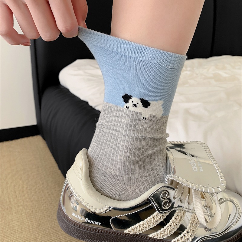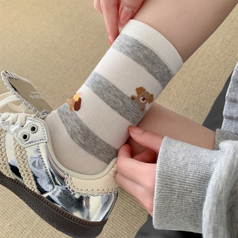 만화 양말 여성의 뼈없는 중간 길이 양말 Ins 일본 스타일 귀여운 색상 블록 줄무늬 강아지 대학 스타일 순수한 면화 스타킹스토어 가기