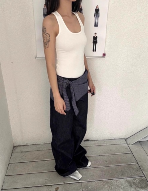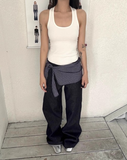 틈새 디자인 스택 가짜 2 피스 스트레이트 청바지 여성용 스프링 스퀘어 스퀘어 플레이드 스트랩 루즈 모 롱 바지스토어 가기