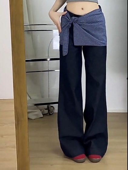 틈새 디자인 스택 가짜 2 피스 스트레이트 청바지 여성용 스프링 스퀘어 스퀘어 플레이드 스트랩 루즈 모 롱 바지