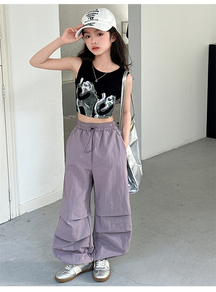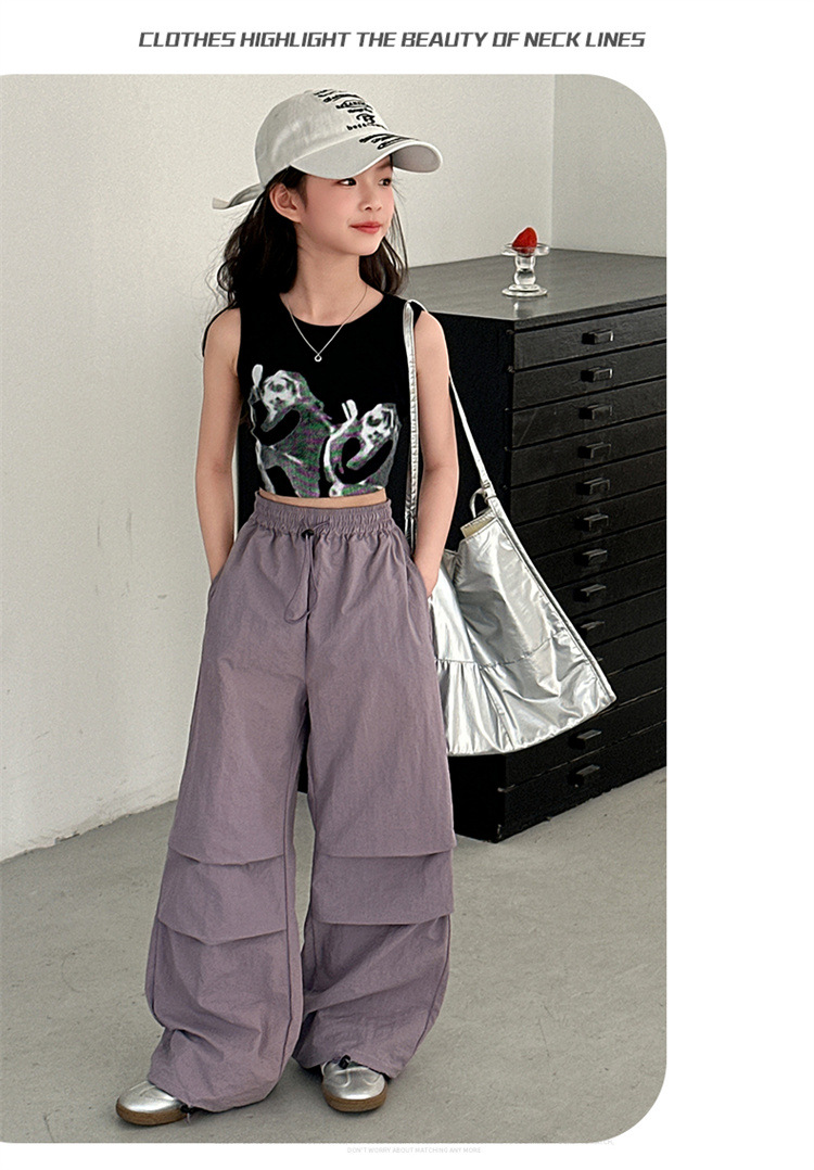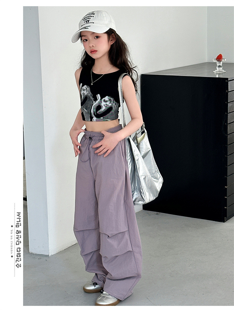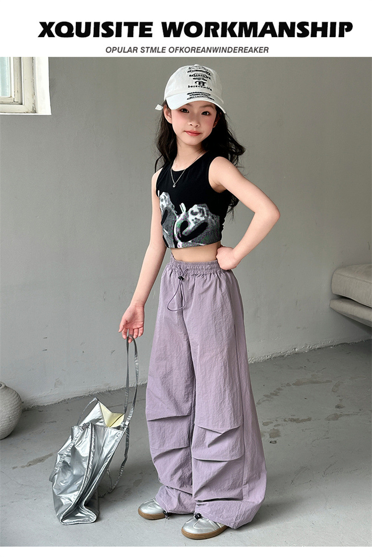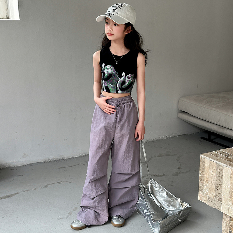 소녀 바지 2025 여름 새로운 큐크 어린이 빠른 건조 와이드 레그 팬츠 조끼 트렌디 한 쿨웨어 투피스 세트