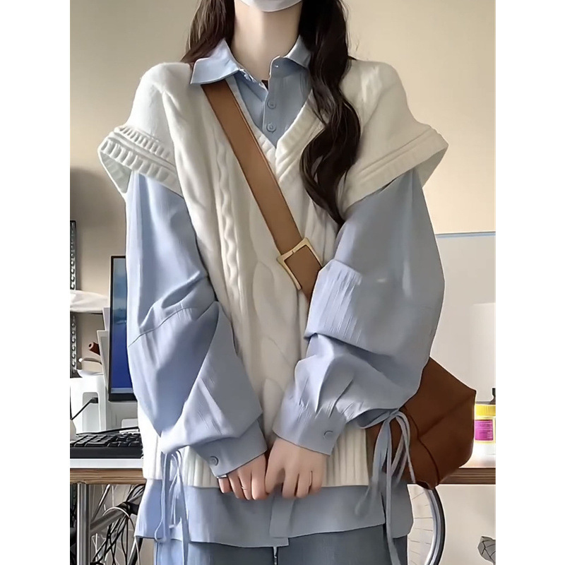 캐주얼 스태킹 2 피스 세트 긴팔 셔츠 아카데미 스타일 여성용 스위트 칼라 트위스트 니트 스웨터 조끼