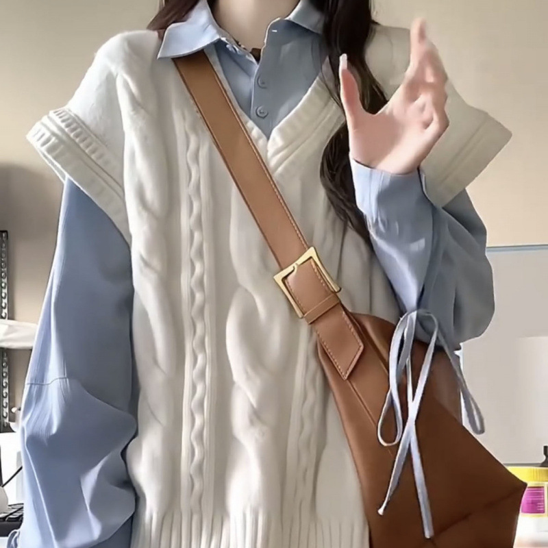 캐주얼 스태킹 2 피스 세트 긴팔 셔츠 아카데미 스타일 여성용 스위트 칼라 트위스트 니트 스웨터 조끼스토어 가기