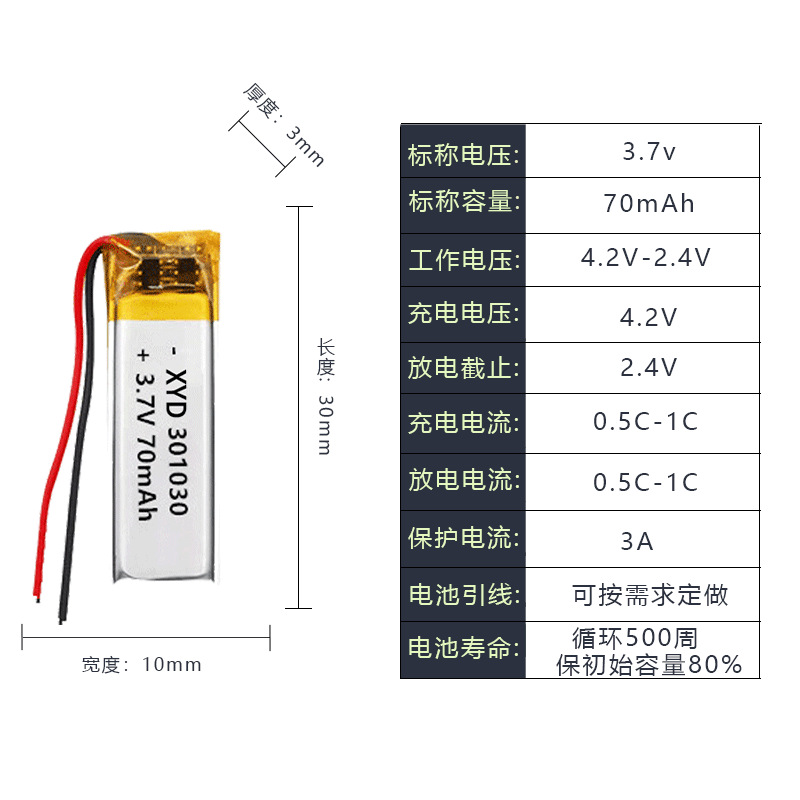 배터리 301030 폴리머 리튬 배터리 70mAh 블루투스 리튬 배터리 충전식 배터리 제조업체 고온 저항 3.7V스토어 가기