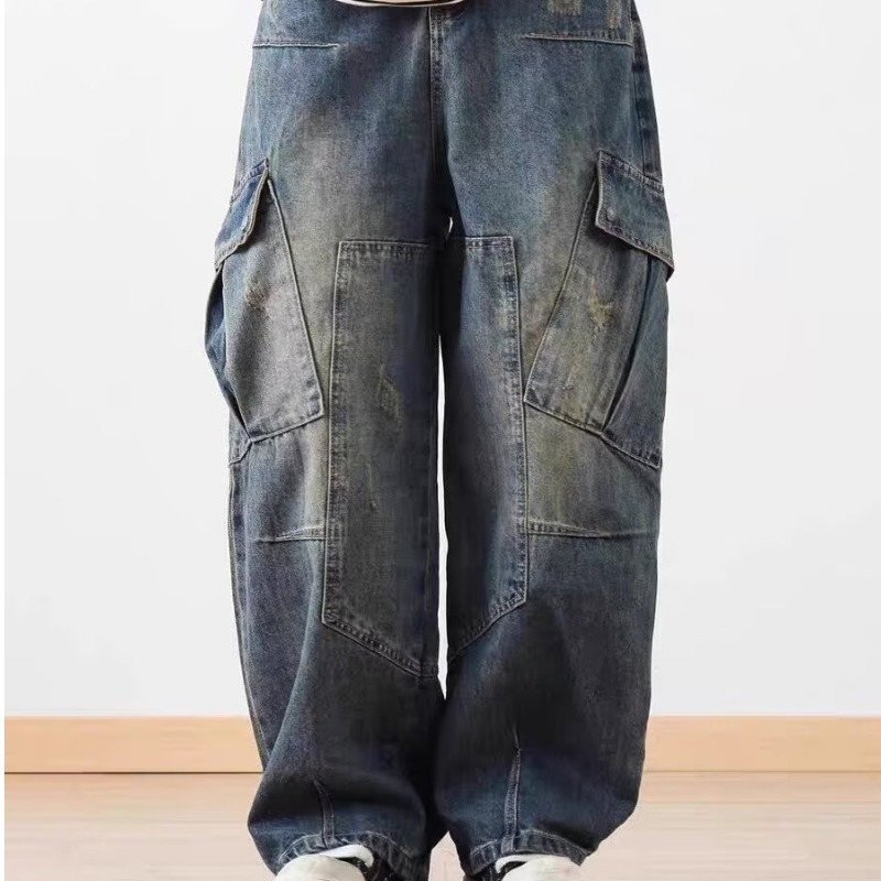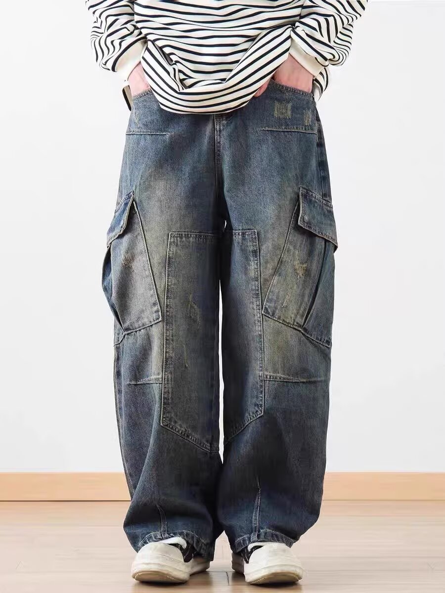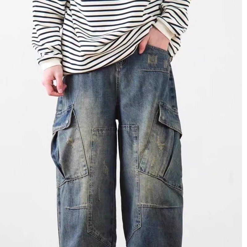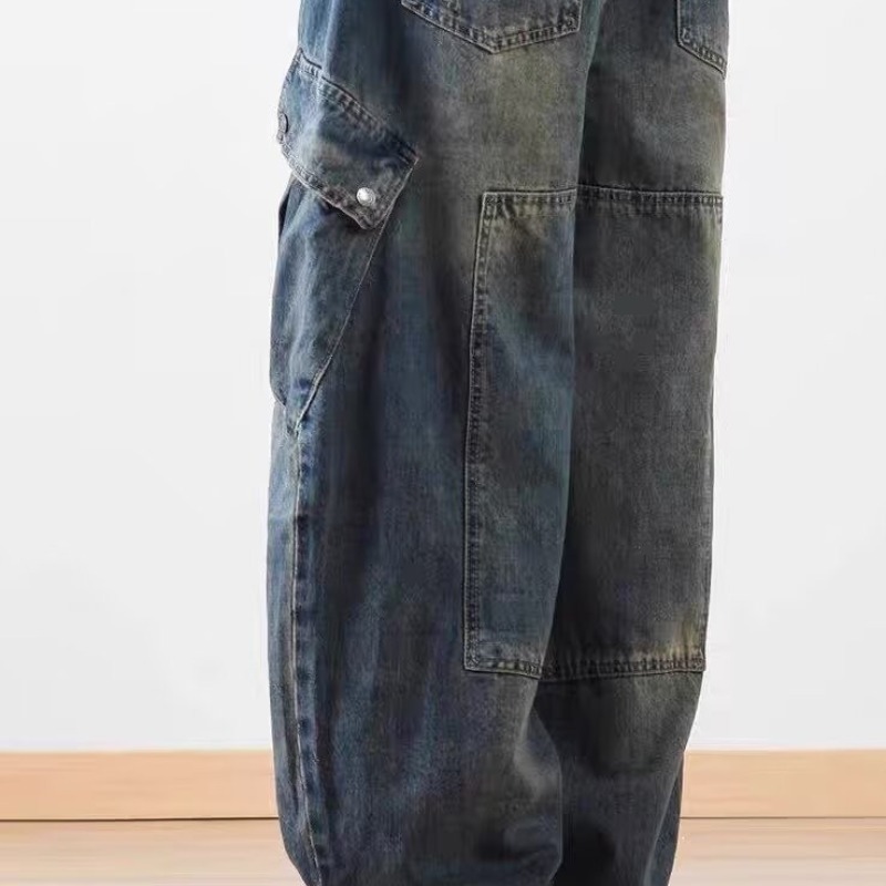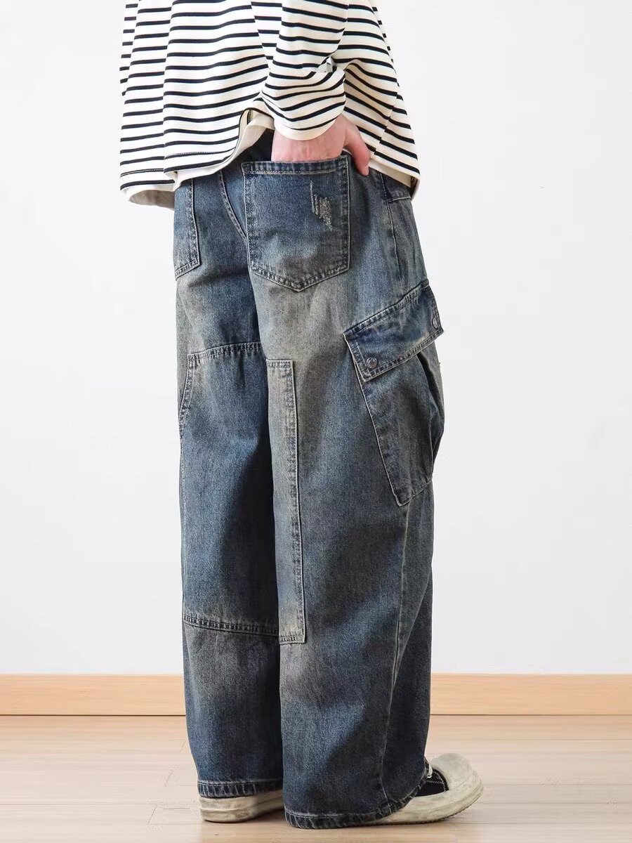 2025 레트로 헤비 세탁 멀티 포켓 올드 시미 타르 데님 하이 스트리트 와이드 레그 멀티 백 바지 남성용 올 매치 바지스토어 가기