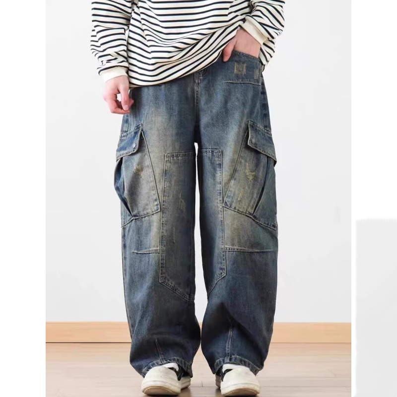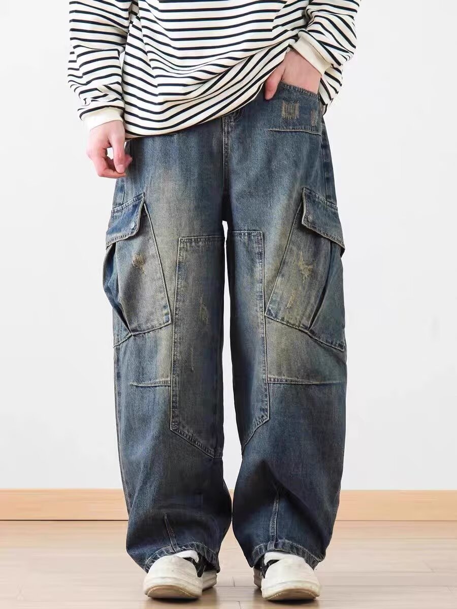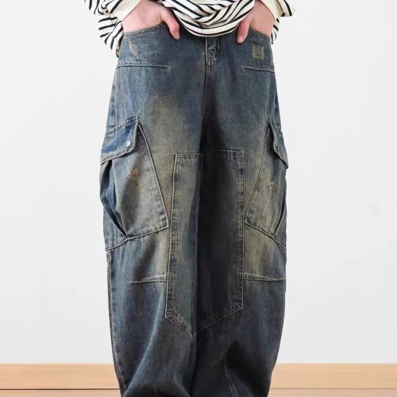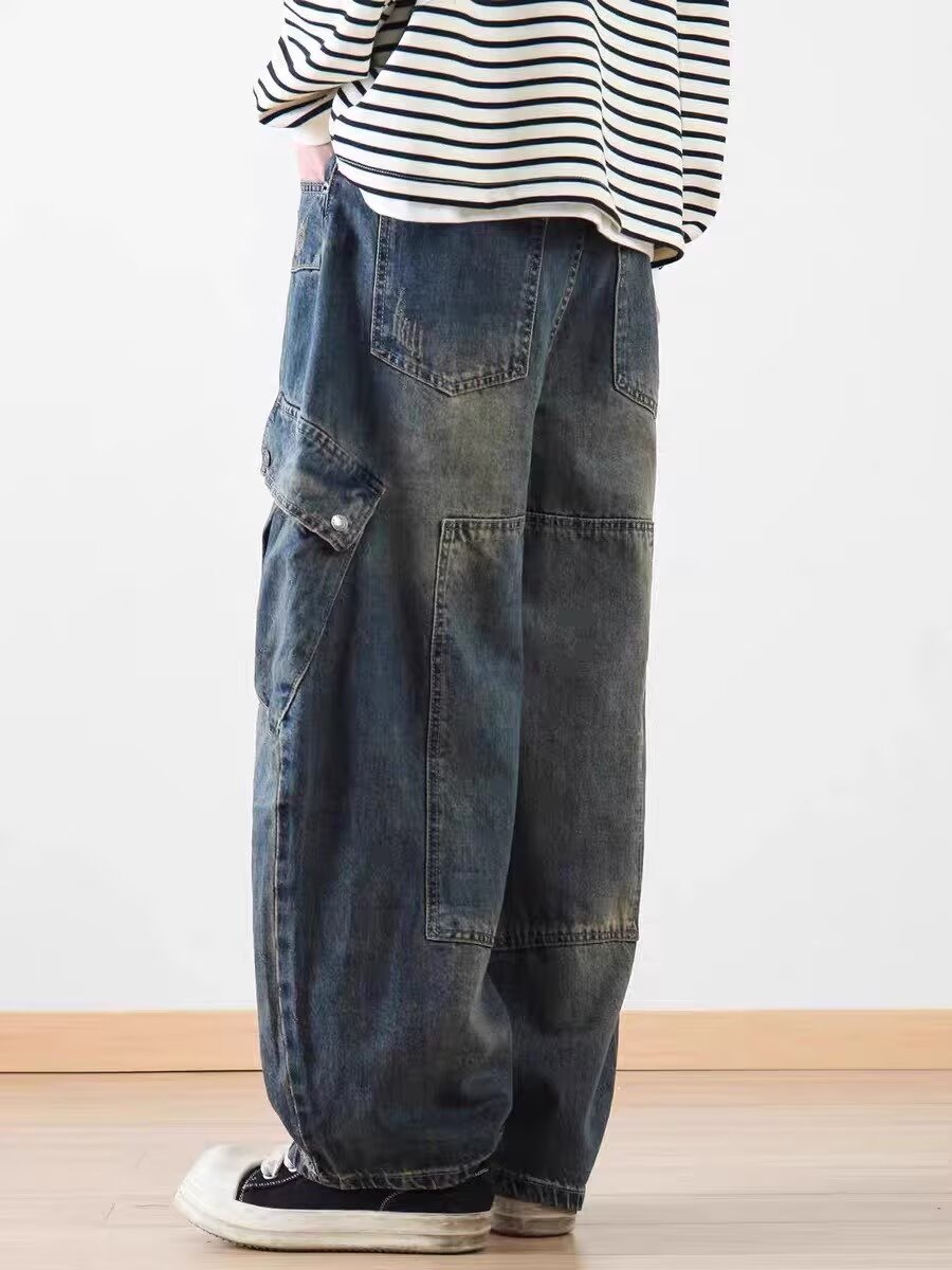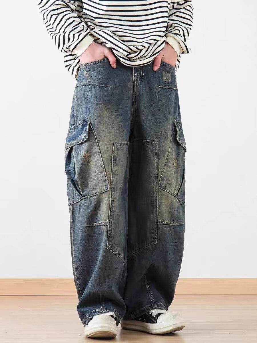 2025 레트로 헤비 세탁 멀티 포켓 올드 시미 타르 데님 하이 스트리트 와이드 레그 멀티 백 바지 남성용 올 매치 바지스토어 가기