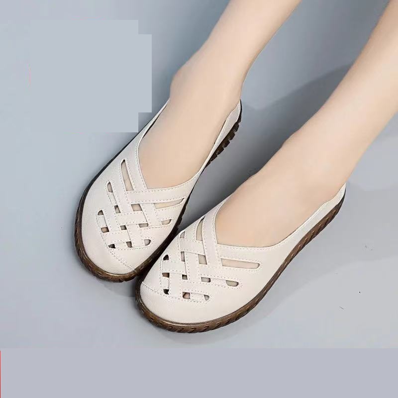 부드러운 가죽 쇠고기 단독 구멍 신발 여성 여름 캐주얼 소프트 솔 어머니 신발 할로우 통기성 올 매치 로우 힐 슬립 온 샌들