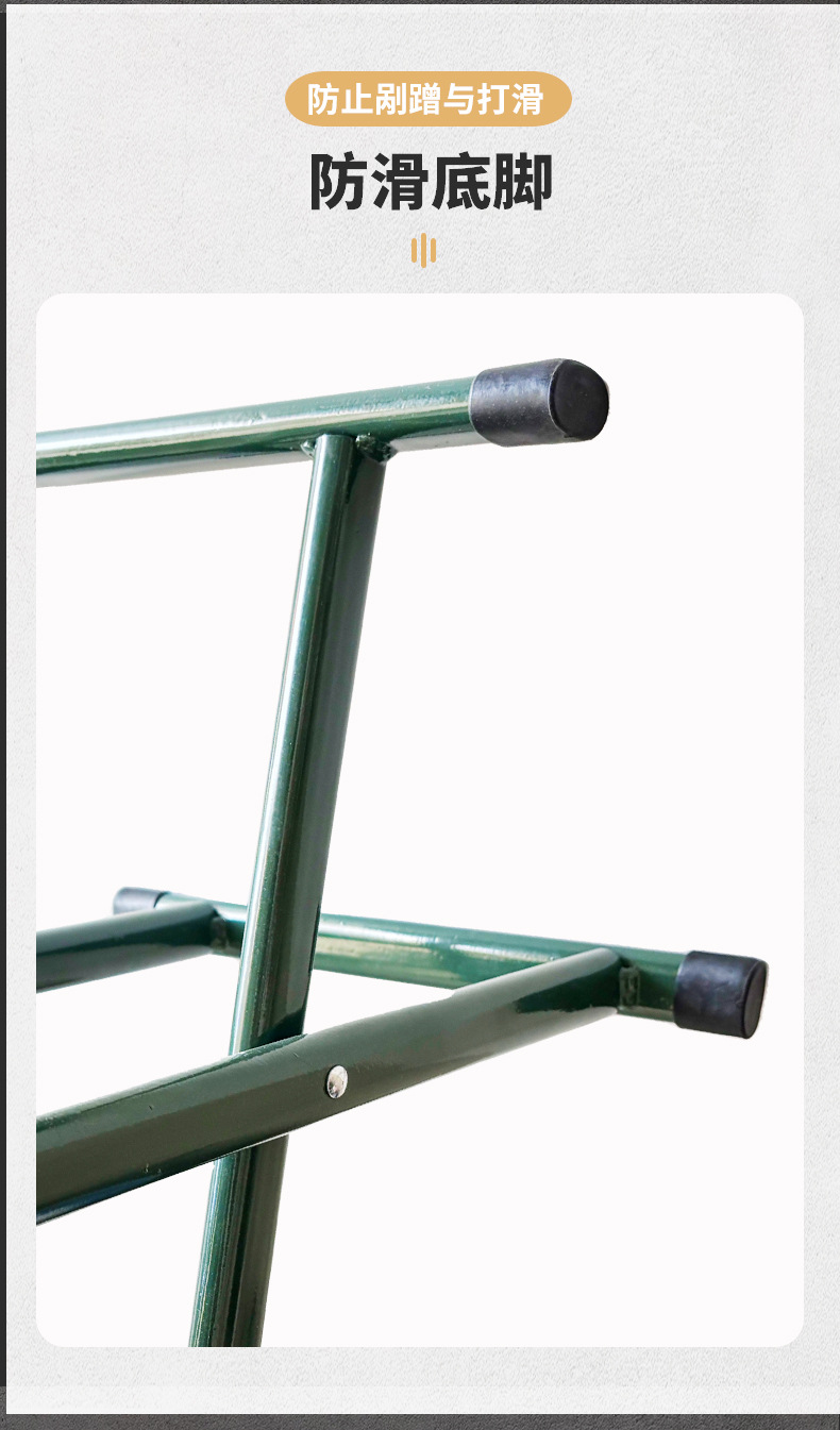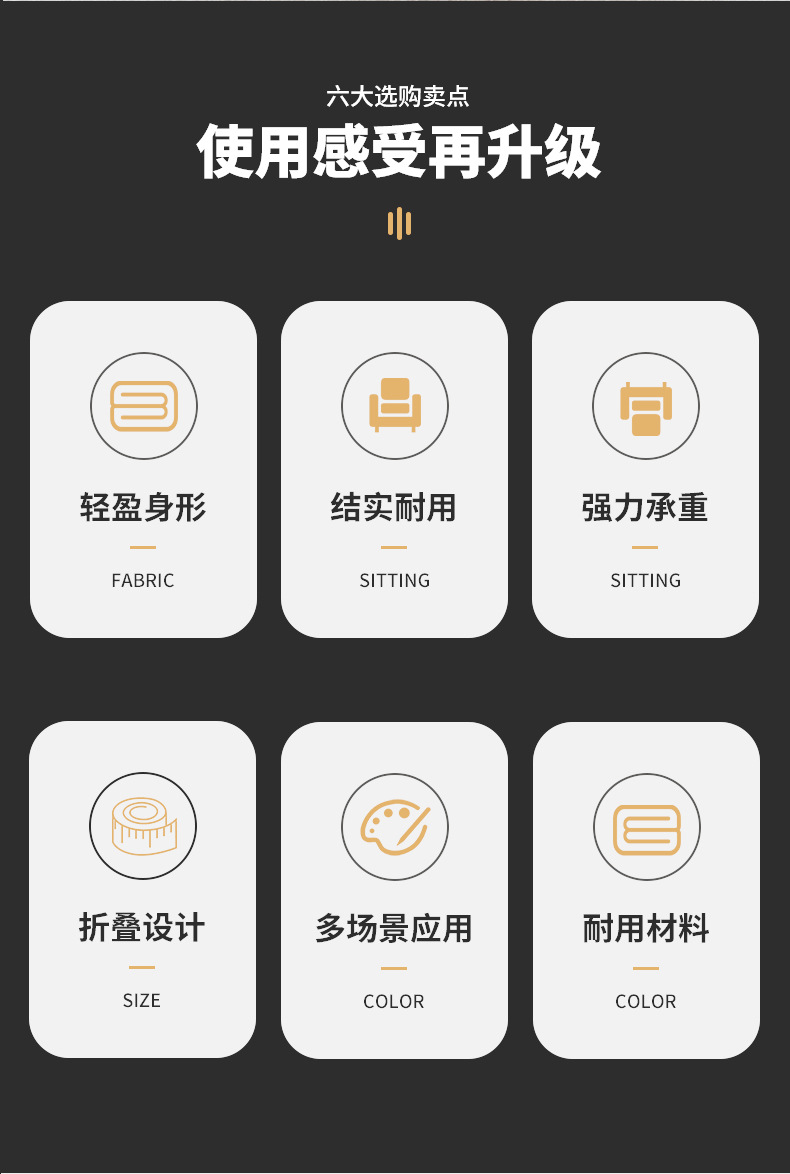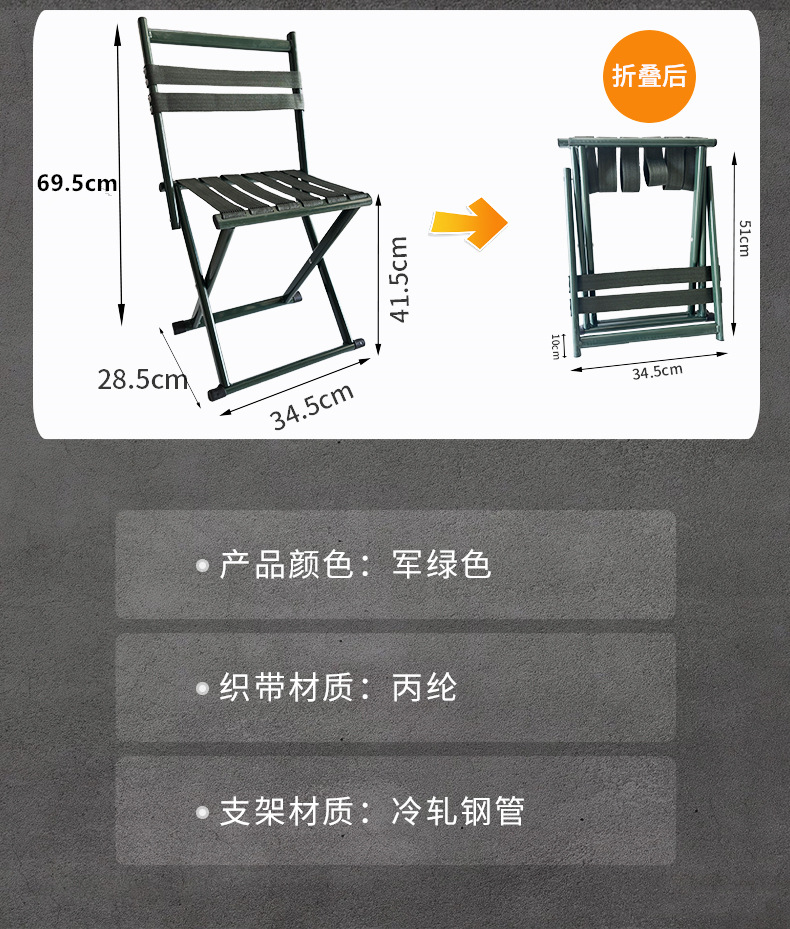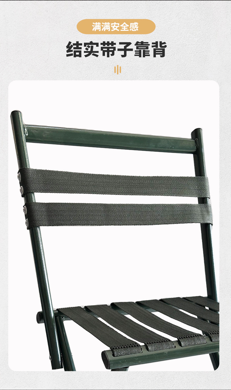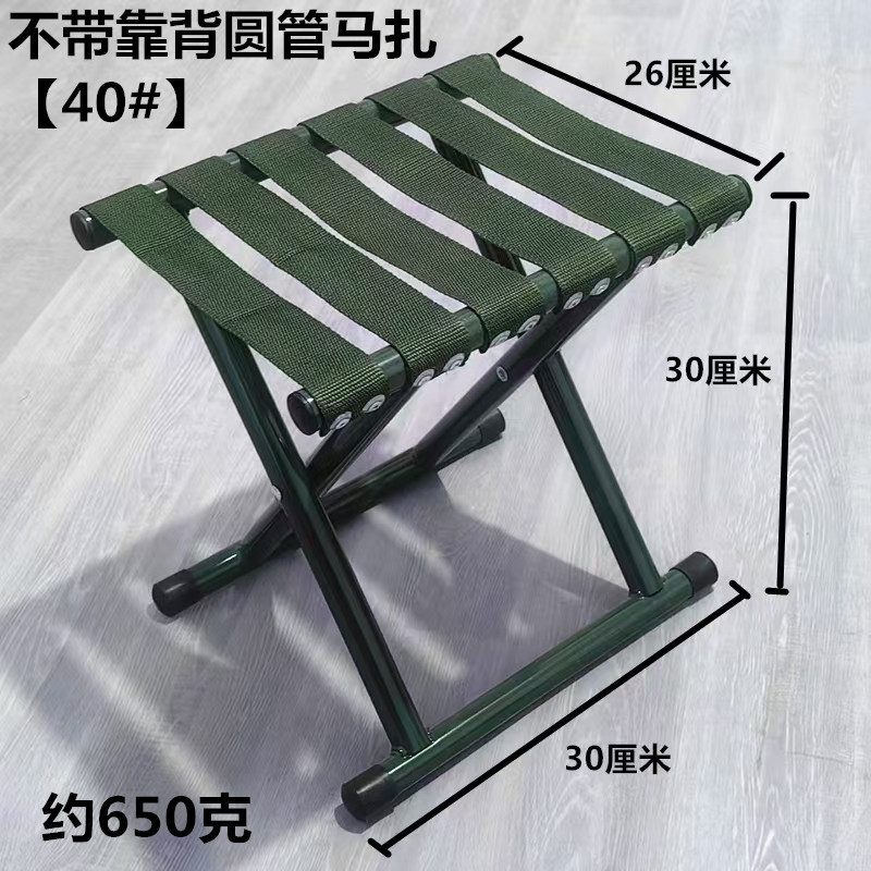 本款扁管折叠马扎有带靠背和不带靠背两种,冷轧扁管壁厚约为0.5毫米,丙纶加厚织带,铆钉固定,点焊工艺,防滑胶套,其中圆管不带靠背重量约为650克,扁管不带靠背单个重量约为800克,扁管中号带靠背重量约为1100克,扁管大号带靠背重量约为1200克。