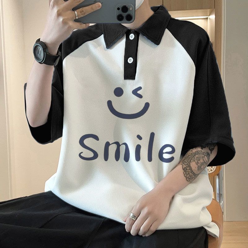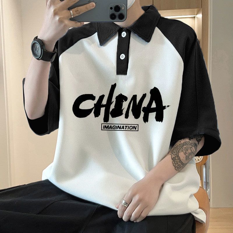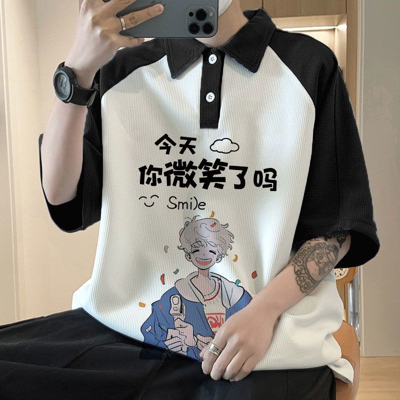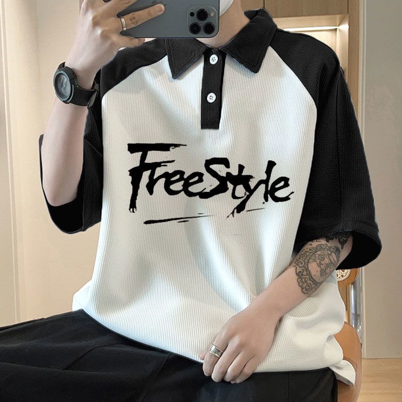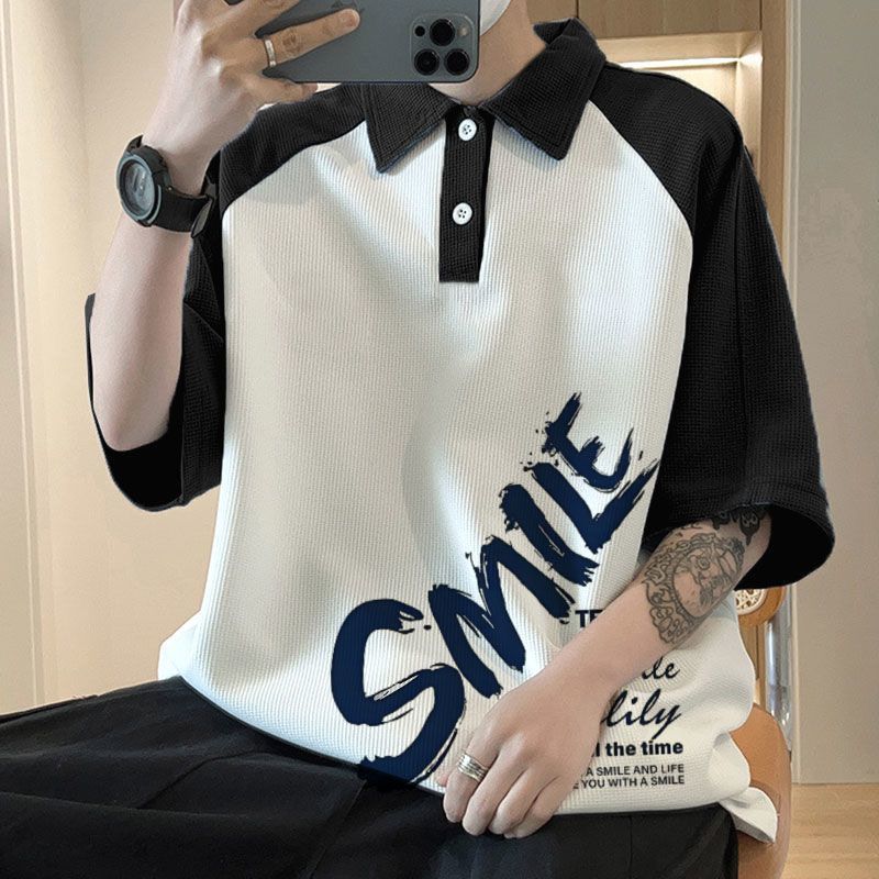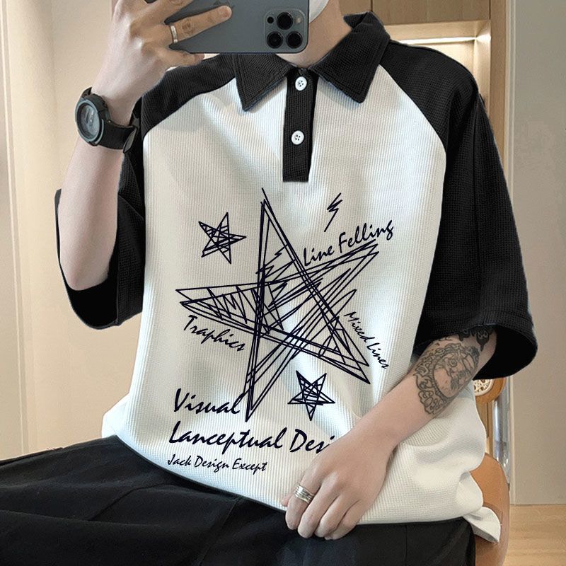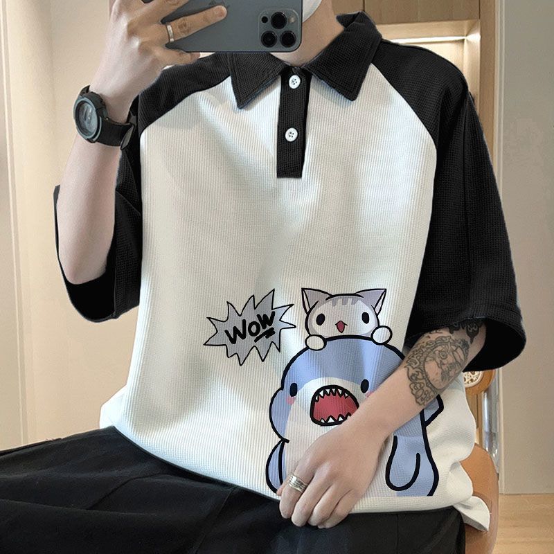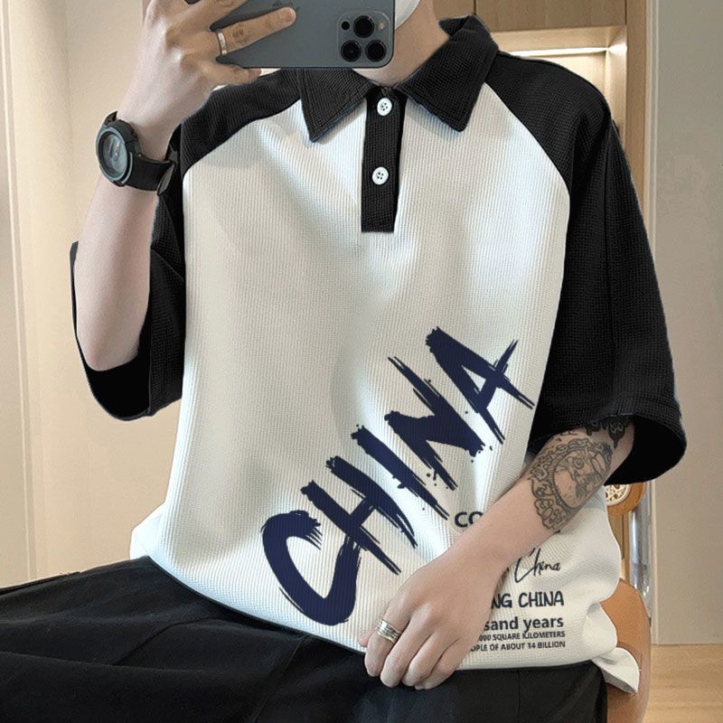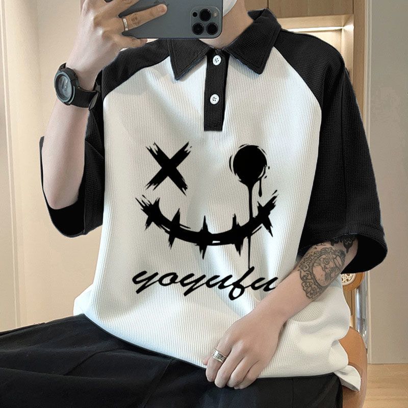 와플 셔츠 반팔 셔츠 남성 학생 대조 홍콩 패션 핸섬 인쇄 캐주얼 칼라 탑