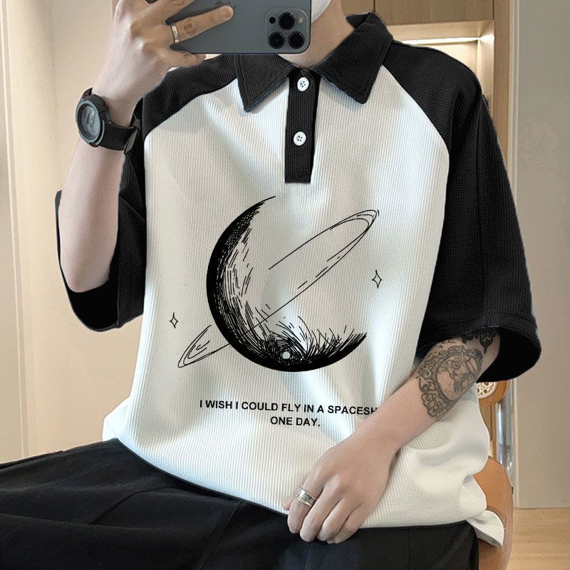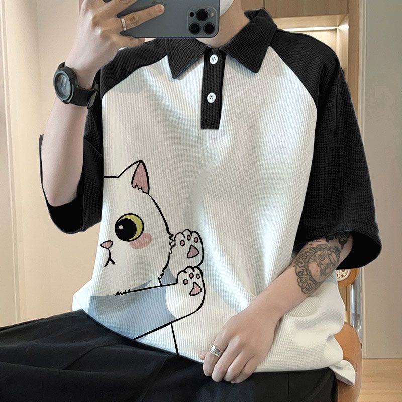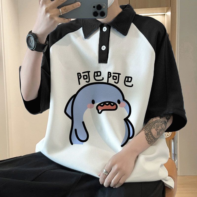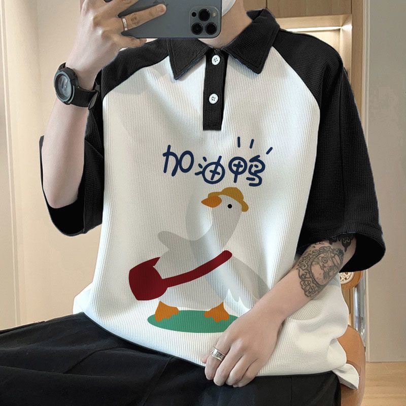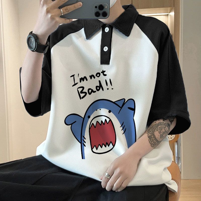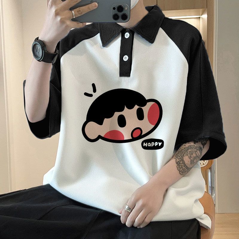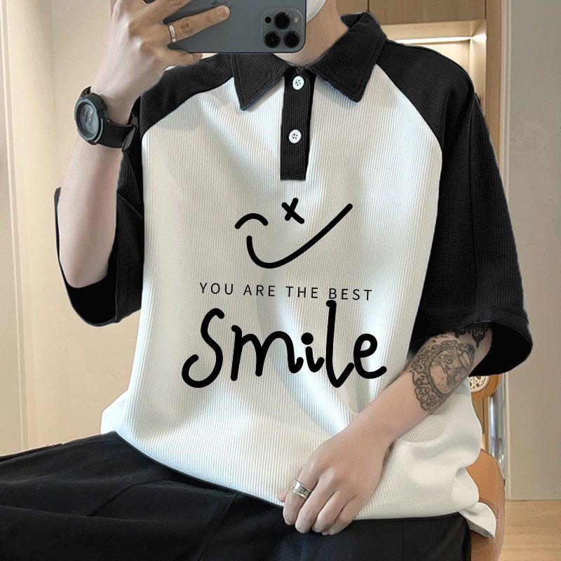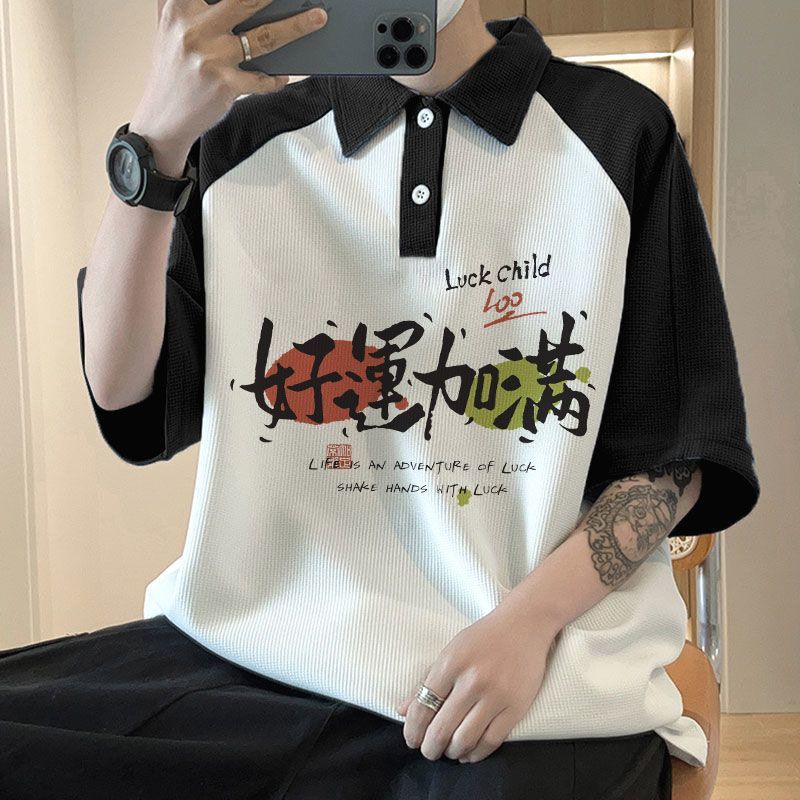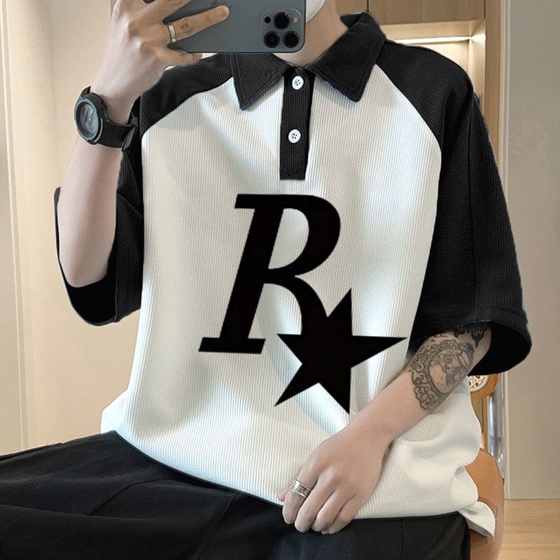 와플 셔츠 반팔 셔츠 남성 학생 대조 홍콩 패션 핸섬 인쇄 캐주얼 칼라 탑