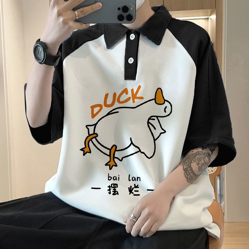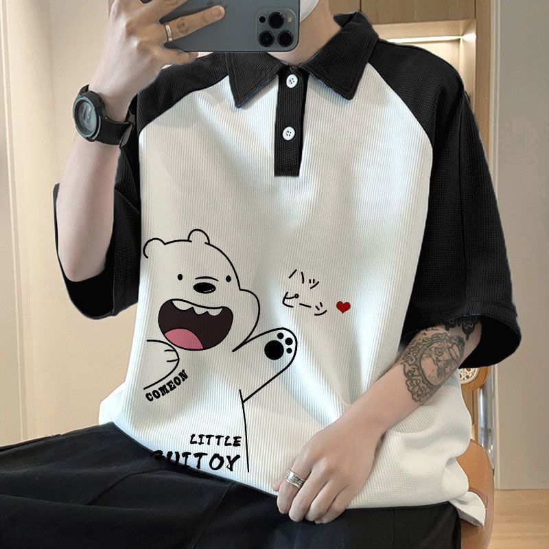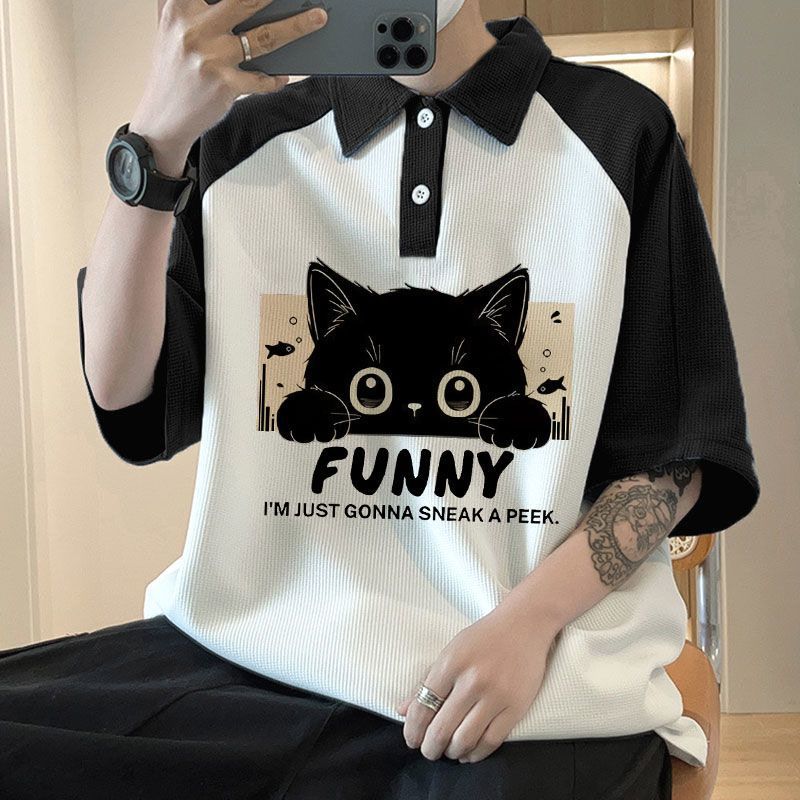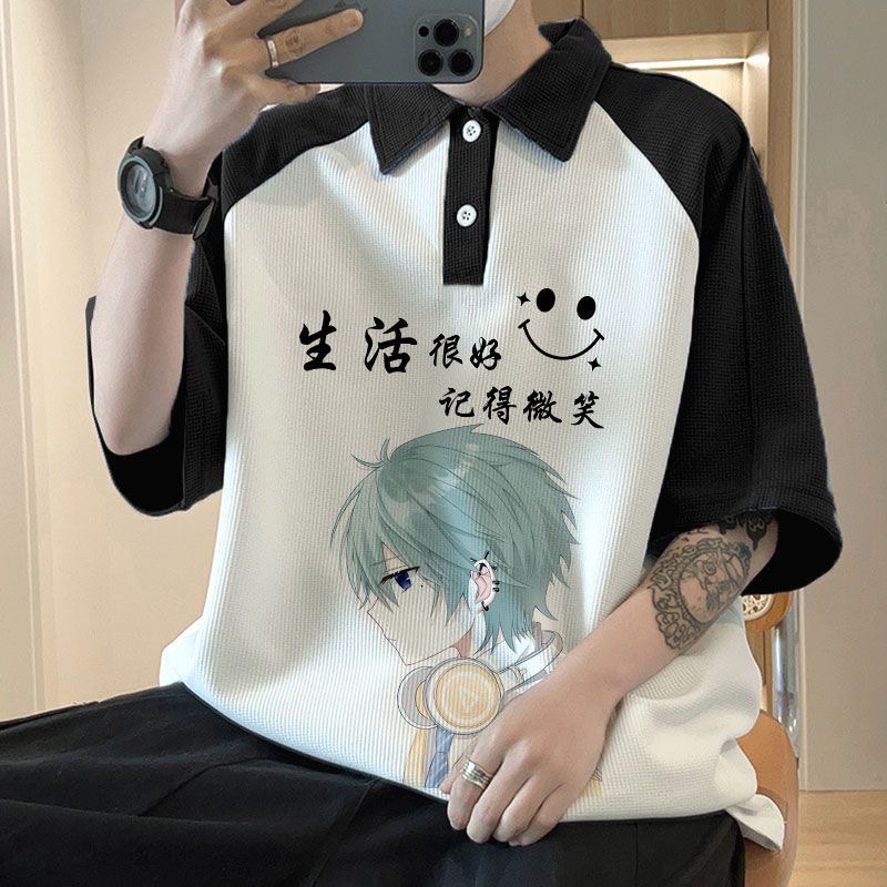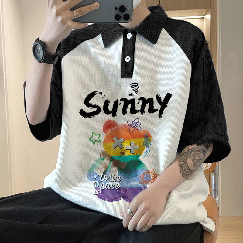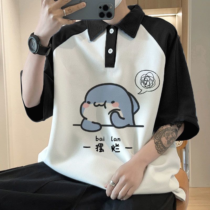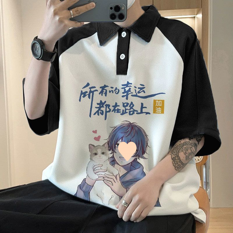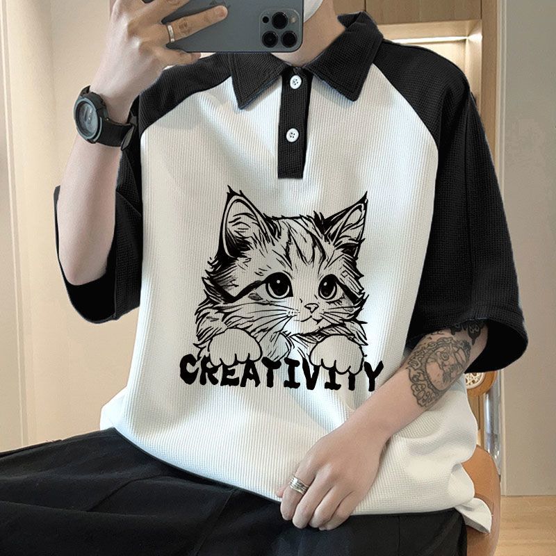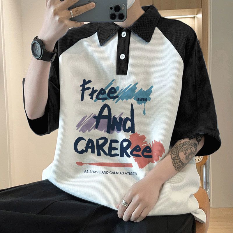 와플 셔츠 반팔 셔츠 남성 학생 대조 홍콩 패션 핸섬 인쇄 캐주얼 칼라 탑