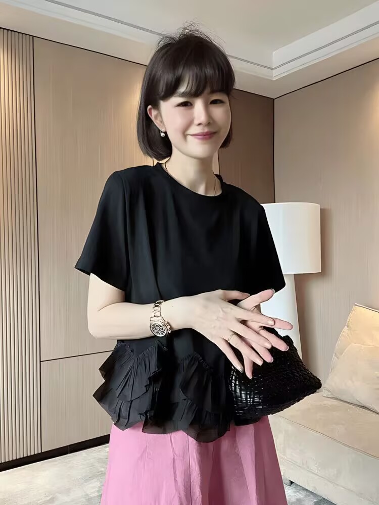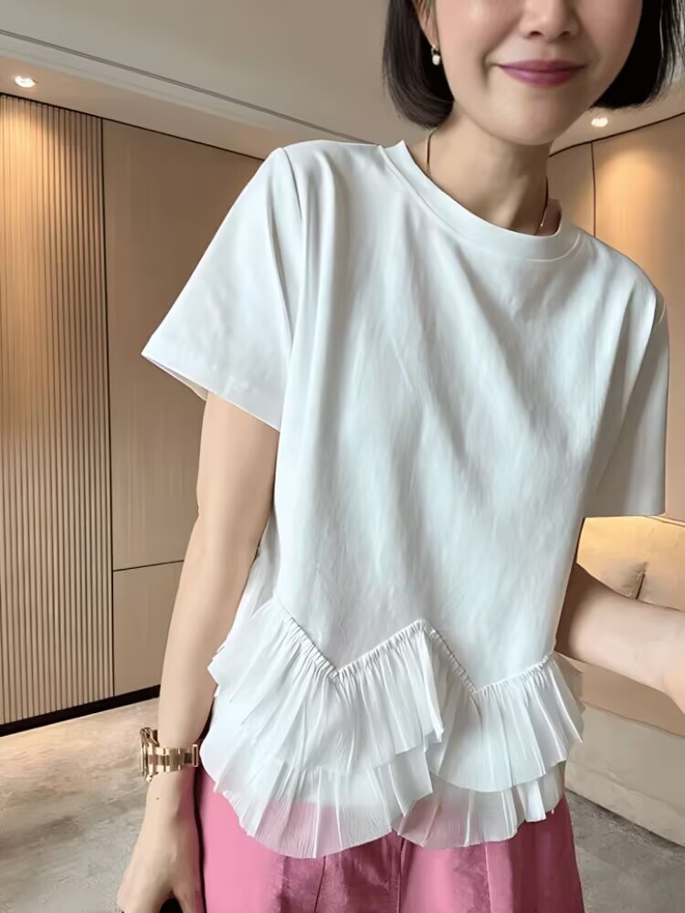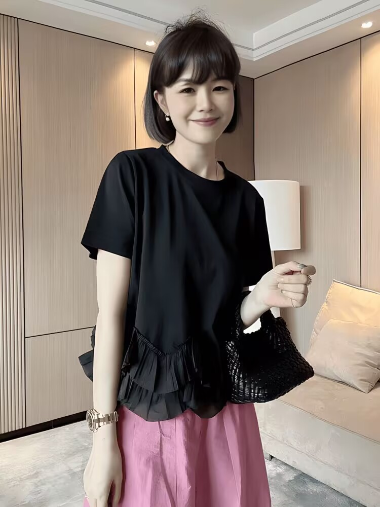 공장 직판 스플라이스 러플 숄더 티셔츠 여성용 봄 여름 슬림핏 이너웨어 빈티지 스타일 반팔스토어 가기