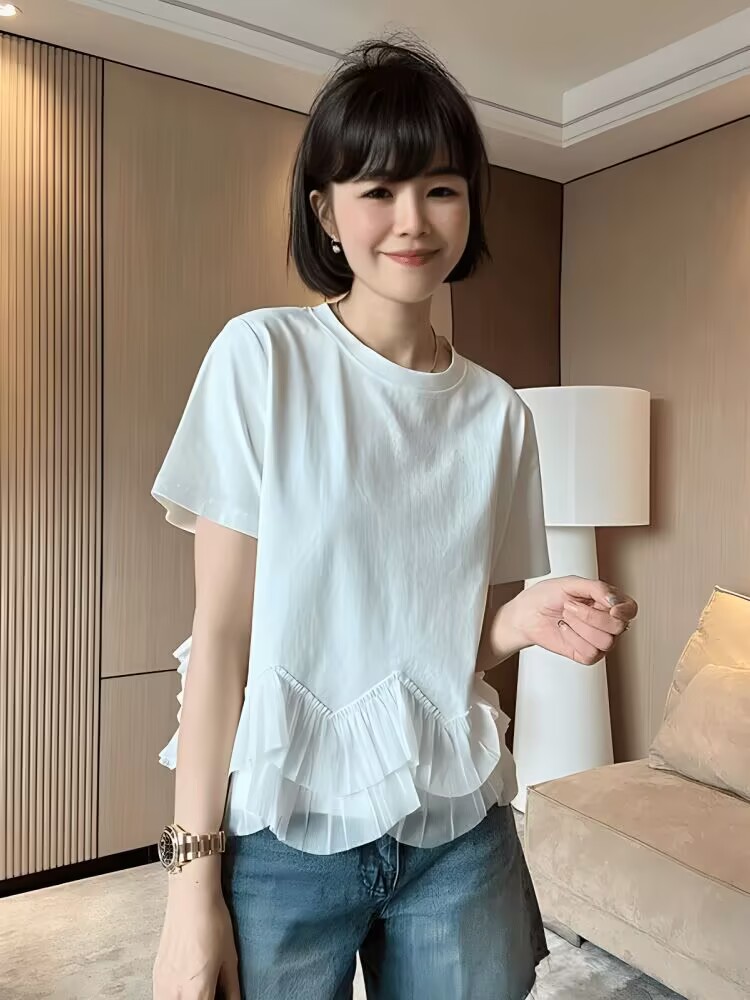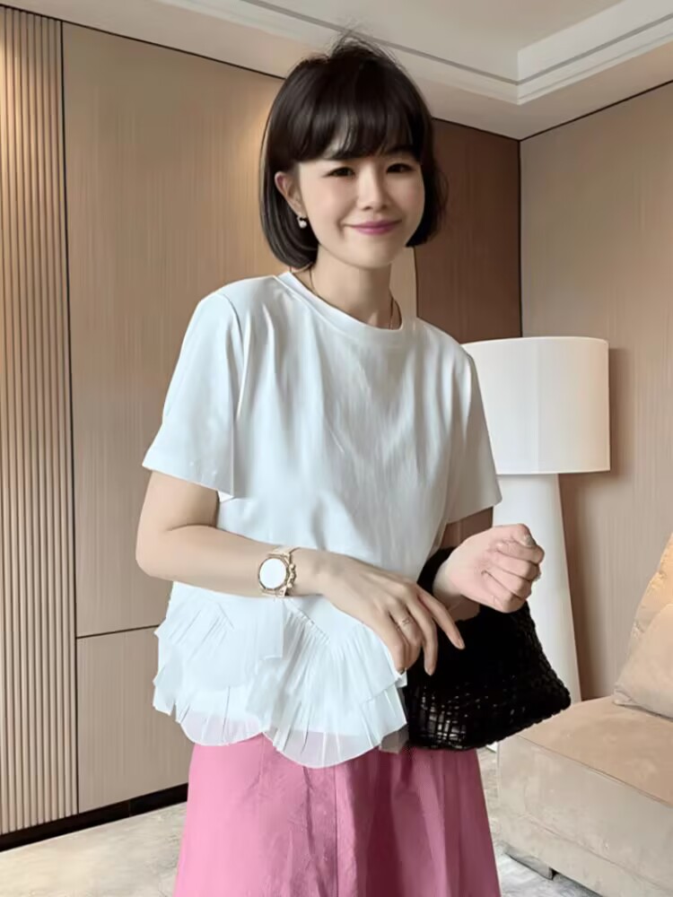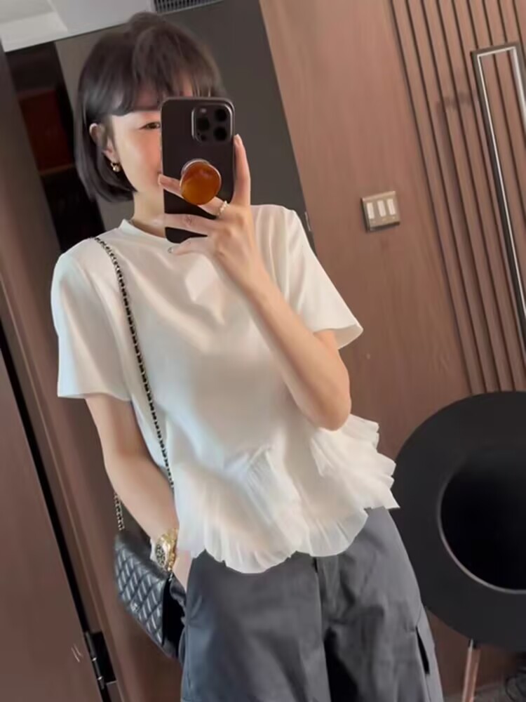 공장 직판 스플라이스 러플 숄더 티셔츠 여성용 봄 여름 슬림핏 이너웨어 빈티지 스타일 반팔