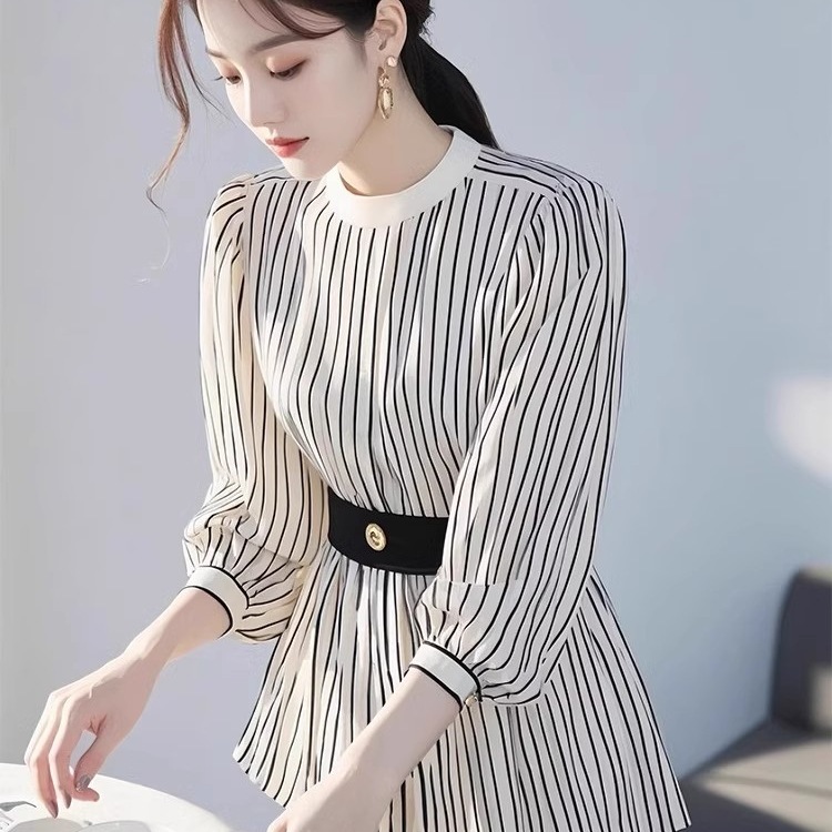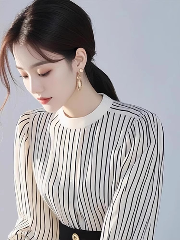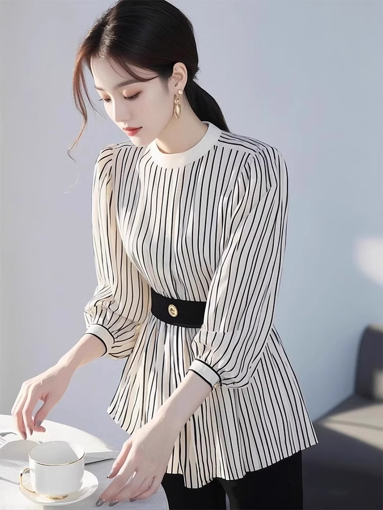 봄 2025 새로운 프랑스 디자인 감각 높은 통근 기질 빛 성숙한 스타일 흑백 줄무늬 허리 셔츠스토어 가기