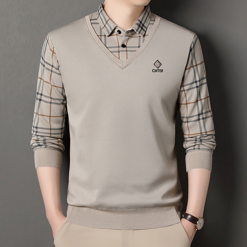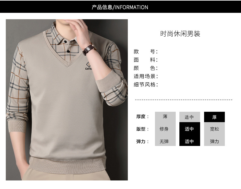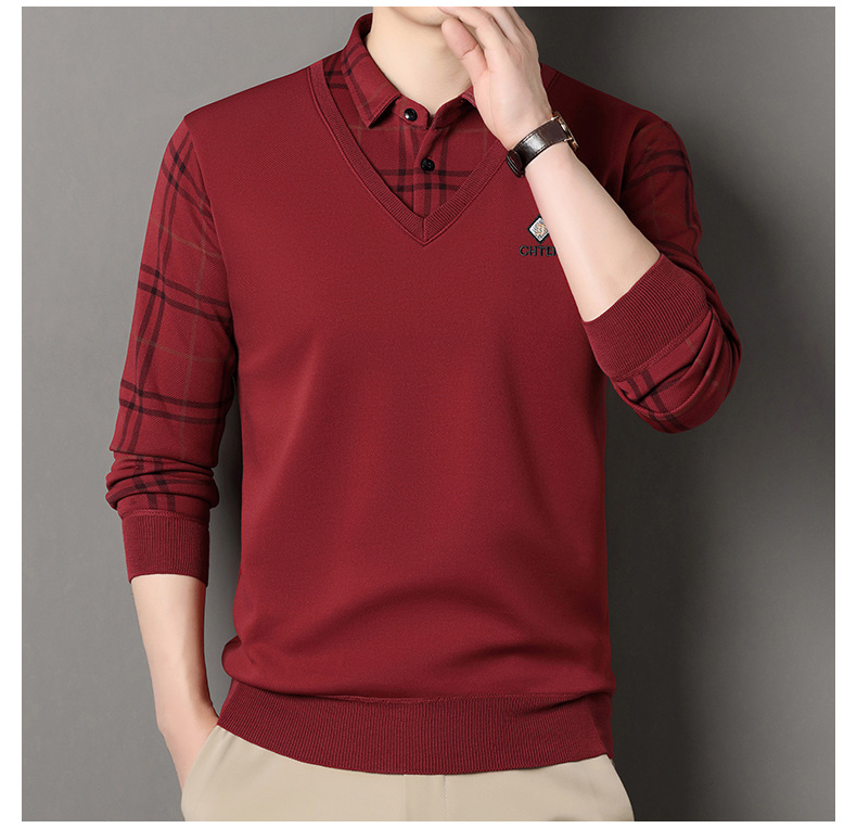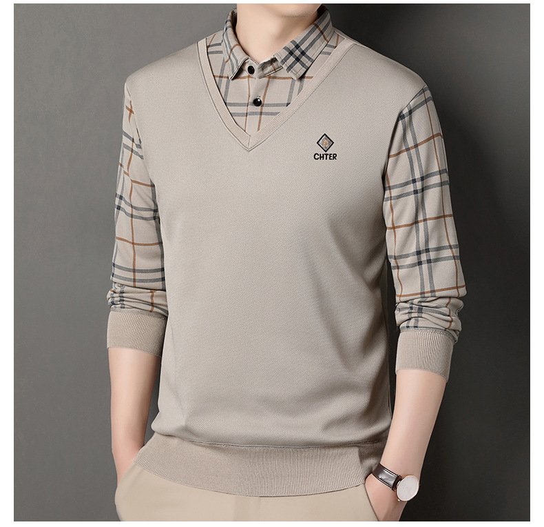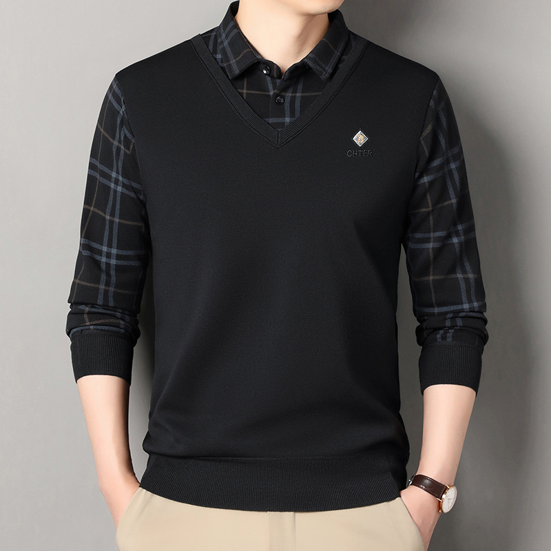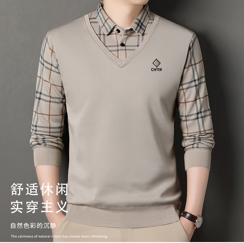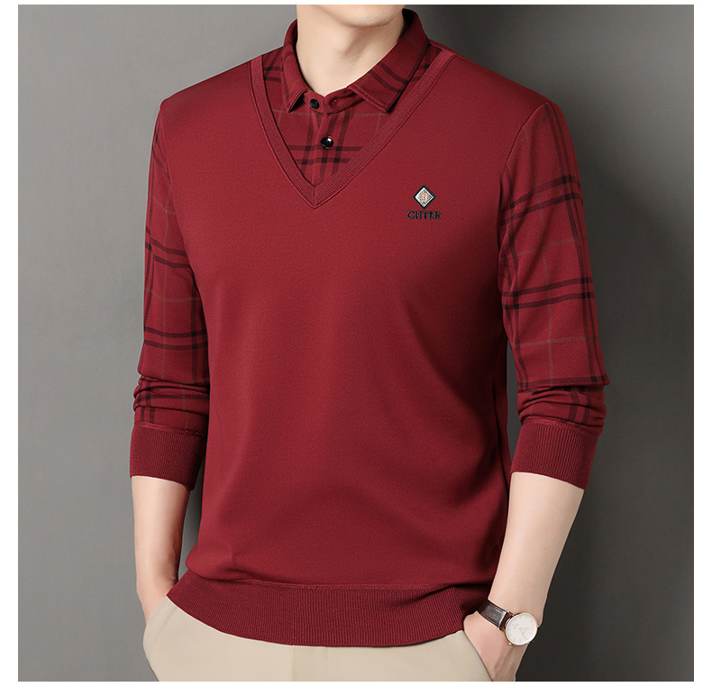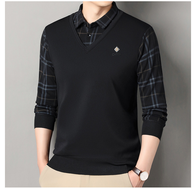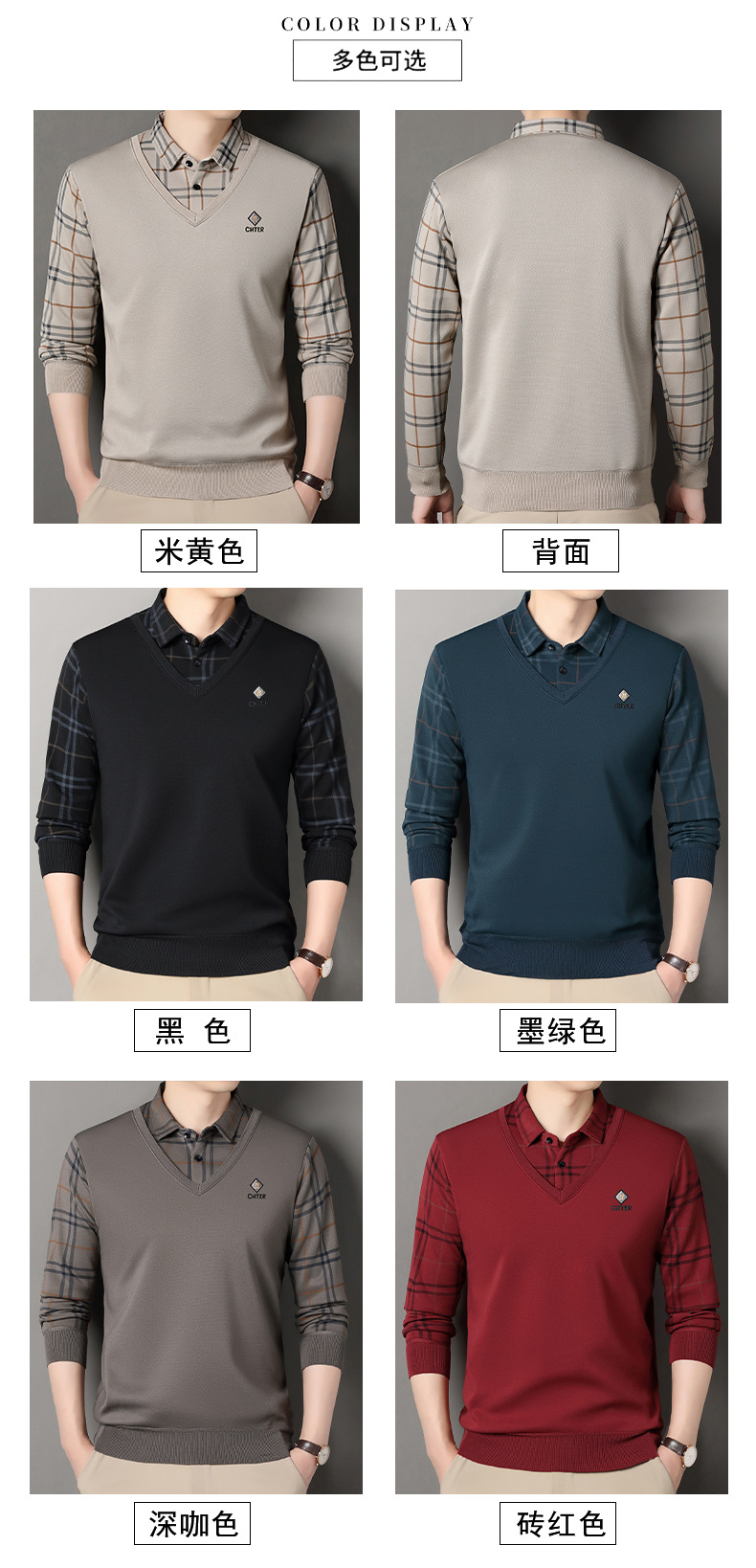 2025 새로운 남성 가짜 투피스 스웨터 중년 및 노인 아빠 긴팔 티셔츠 봄과 가을베이스 셔츠 얇은 내부 탑