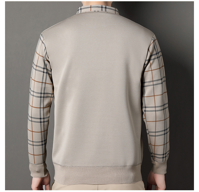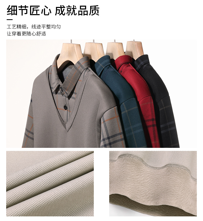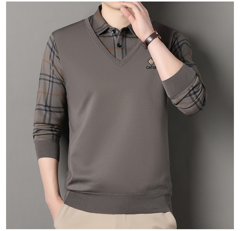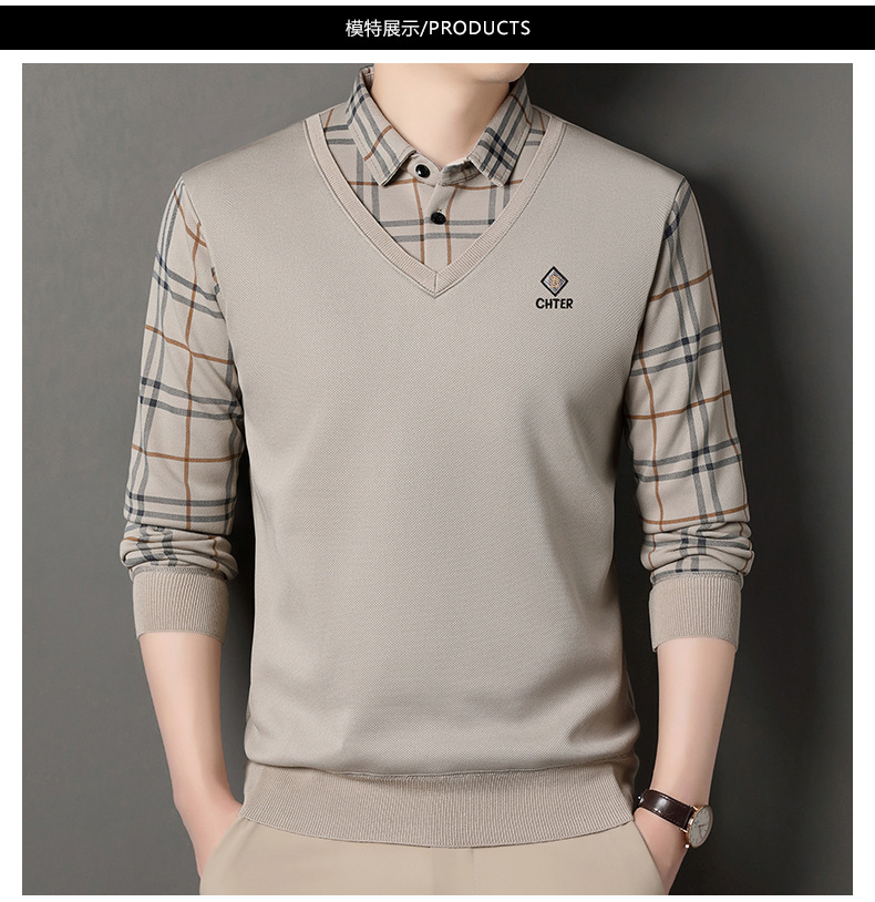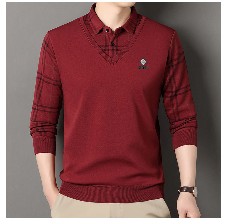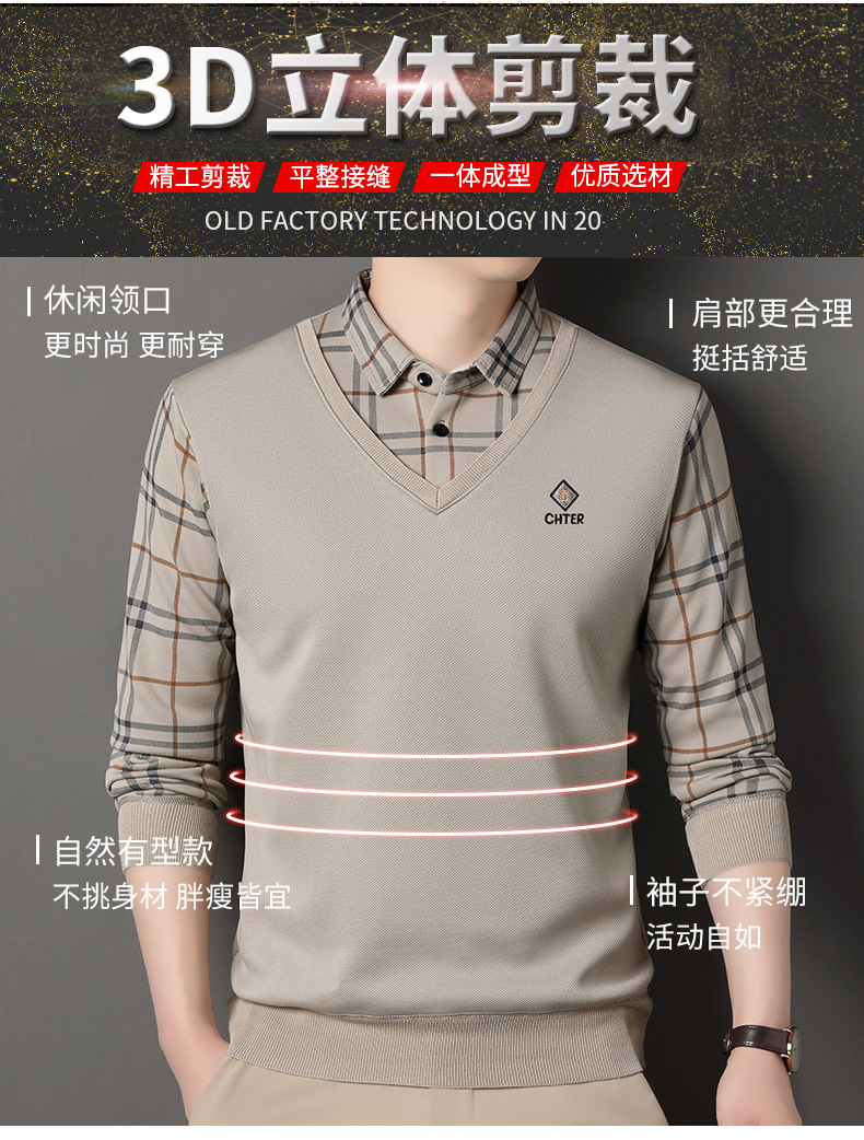 2025 새로운 남성 가짜 투피스 스웨터 중년 및 노인 아빠 긴팔 티셔츠 봄과 가을베이스 셔츠 얇은 내부 탑스토어 가기