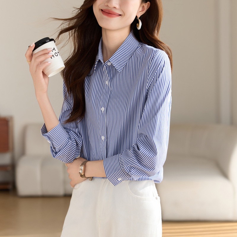 블루 셔츠 여성용 긴 소매 2025 봄 새로운 올 매치 기질 전문 통근 파란색과 흰색 줄무늬 셔츠 도매