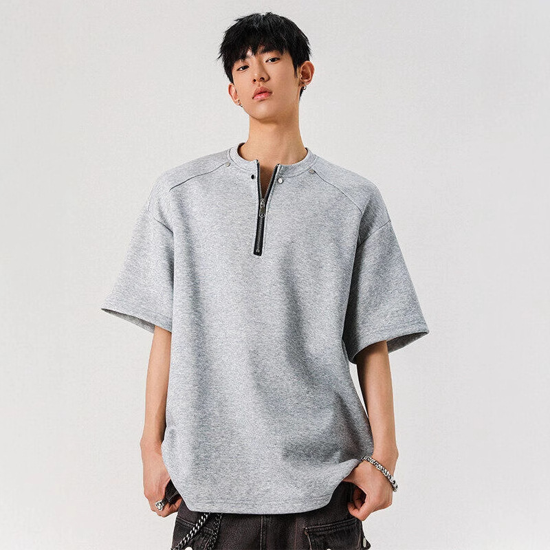아메리칸 스타일 레트로 헨리 칼라 반팔 남성 여름 패션 브랜드 플러스 사이즈 하프 지퍼 티셔츠 디자인 센스 니쉬 반소매 티셔츠
