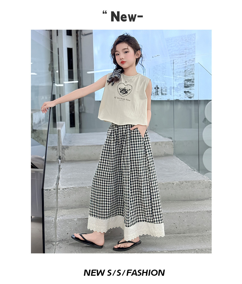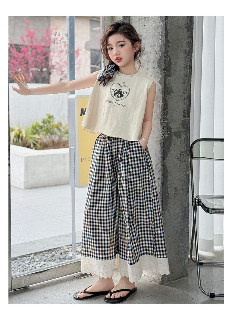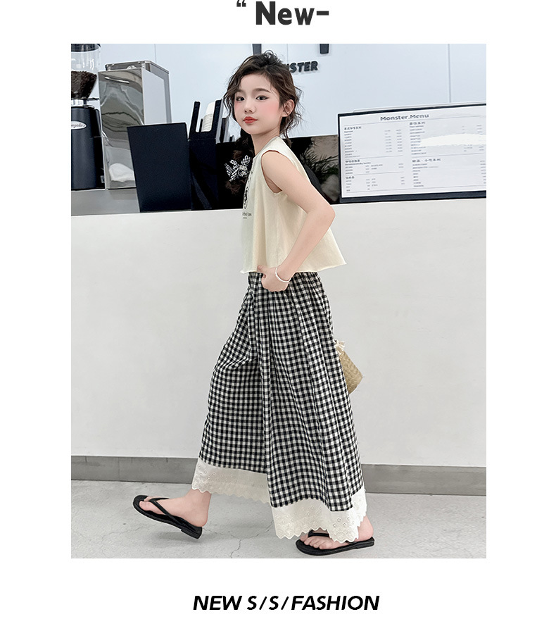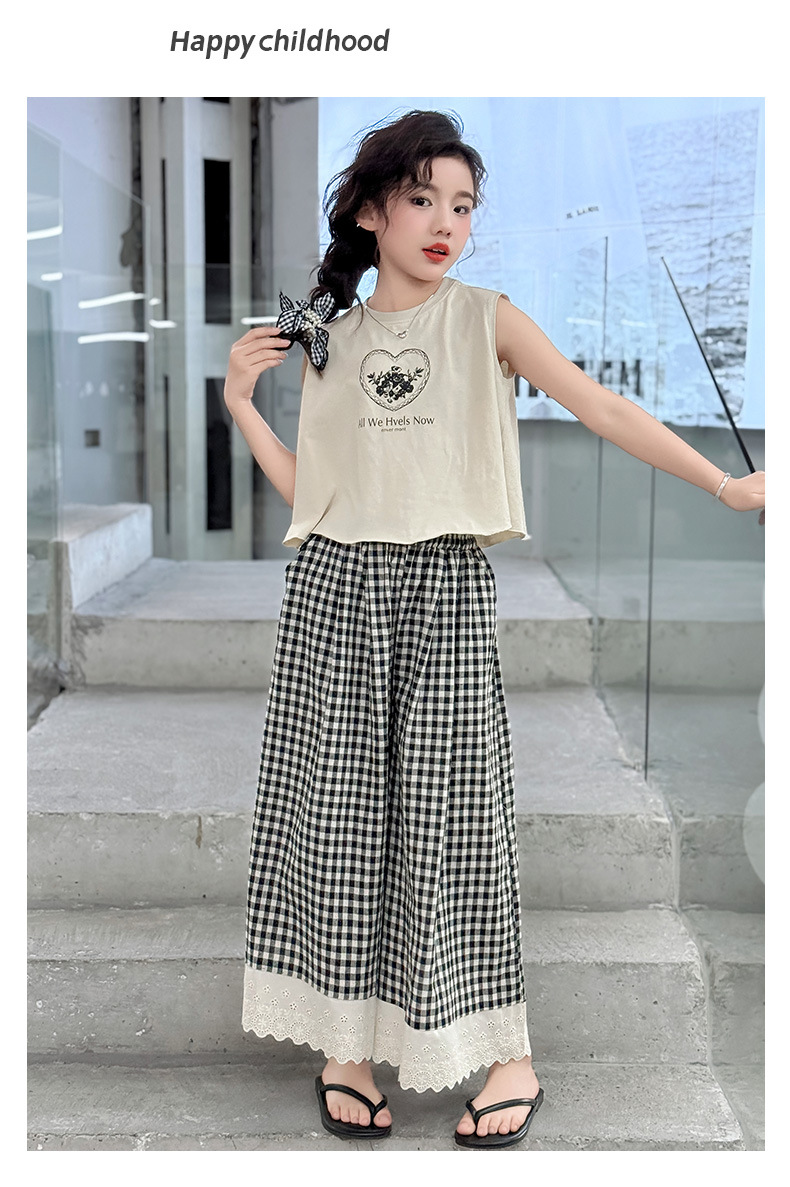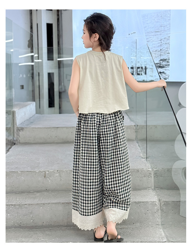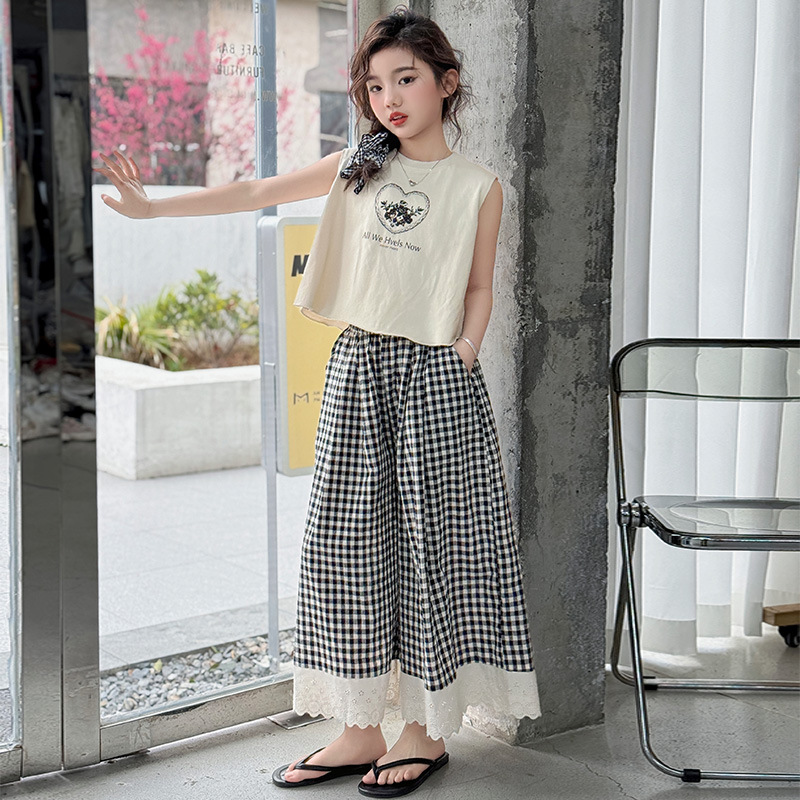 소녀의 큰 소년의 여름 민소매 세트 2025 새로운 한국 스타일 소녀 서양식 조끼 격자 무늬 레이스 와이드 다리 바지