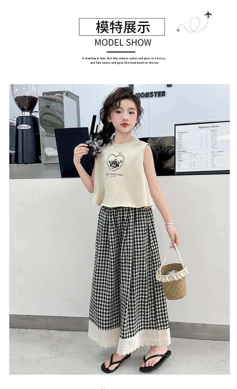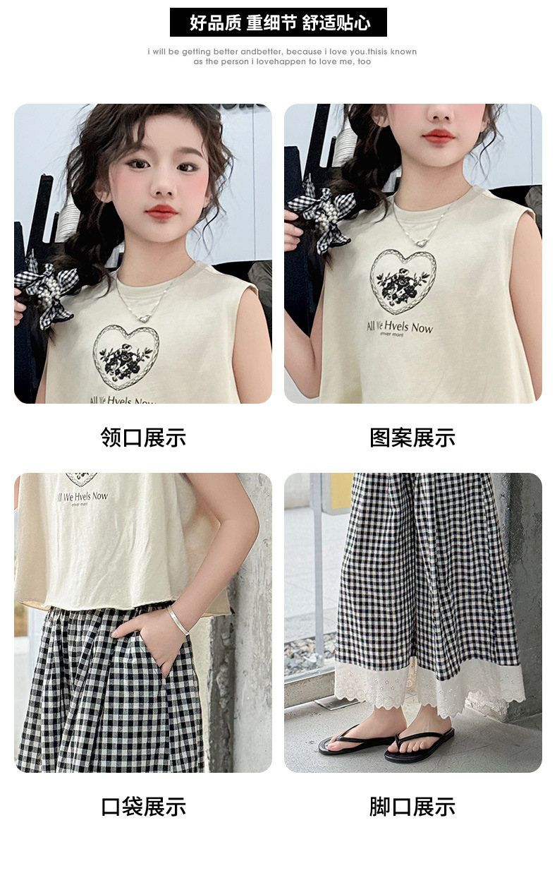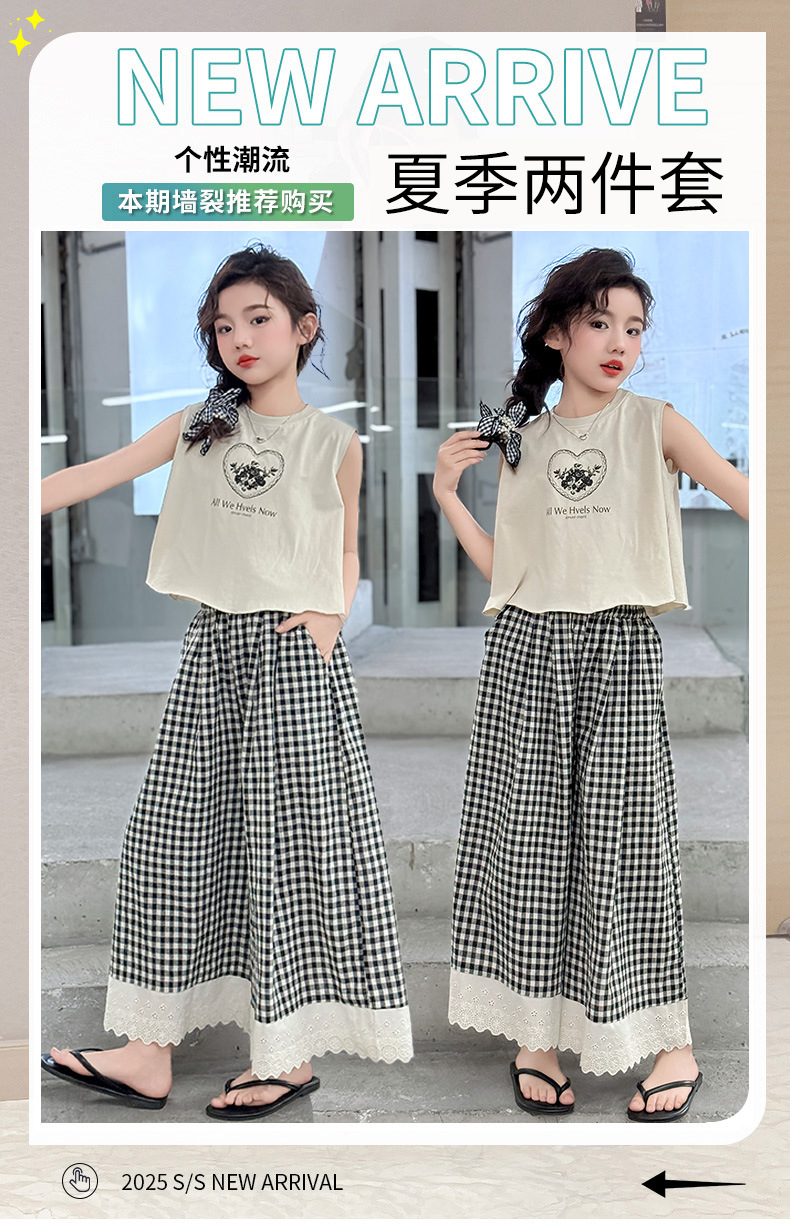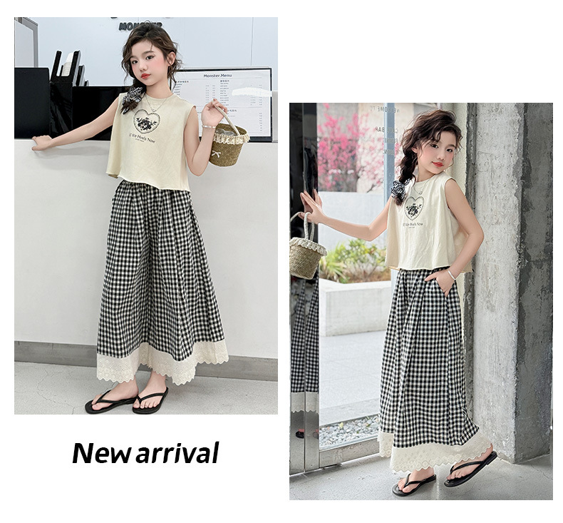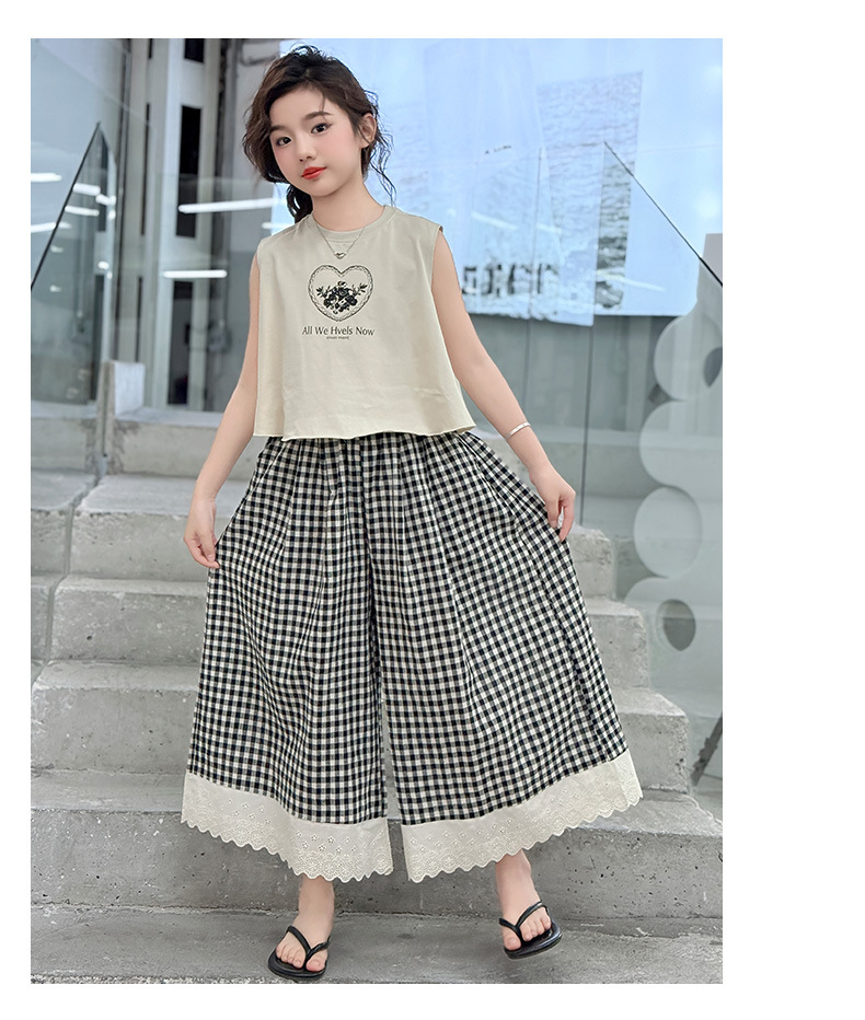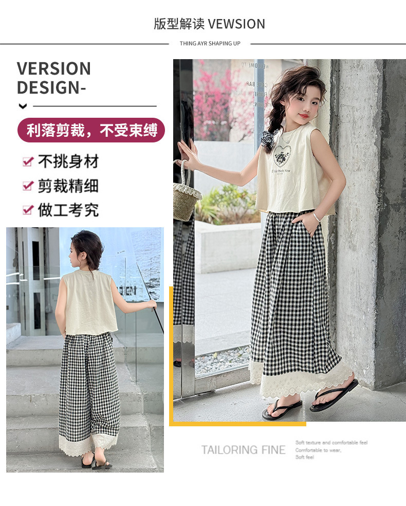 소녀의 큰 소년의 여름 민소매 세트 2025 새로운 한국 스타일 소녀 서양식 조끼 격자 무늬 레이스 와이드 다리 바지