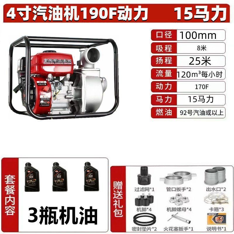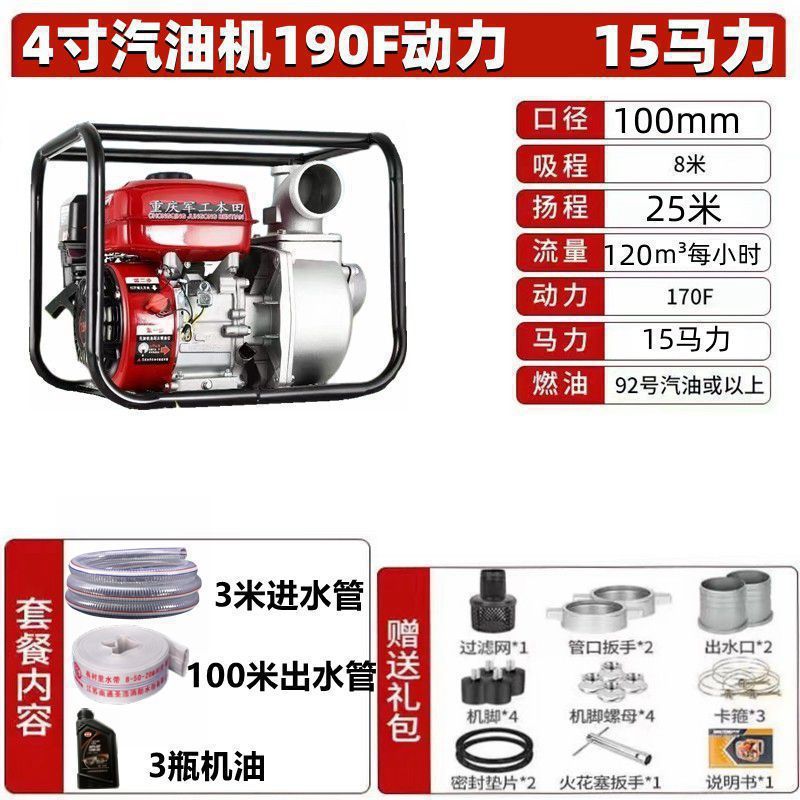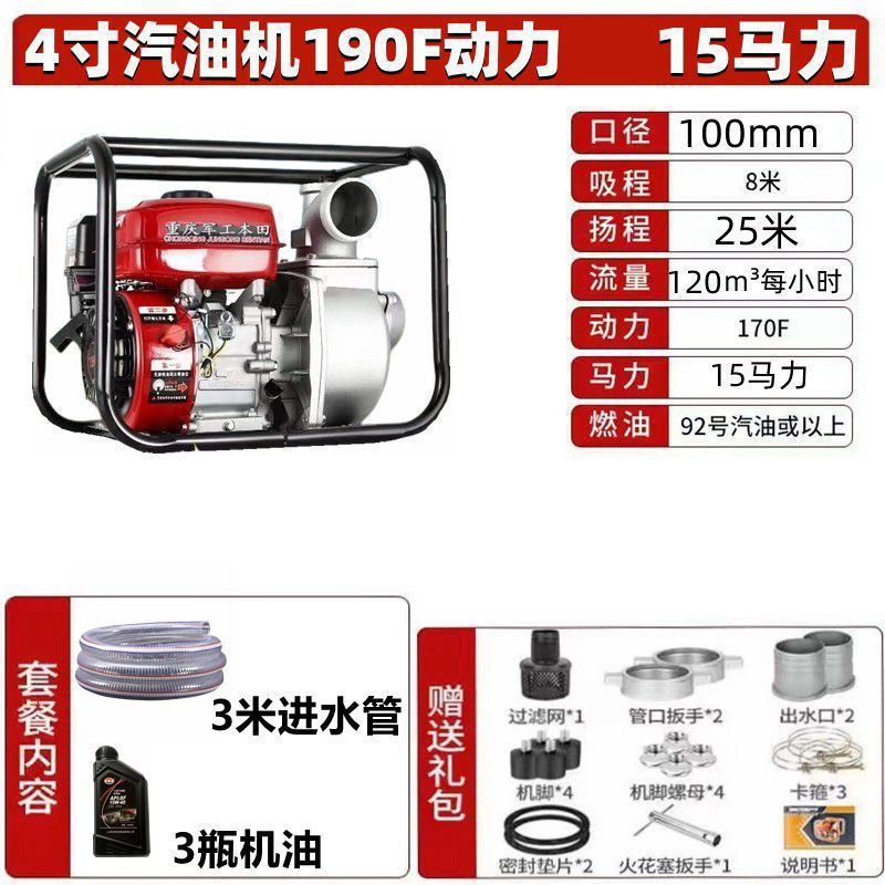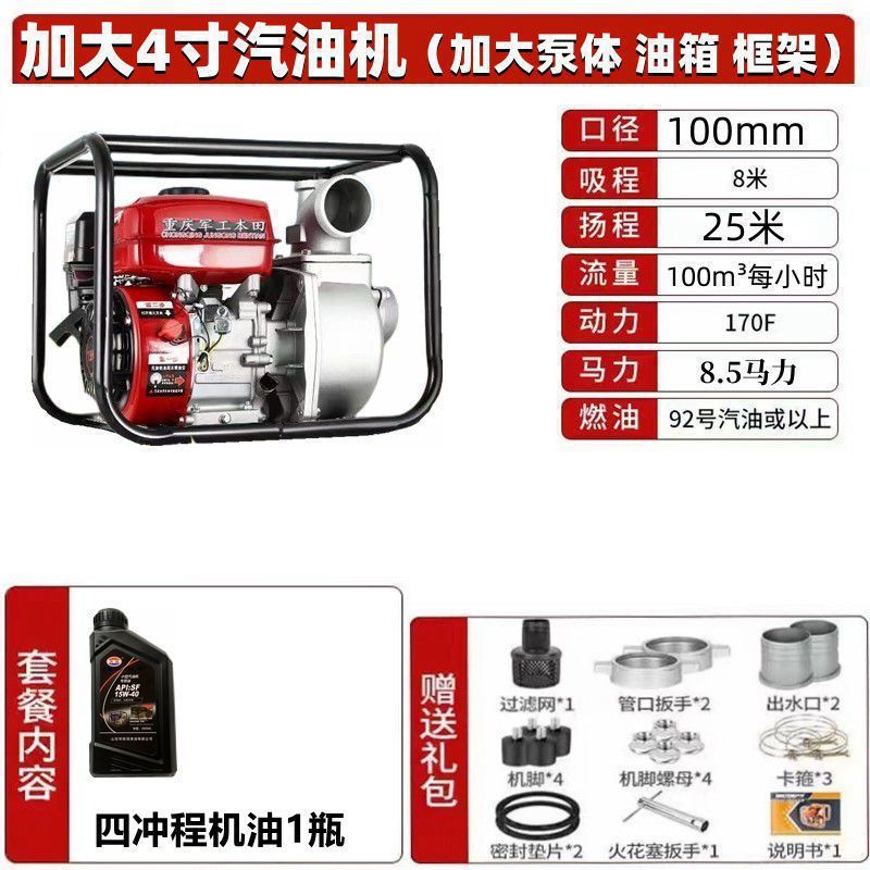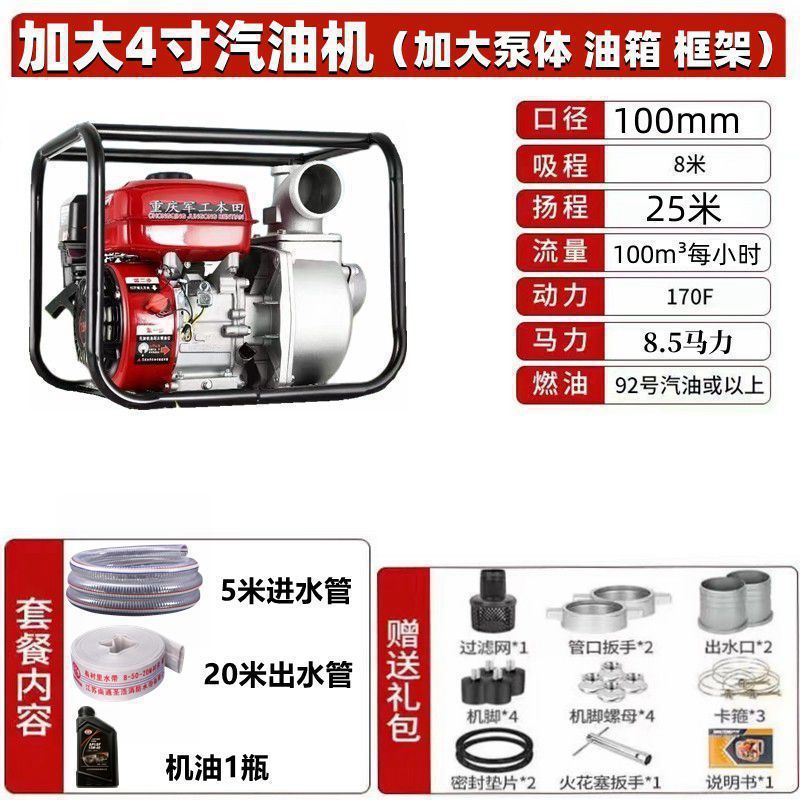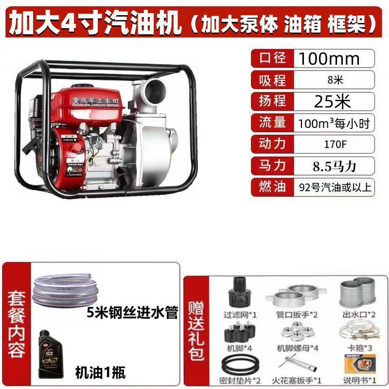 • 증가 4inch 가솔린 엔진 (대형 연료 탱크 및 대형 펌프 본체) + 표준 구성 + 3m 강선 물 유입 파이프 + 3