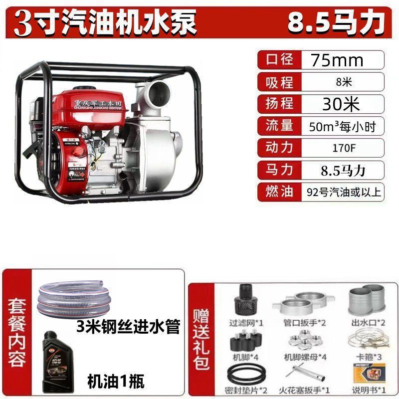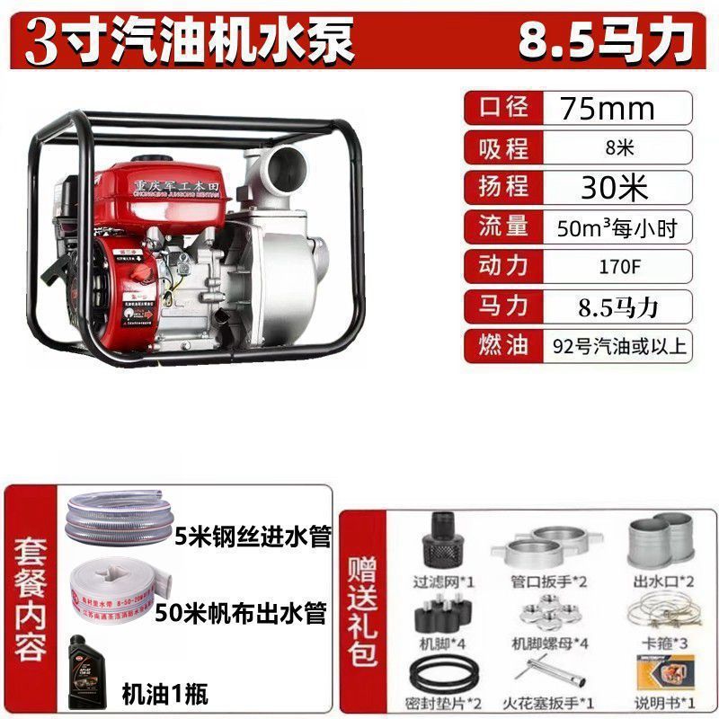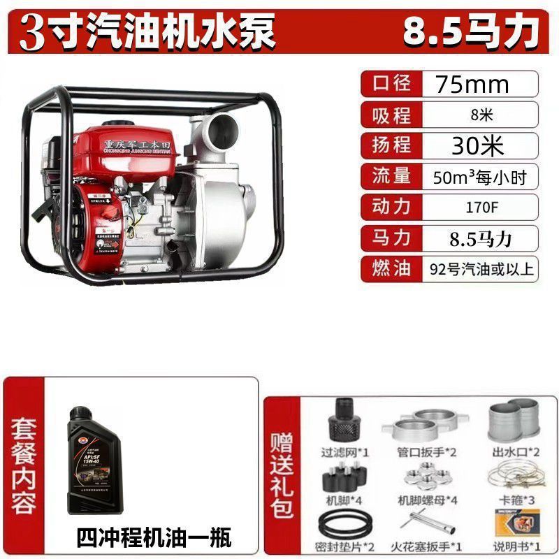 • 3inch 가솔린 엔진(8.5마력) + 공장 표준 구성(엔진 오일 포함)에는 물 입구와 출구가 포함되지 않습니다.