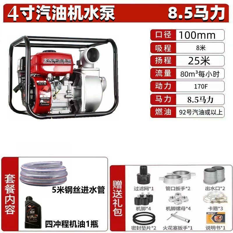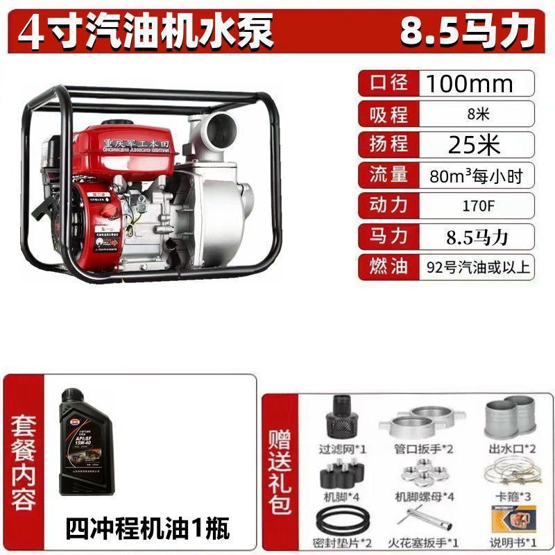 • 4inch 가솔린 엔진(8.5마력) + 공장 표준 구성(엔진 오일 포함)에는 물 입구와 출구가 포함되지 않습니다.