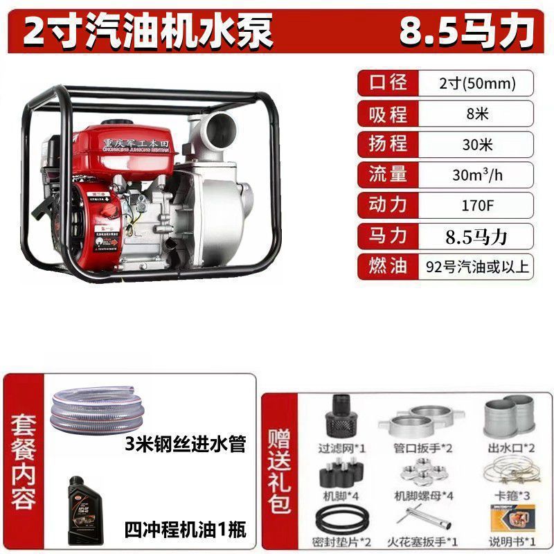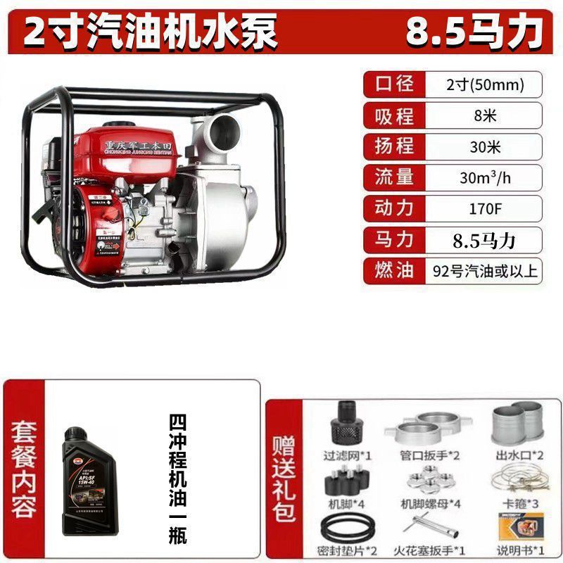 • 2inch 가솔린 엔진(8.5마력) + 공장 표준 구성(엔진 오일 포함)에는 물 입구와 출구가 포함되지 않습니다.