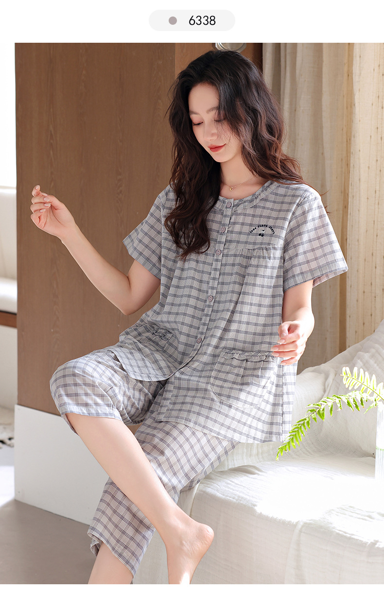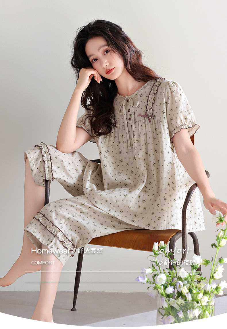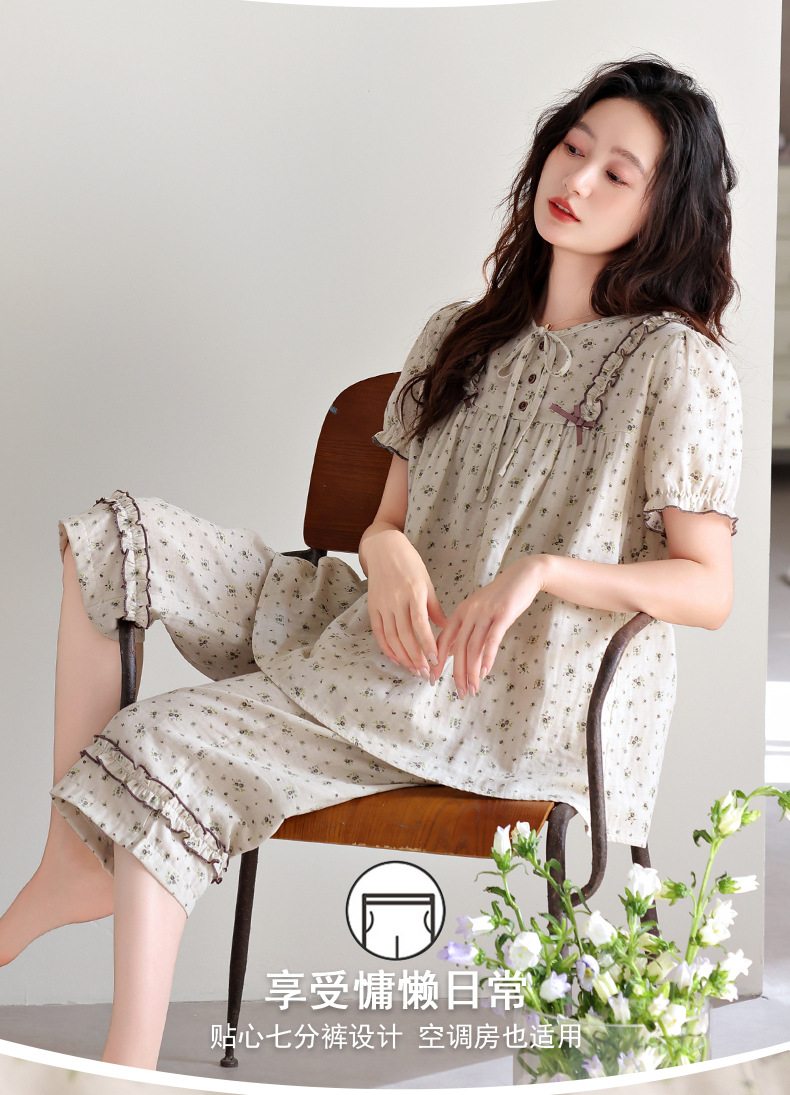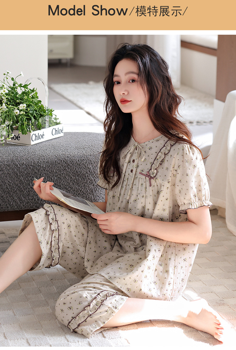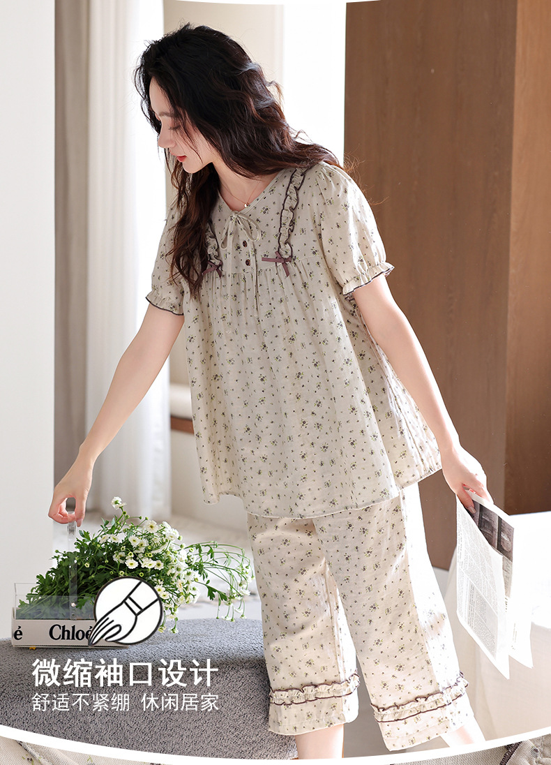 잠옷 여성 여름면 반팔 카프리 바지 중년 어머니 얇은 풀오버 면 느슨한 홈 의류 세트스토어 가기