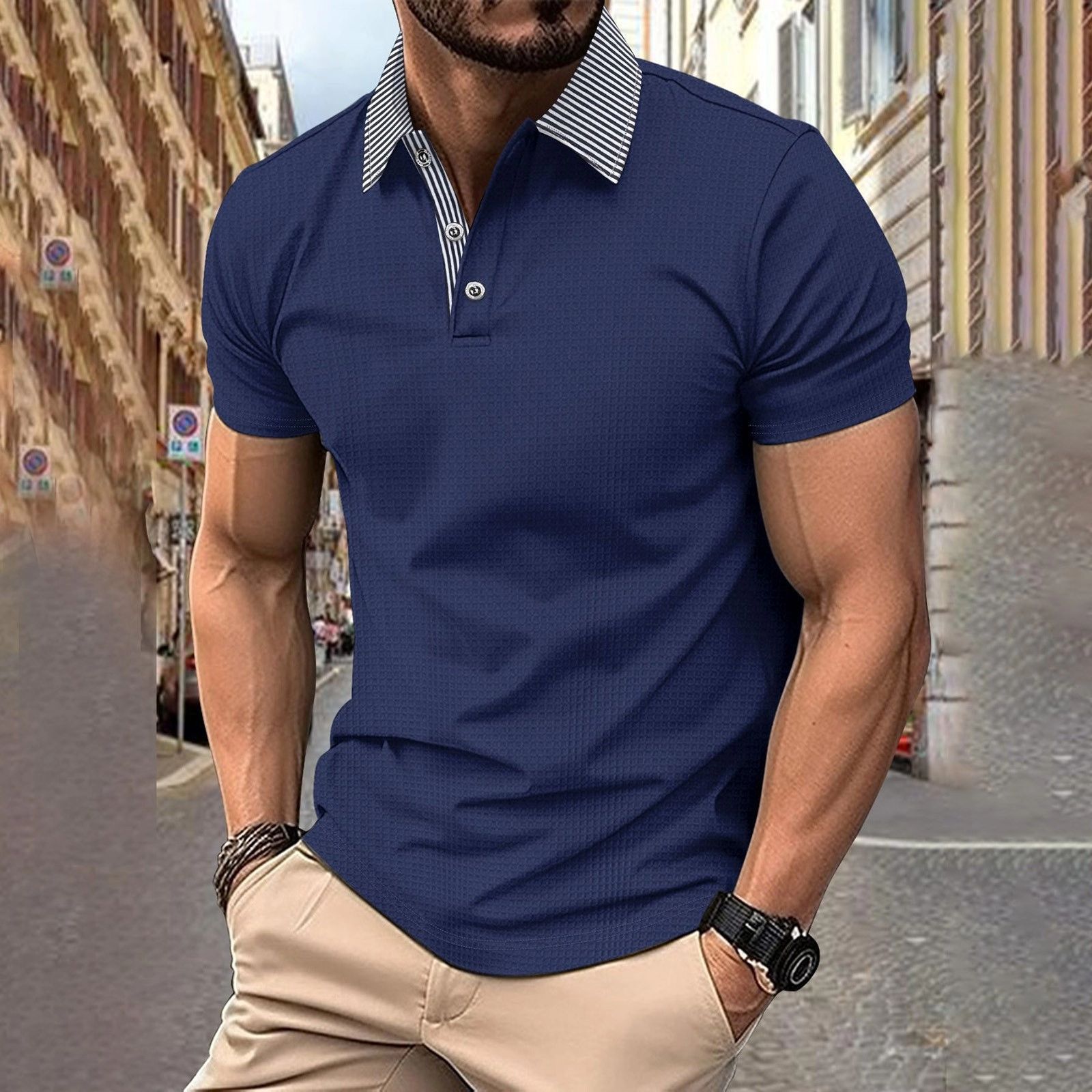 새로운 크로스보더 여름 패션 남성 프린트 컬러 반소매 라펠 셔츠, 골프 및 테니스 등 야외 활동에 적합스토어 가기