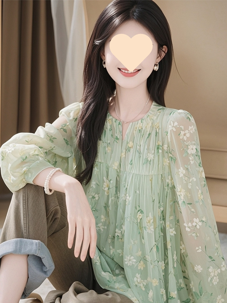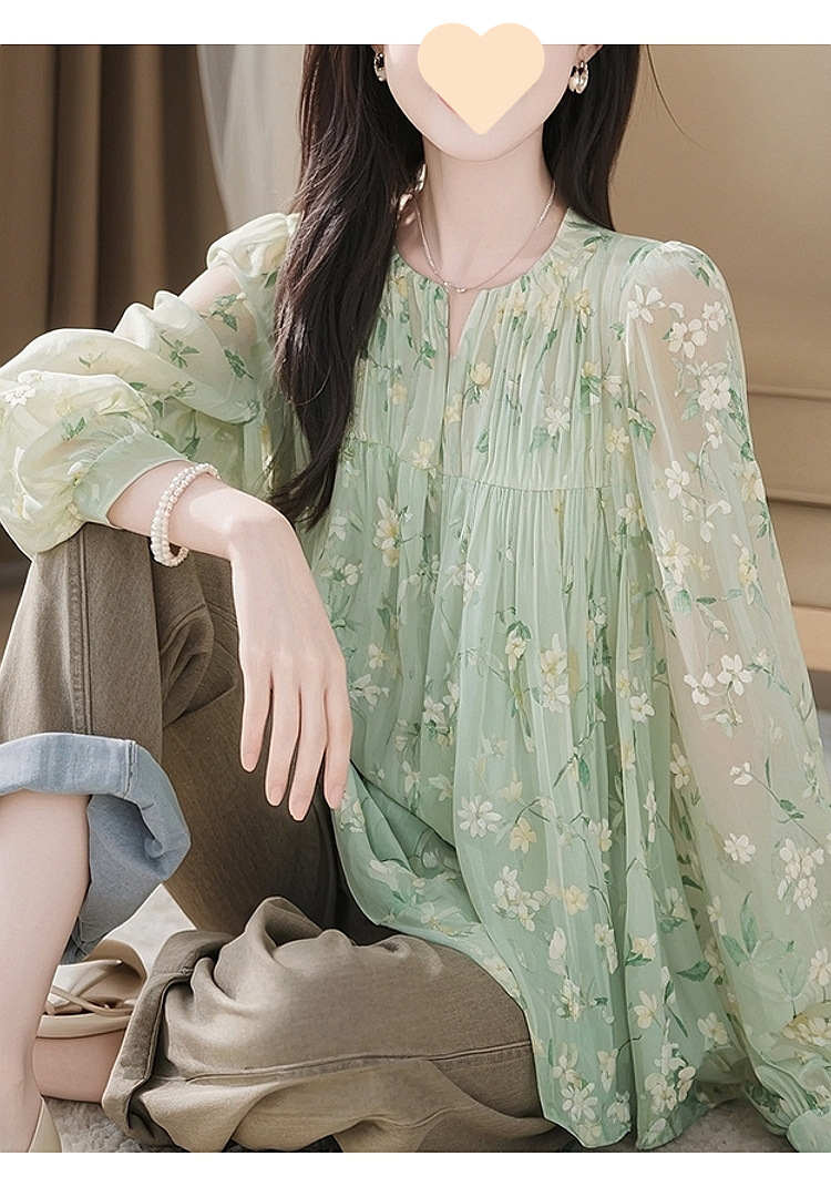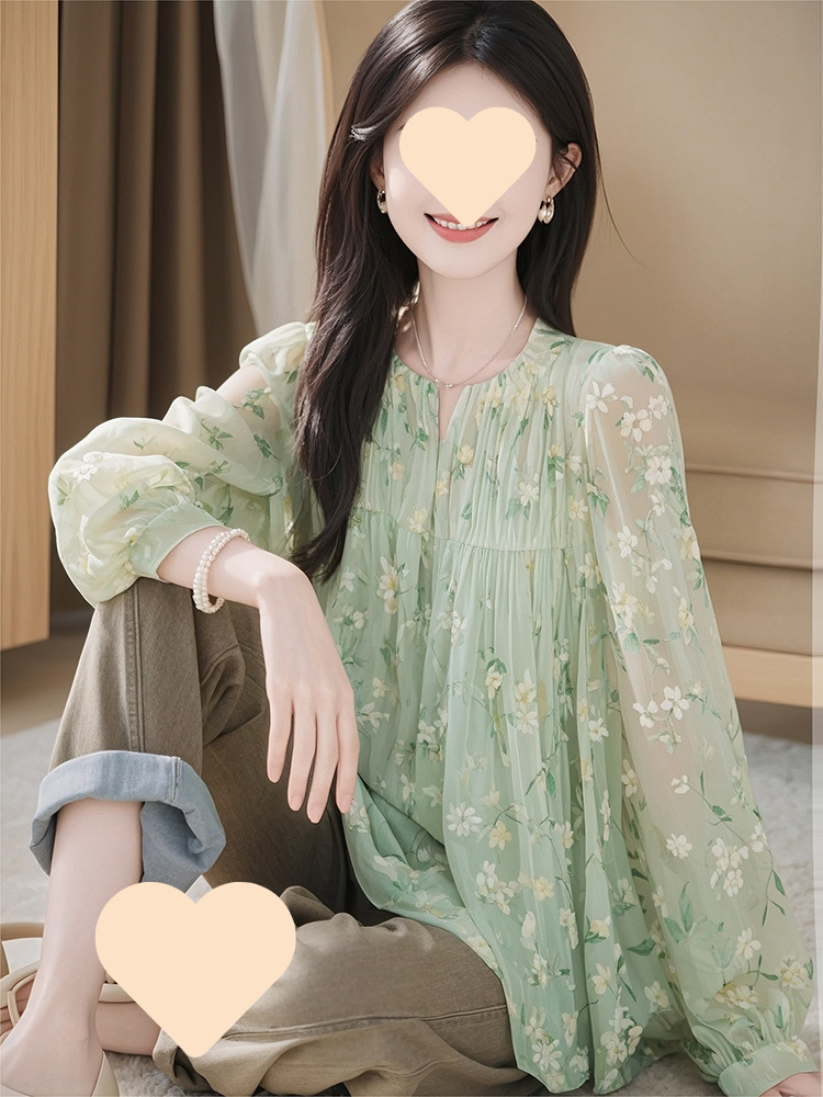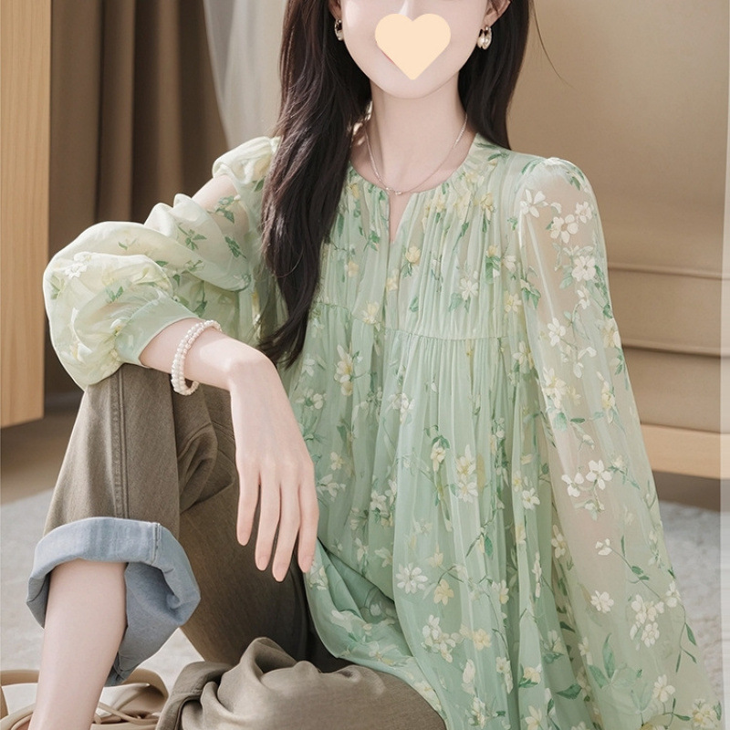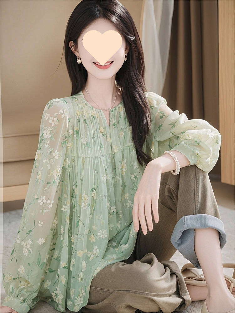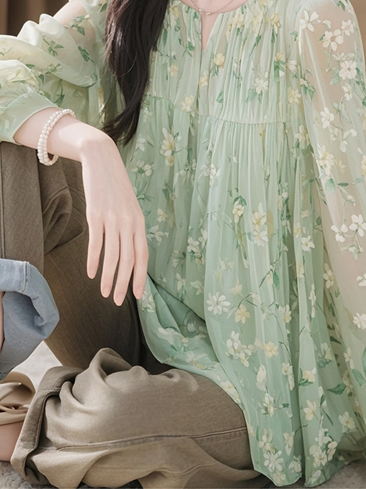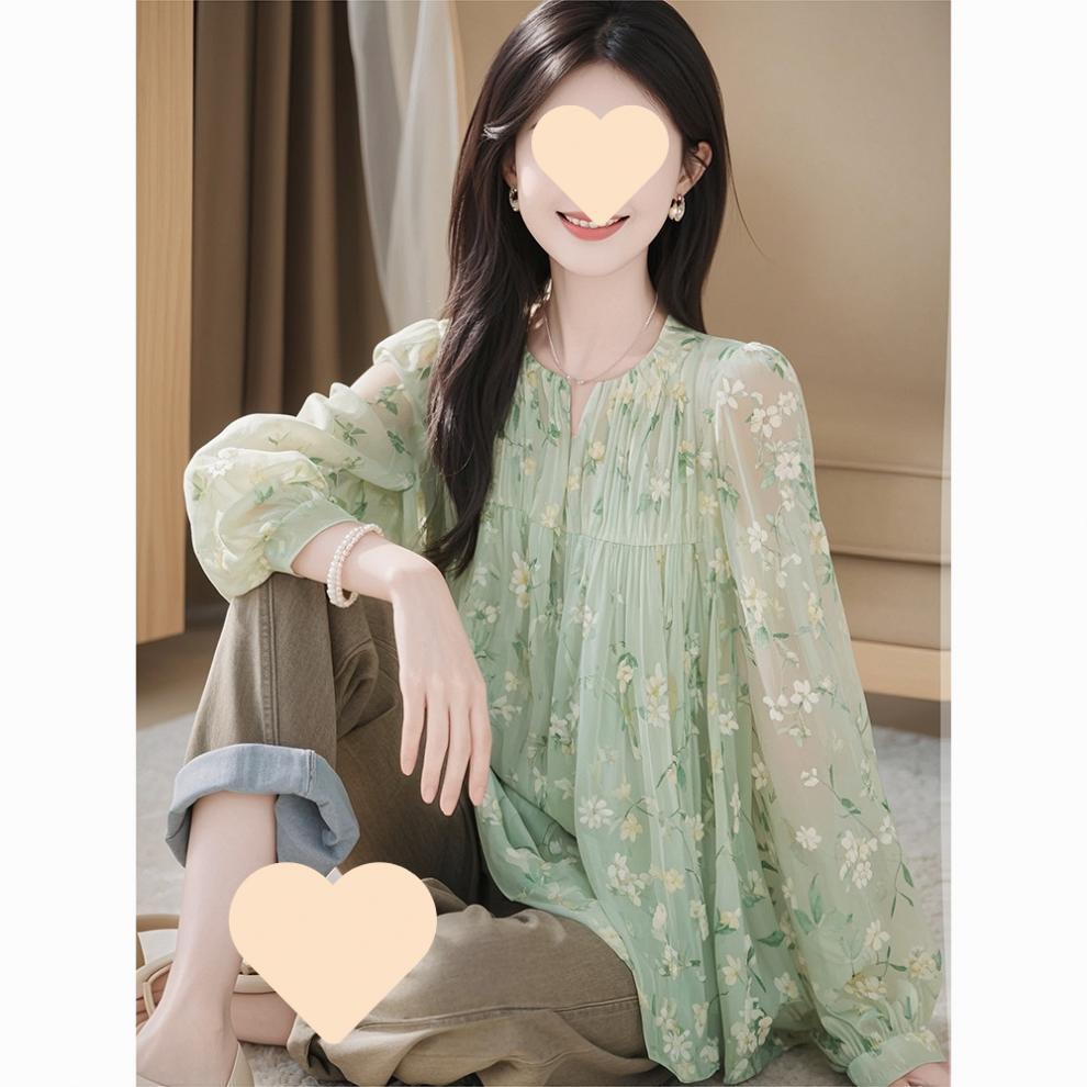 2025 봄과 가을 프랑스 스타일 독특한 아름다운 디자인 센스 녹색 꽃 쉬폰 셔츠 여름스토어 가기