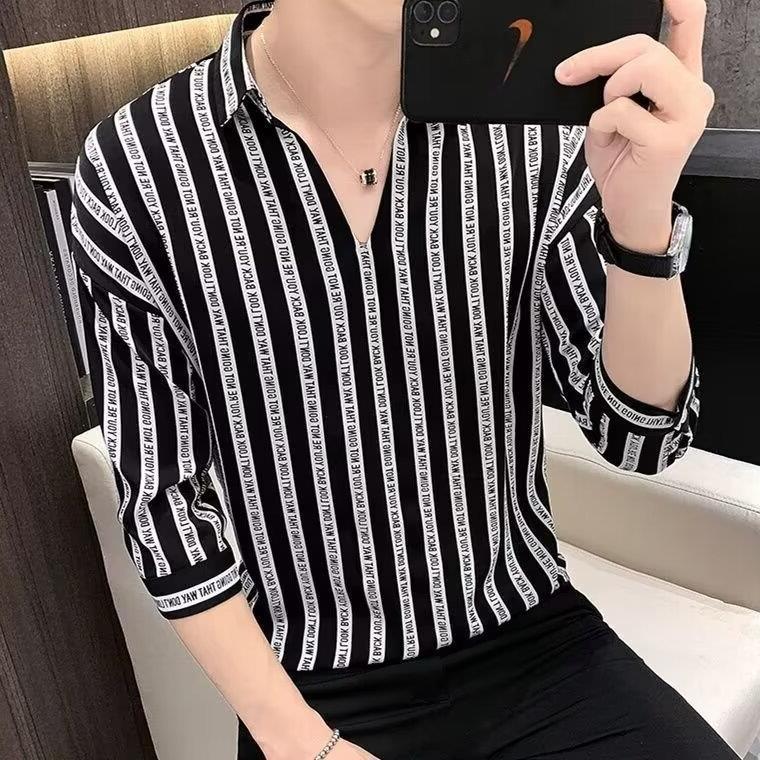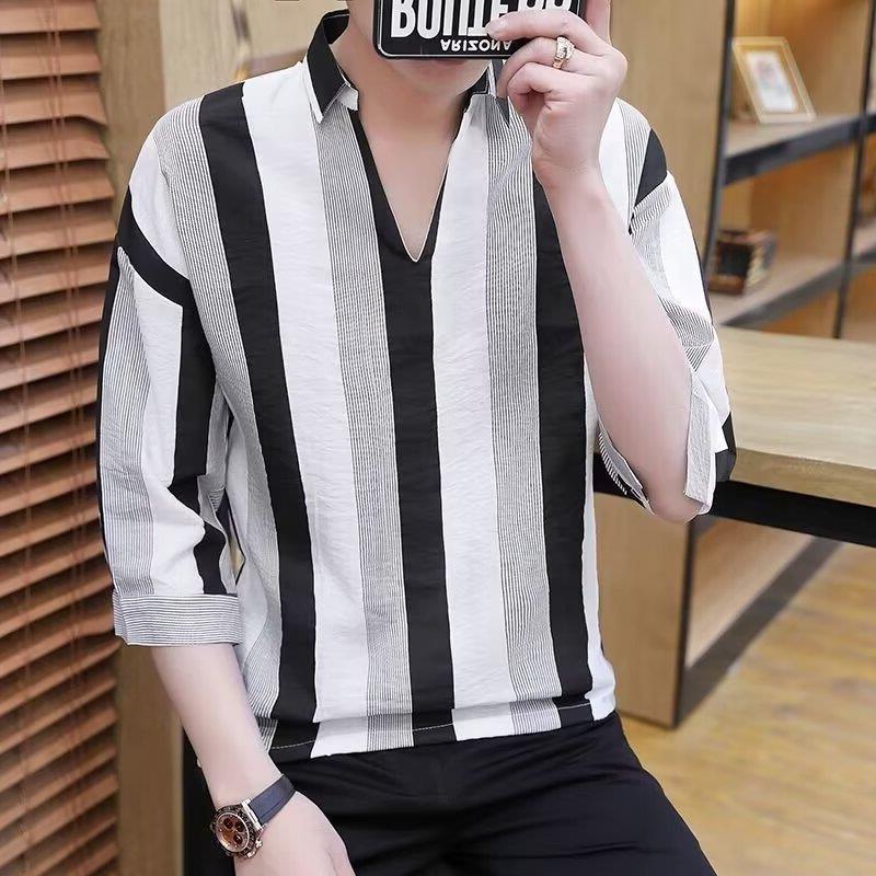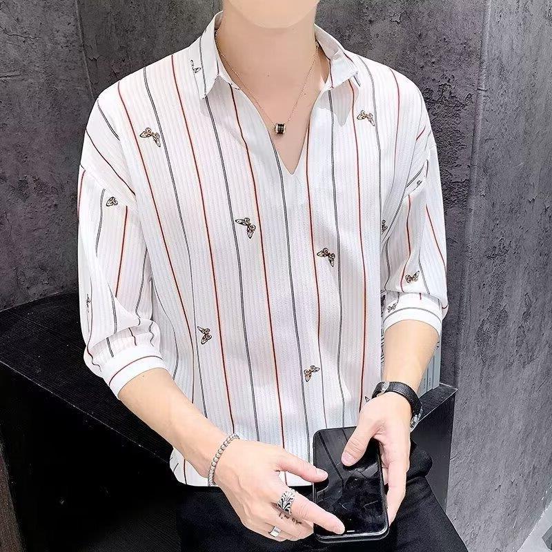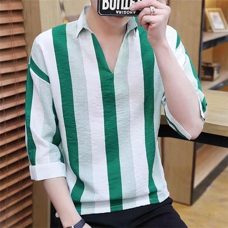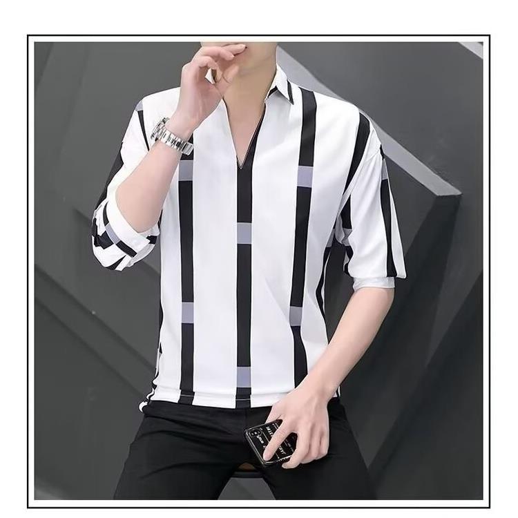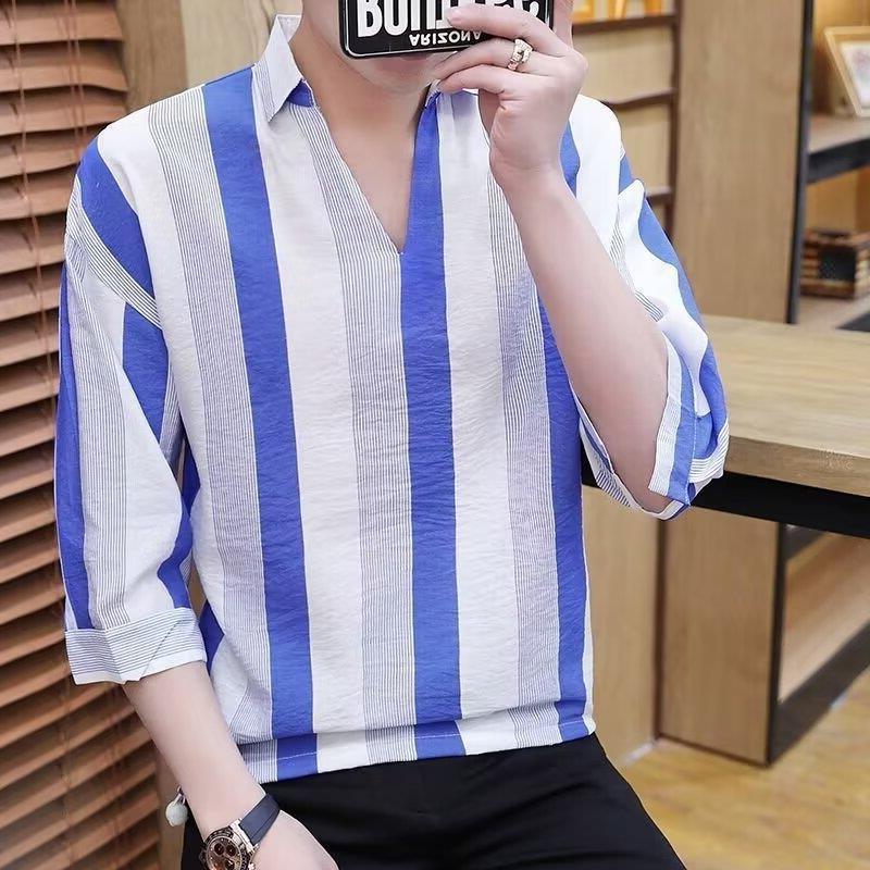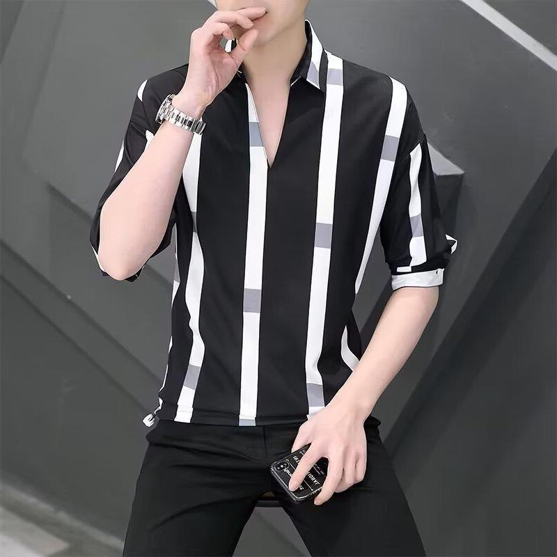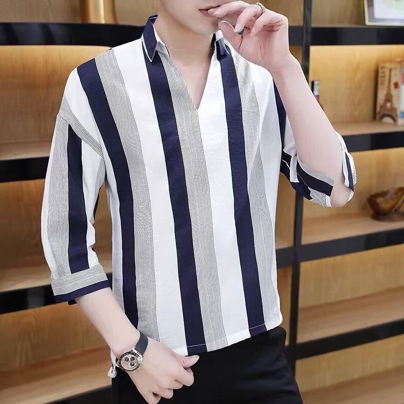 여름 세븐 포인트 슬리브 셔츠 남성용 트렌디 한 캐주얼 슬림 핏 체크 무늬 컬러 수직 스트라이프 여름 아이스 실크 셔츠