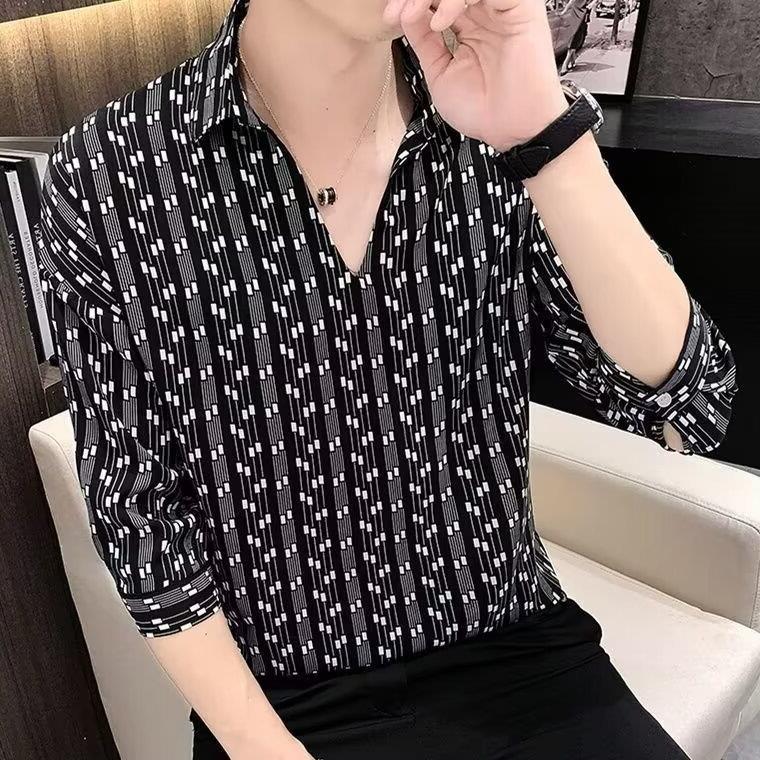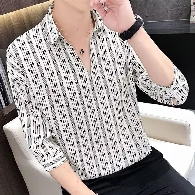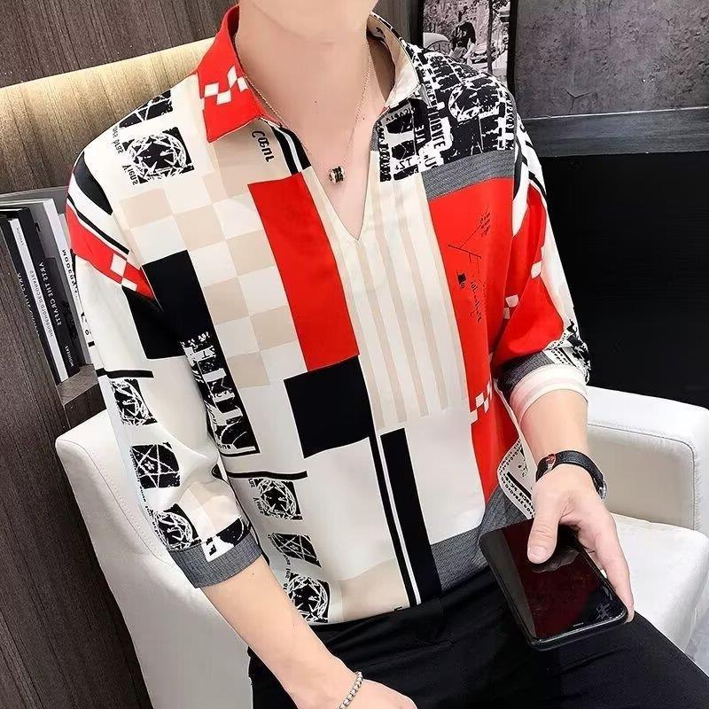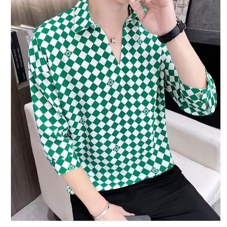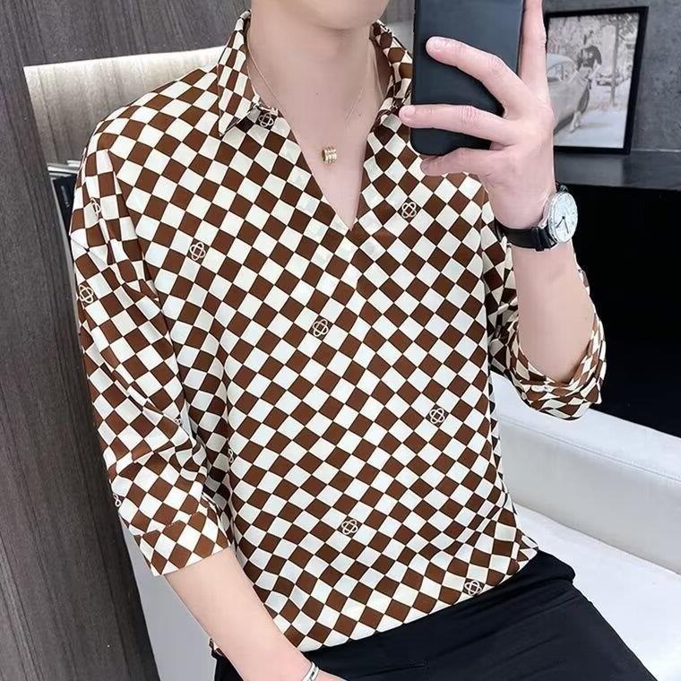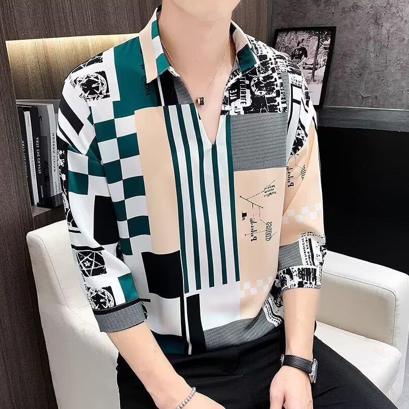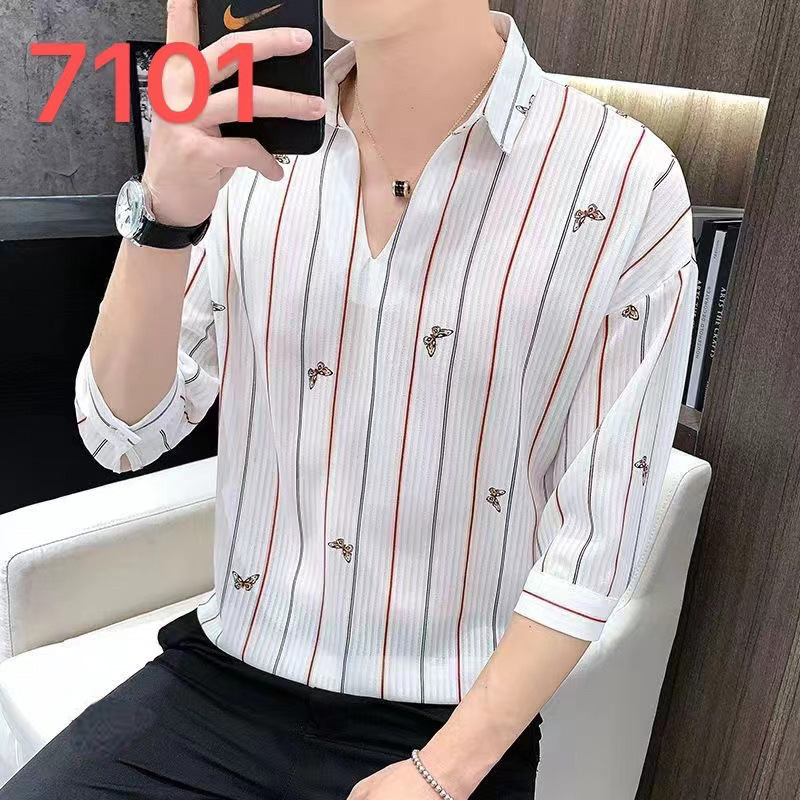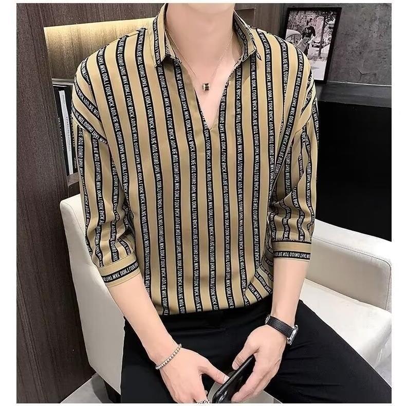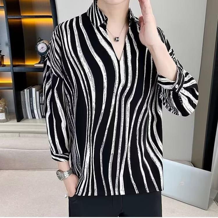 여름 세븐 포인트 슬리브 셔츠 남성용 트렌디 한 캐주얼 슬림 핏 체크 무늬 컬러 수직 스트라이프 여름 아이스 실크 셔츠