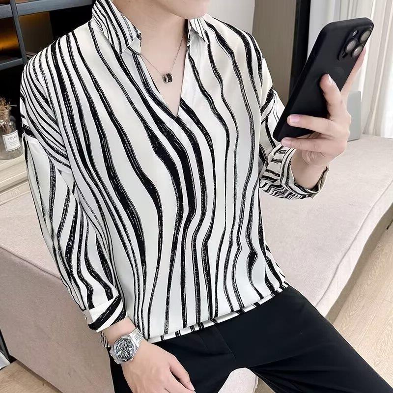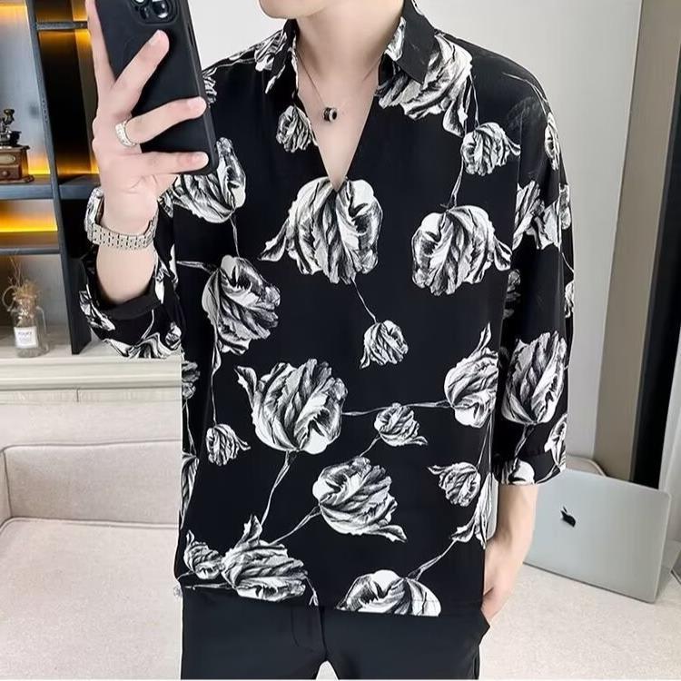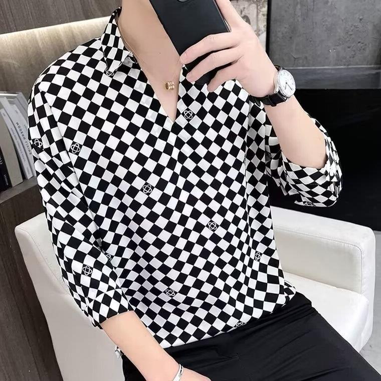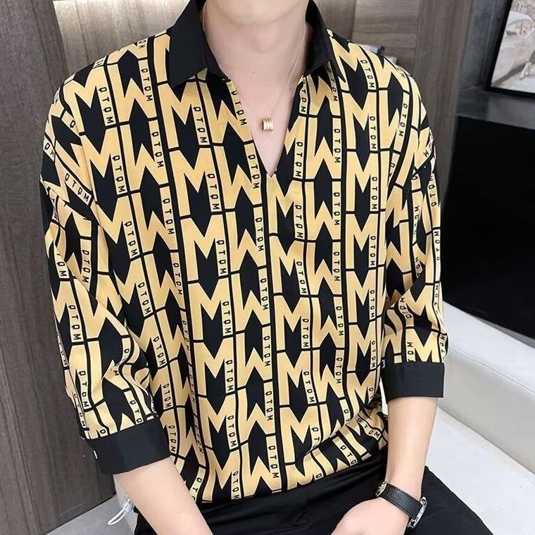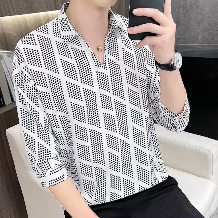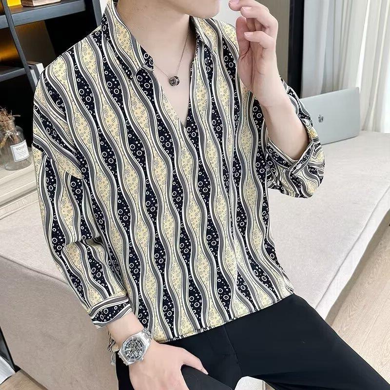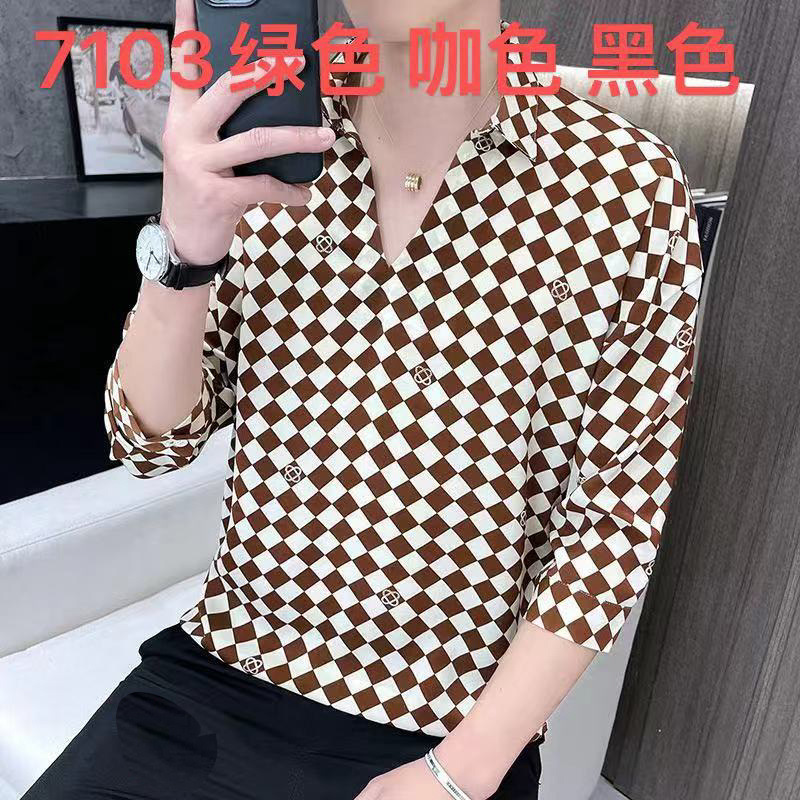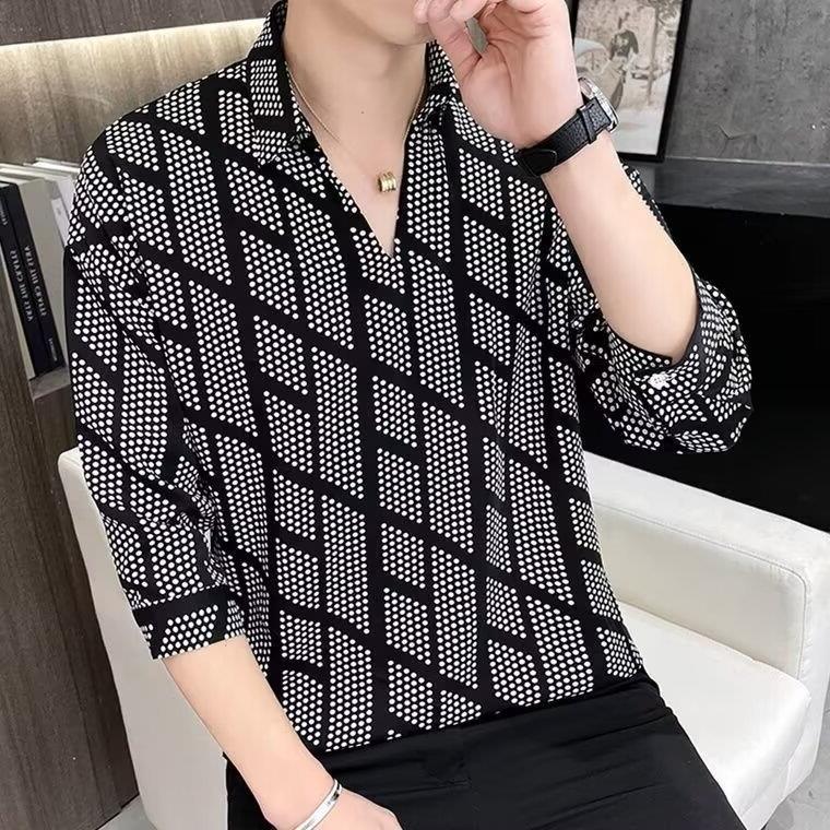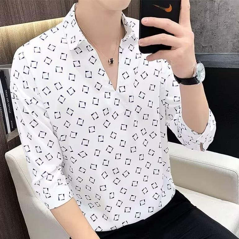 여름 세븐 포인트 슬리브 셔츠 남성용 트렌디 한 캐주얼 슬림 핏 체크 무늬 컬러 수직 스트라이프 여름 아이스 실크 셔츠