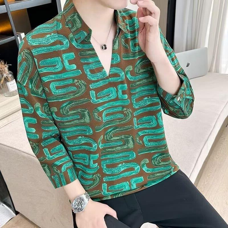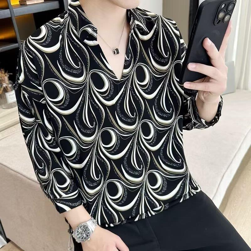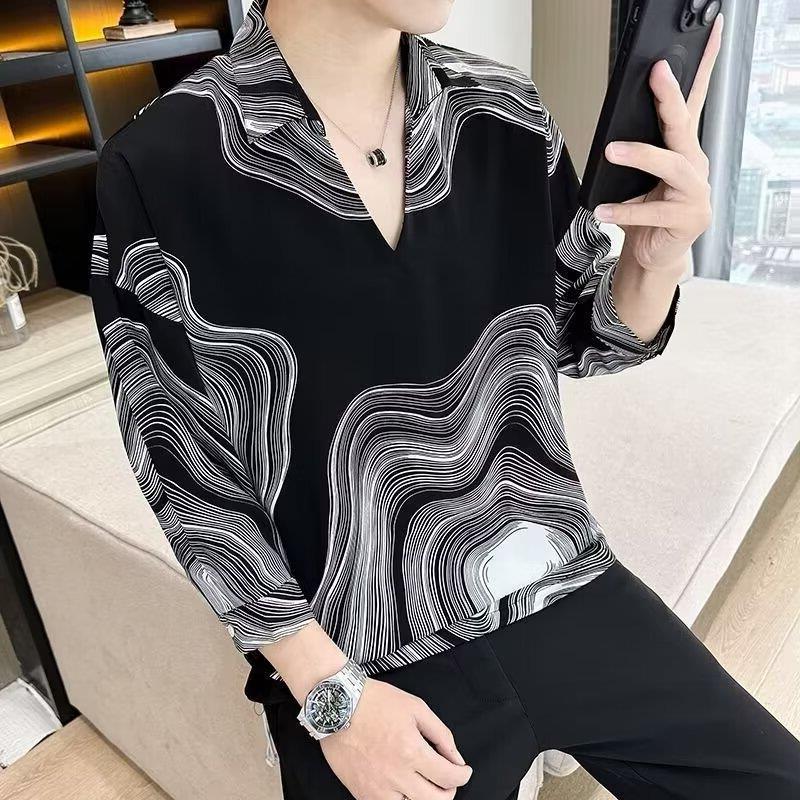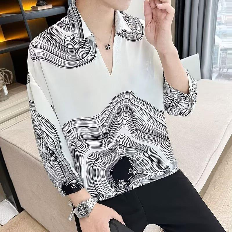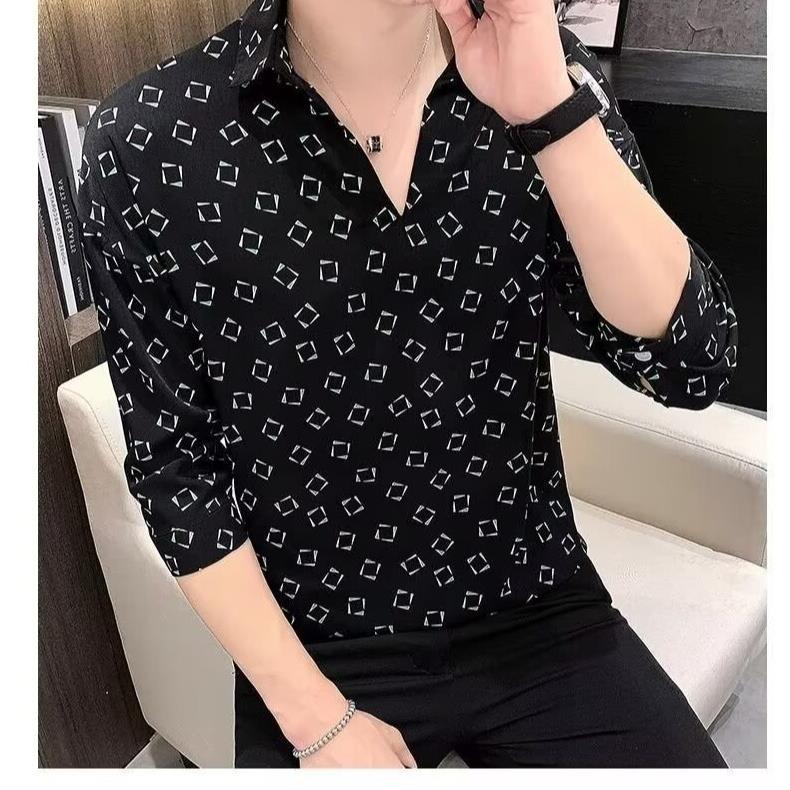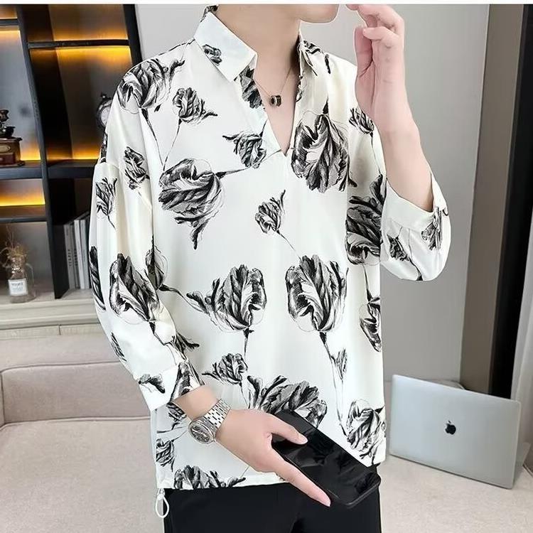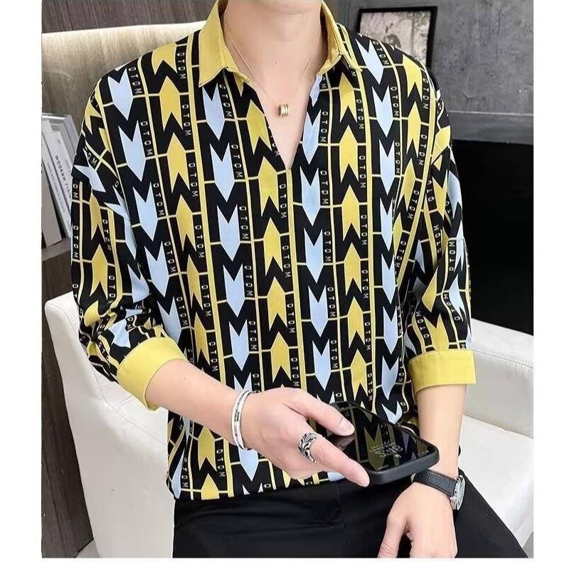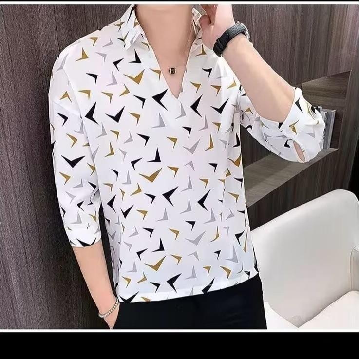 여름 세븐 포인트 슬리브 셔츠 남성용 트렌디 한 캐주얼 슬림 핏 체크 무늬 컬러 수직 스트라이프 여름 아이스 실크 셔츠