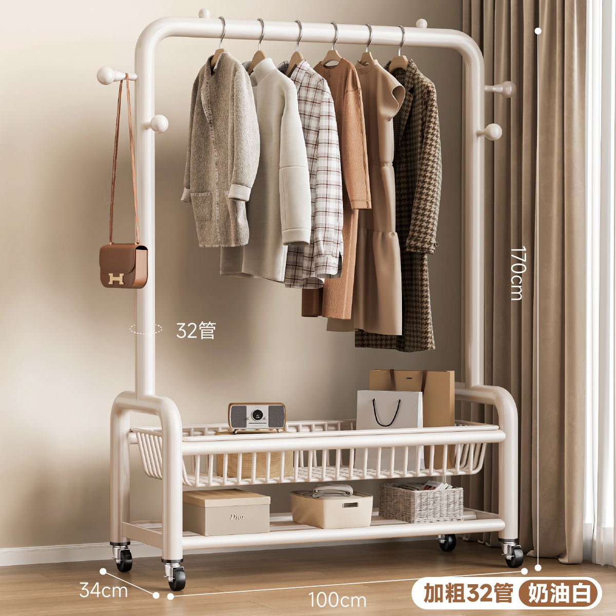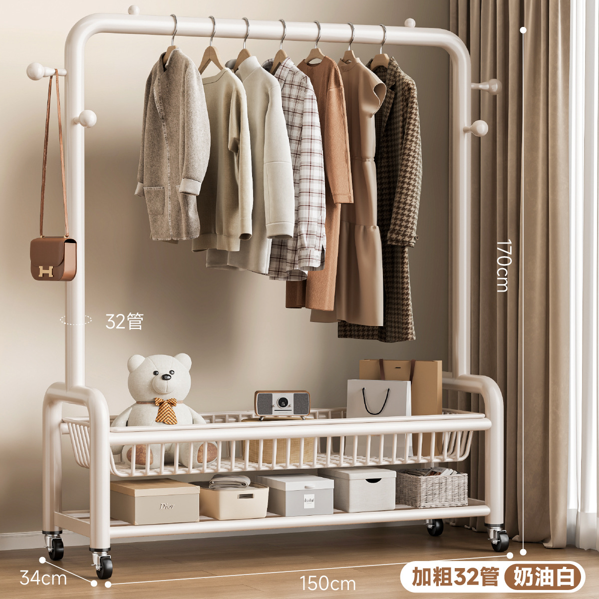 • 32 원형도어형/이중메쉬바구니/후크4개+바퀴-150㎝-크림 화이트