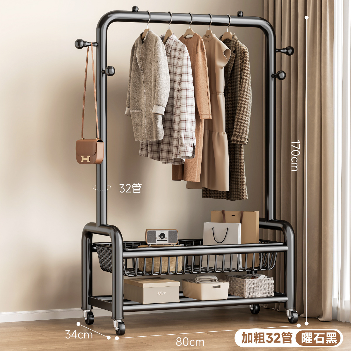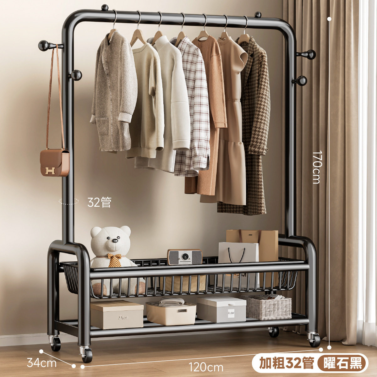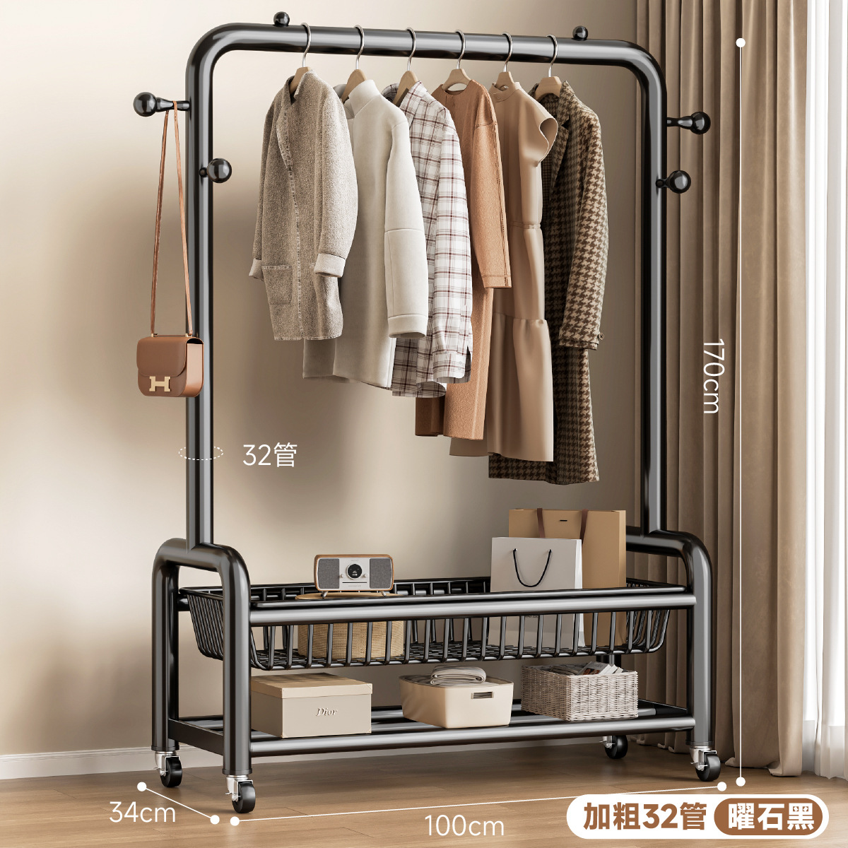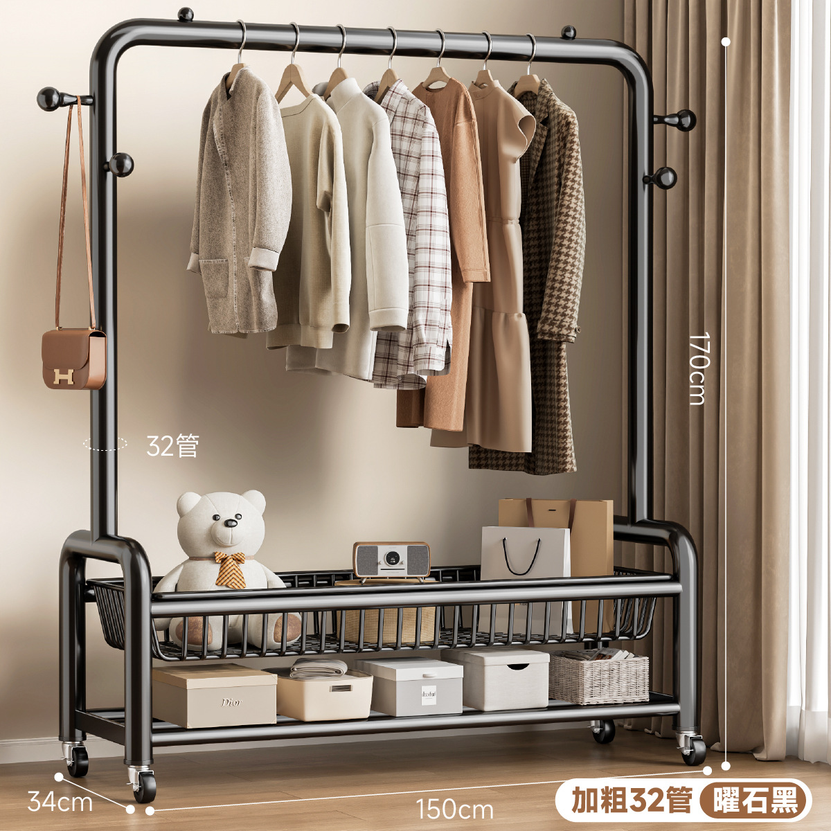 • 32 원형도어형/이중메쉬바구니/후크4개+바퀴-150㎝-검은색