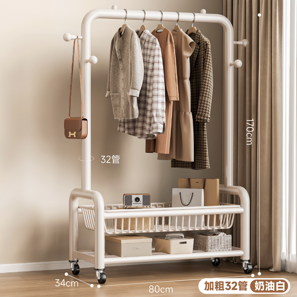• 32 원형도어형/이중메쉬바구니/후크4개+바퀴-80㎝-크림 화이트