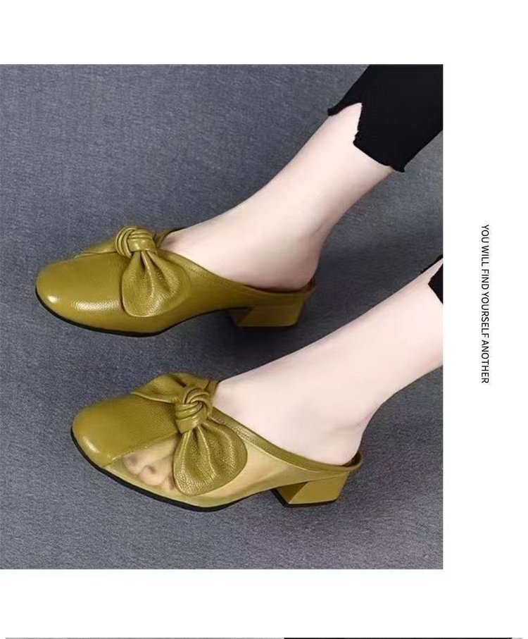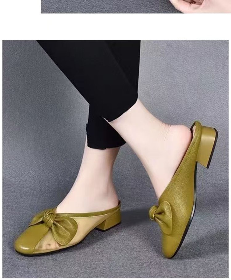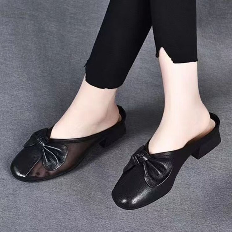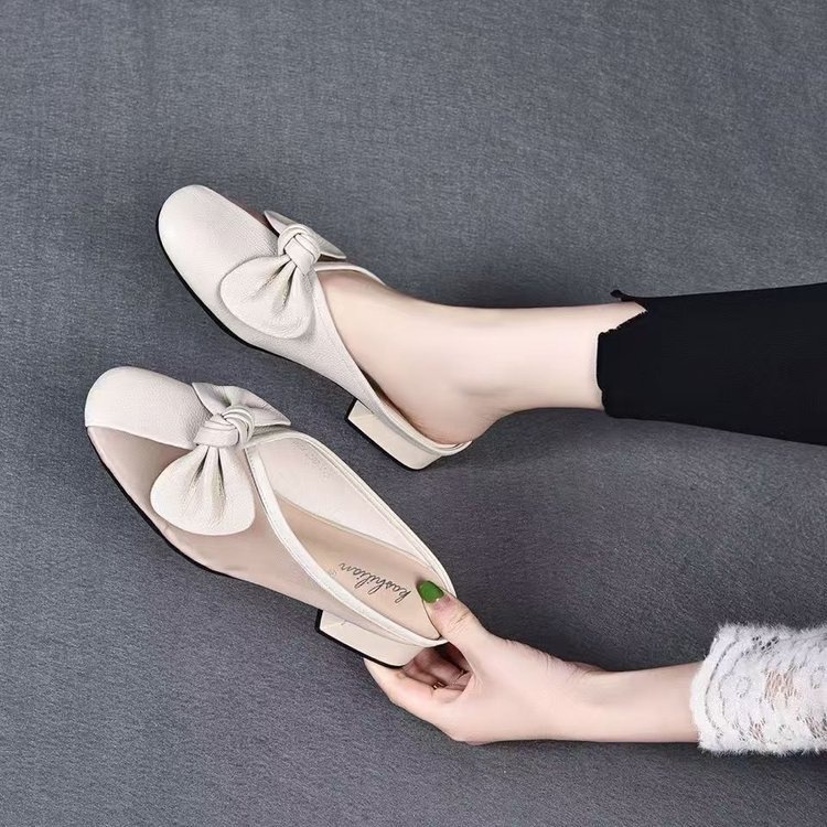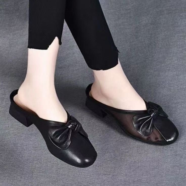 부드러운 가죽 가방 헤드 샌들 및 슬리퍼 여성용 미드 힐 2025 여름 새로운 패션 넷 적외선 착용 하프 슬리퍼 두꺼운 발 뒤꿈치 싱글 레이어 신발스토어 가기