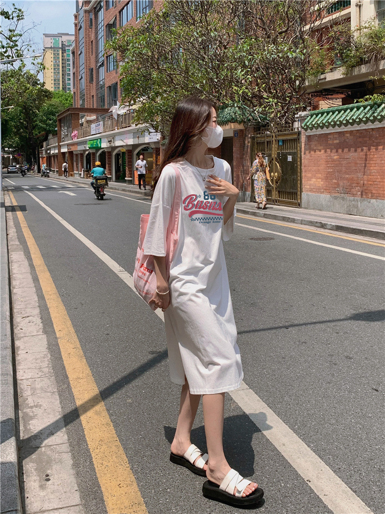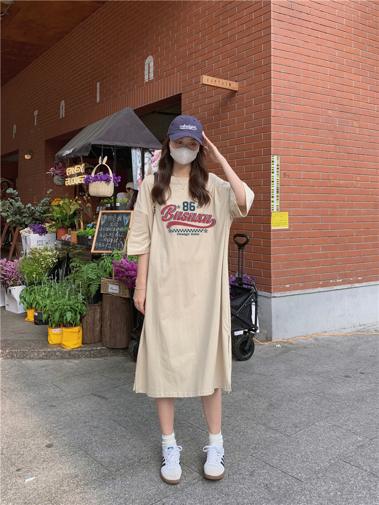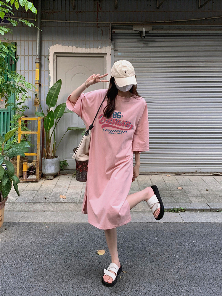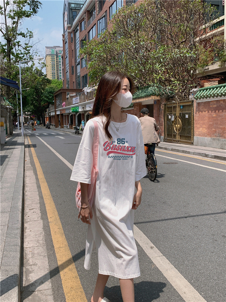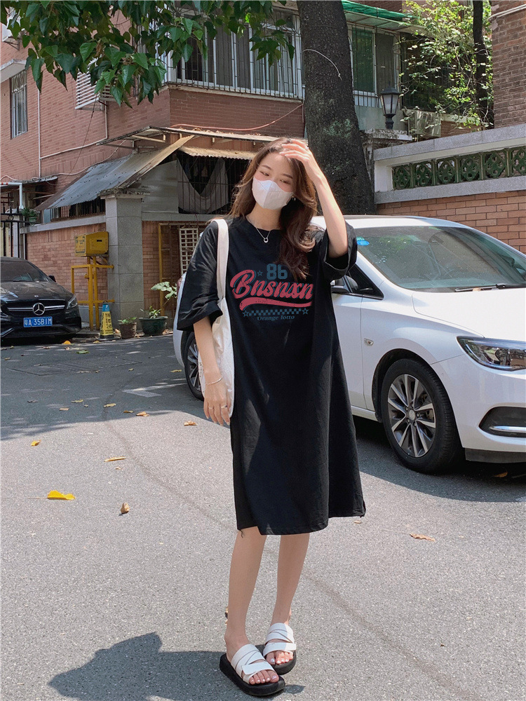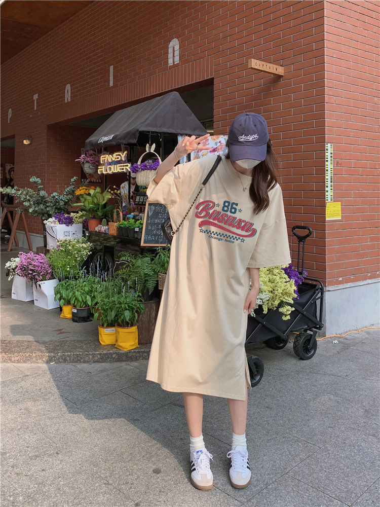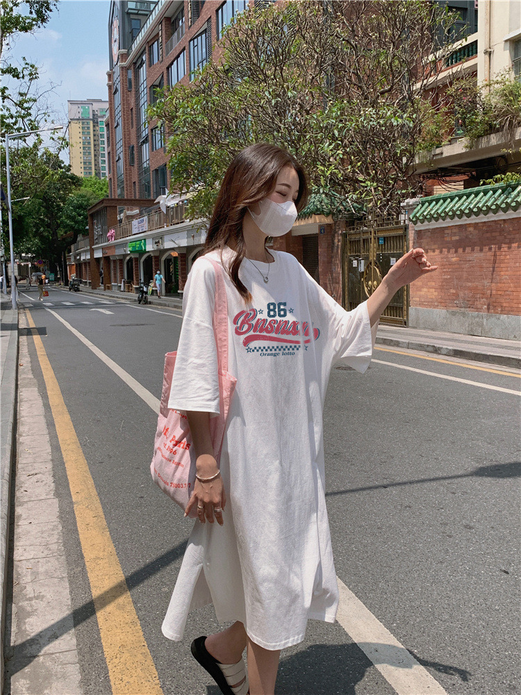 한국식 플러스 사이즈 느슨한 티셔츠 나이트드레스 여성 여름 유행 반팔 긴 무릎 쪼개진 육체 덮개 원피스스토어 가기