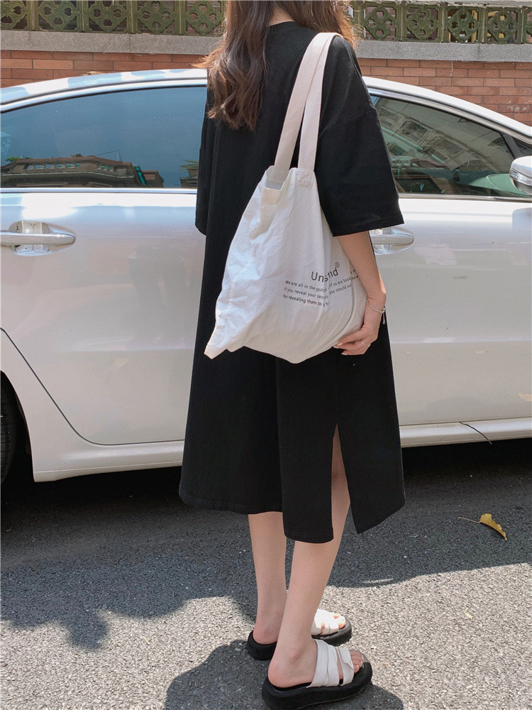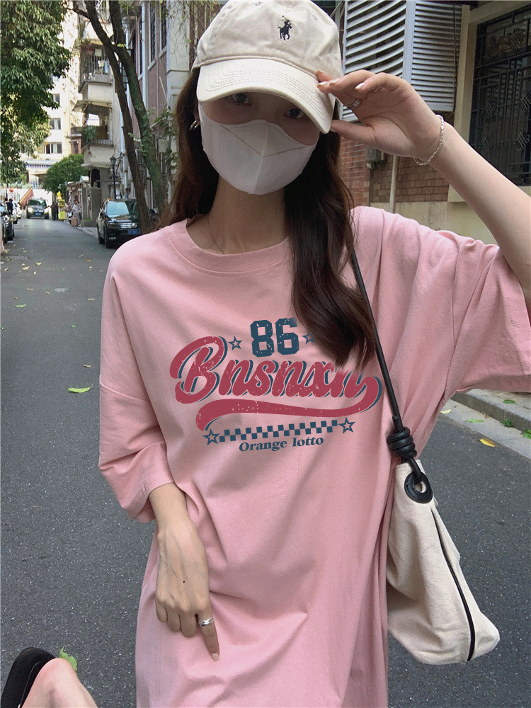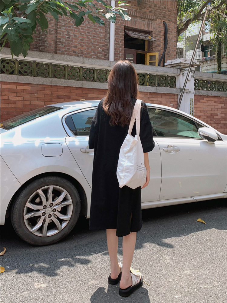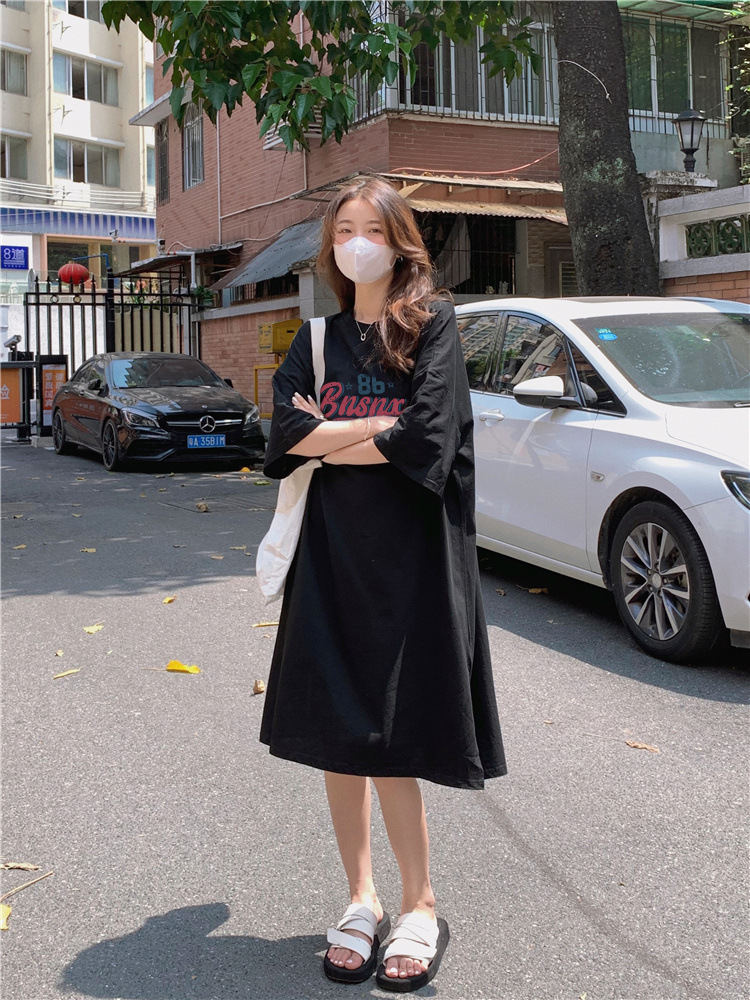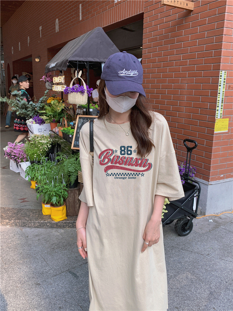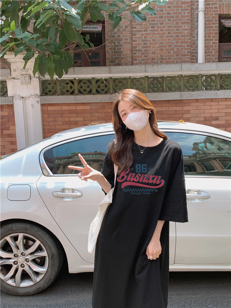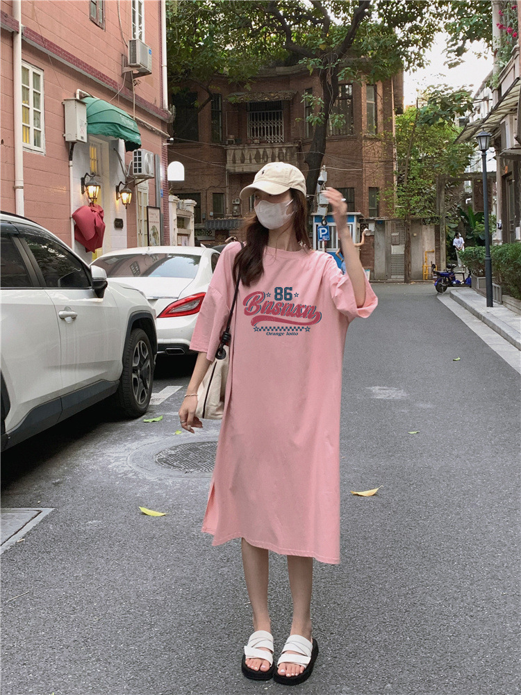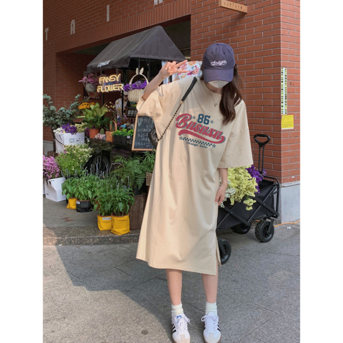 한국식 플러스 사이즈 느슨한 티셔츠 나이트드레스 여성 여름 유행 반팔 긴 무릎 쪼개진 육체 덮개 원피스스토어 가기