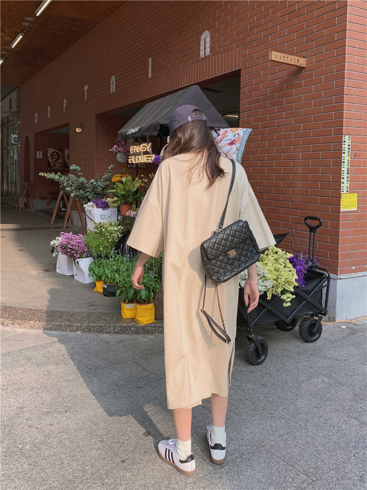 한국식 플러스 사이즈 느슨한 티셔츠 나이트드레스 여성 여름 유행 반팔 긴 무릎 쪼개진 육체 덮개 원피스