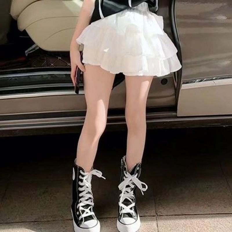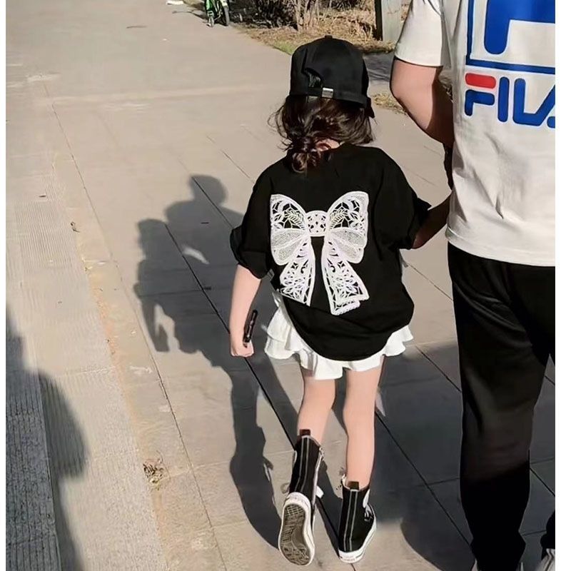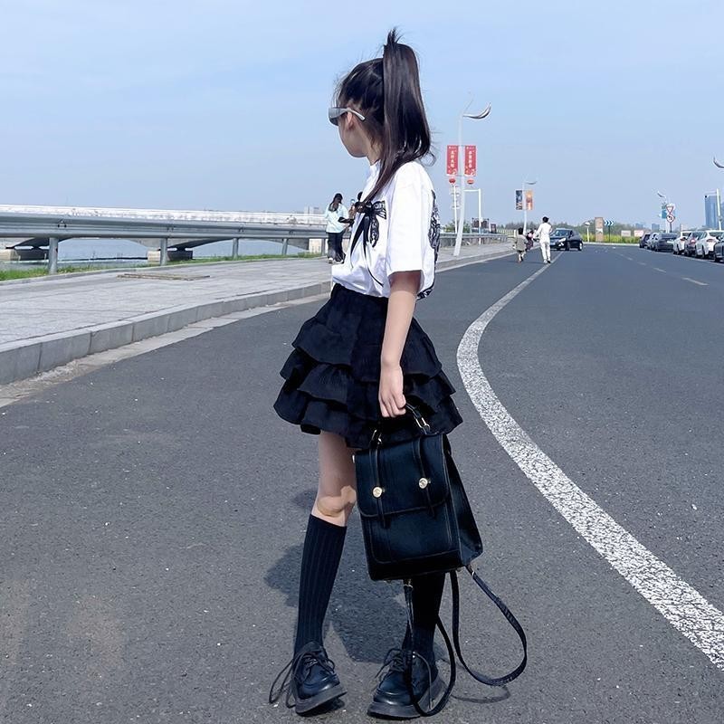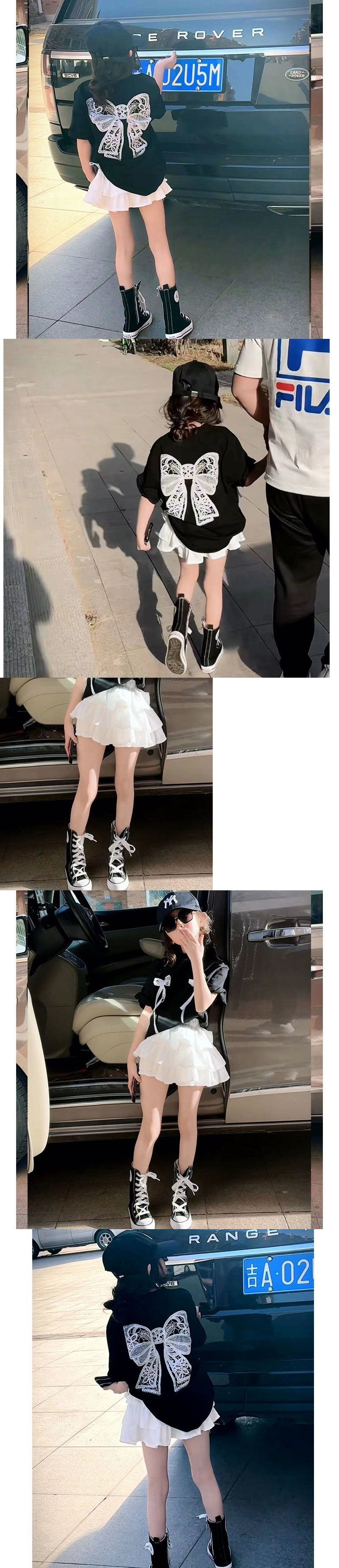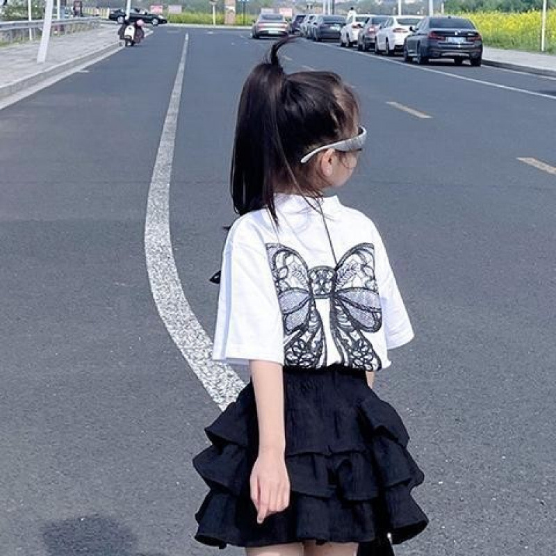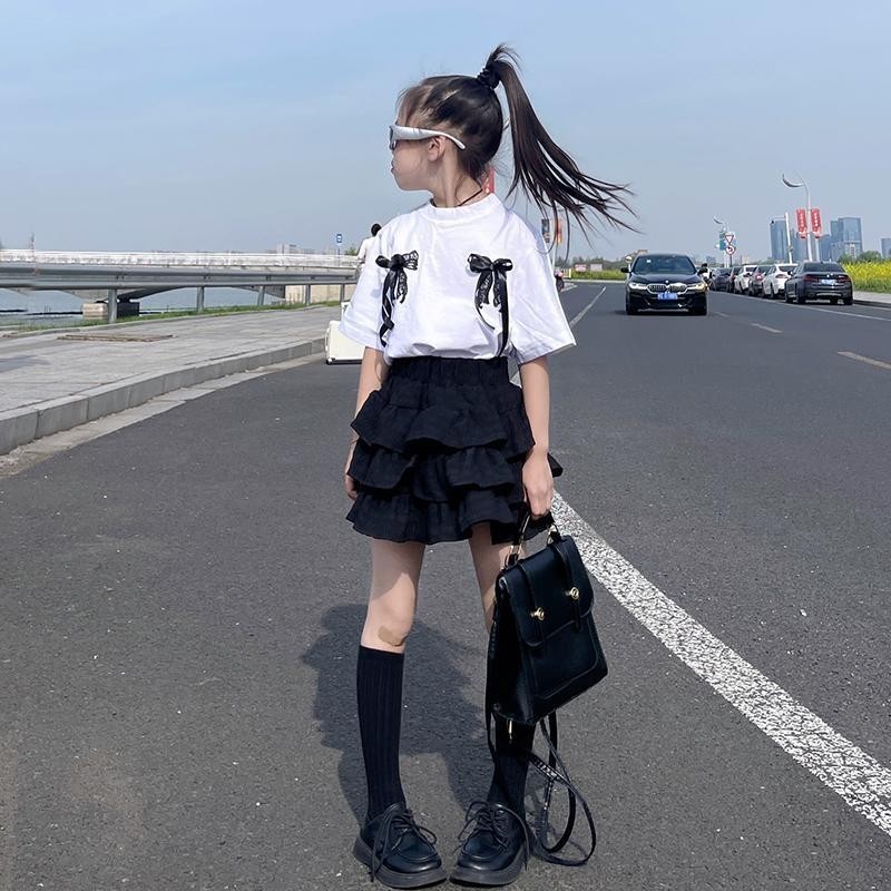 2025 여름 신예 소녀 한국 스타일 느슨한 나비 크루 넥 반팔 티셔츠 높은 허리 유행 케이크 스커트 투피스 세트스토어 가기