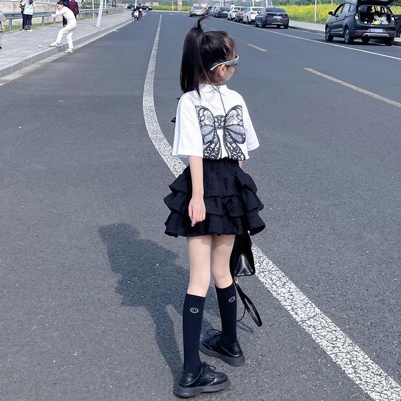 2025 여름 신예 소녀 한국 스타일 느슨한 나비 크루 넥 반팔 티셔츠 높은 허리 유행 케이크 스커트 투피스 세트