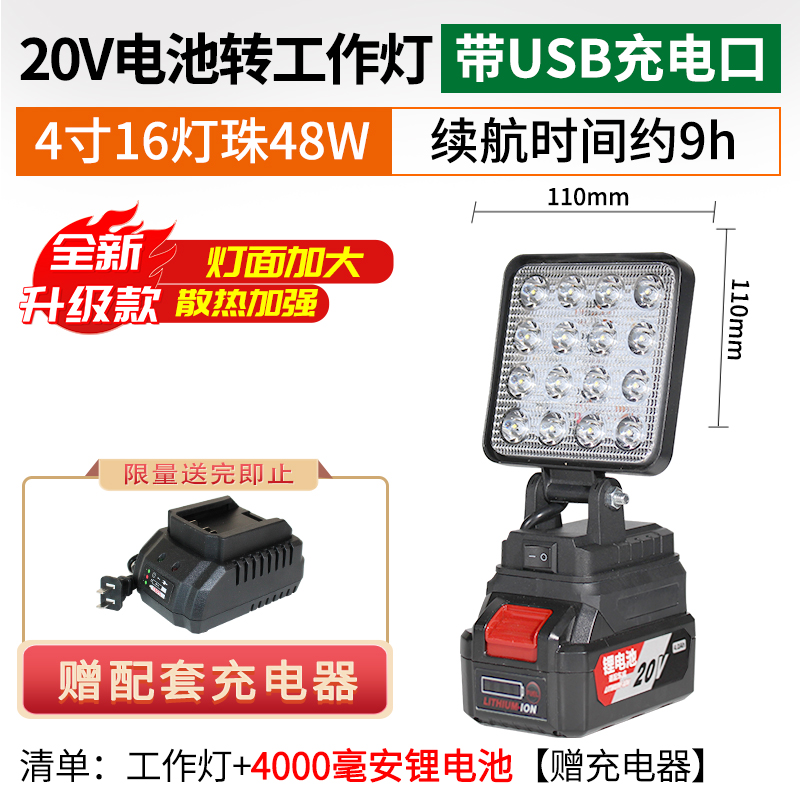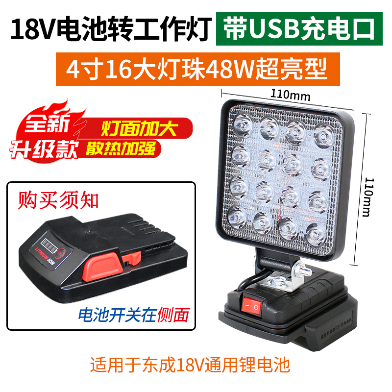 • 18V 4inch 업그레이드 버전 16 대형 램프 비드 작업등(USB 충전 포트 포함)