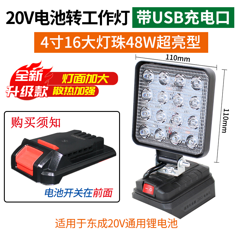 • 20V 4inch 업그레이드 버전 16 대형 램프 비드 작업등(USB 충전 포트 포함)