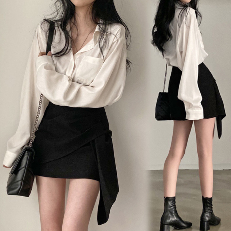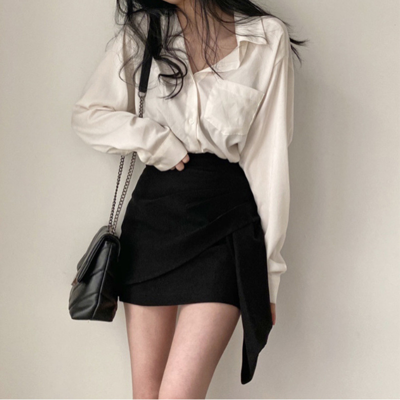 순수한 욕망 스타일 간단한 흰색 긴팔 외부 셔츠 가을 새로운 육체 커버 슬리밍 불규칙한 스커트 투피스 세트스토어 가기