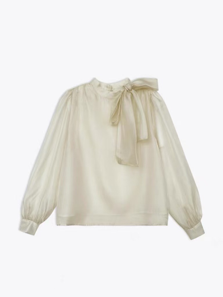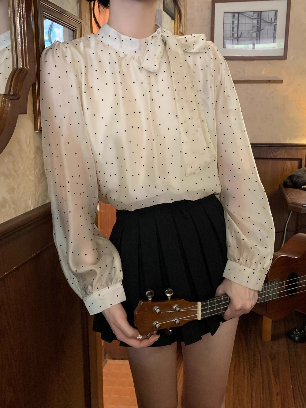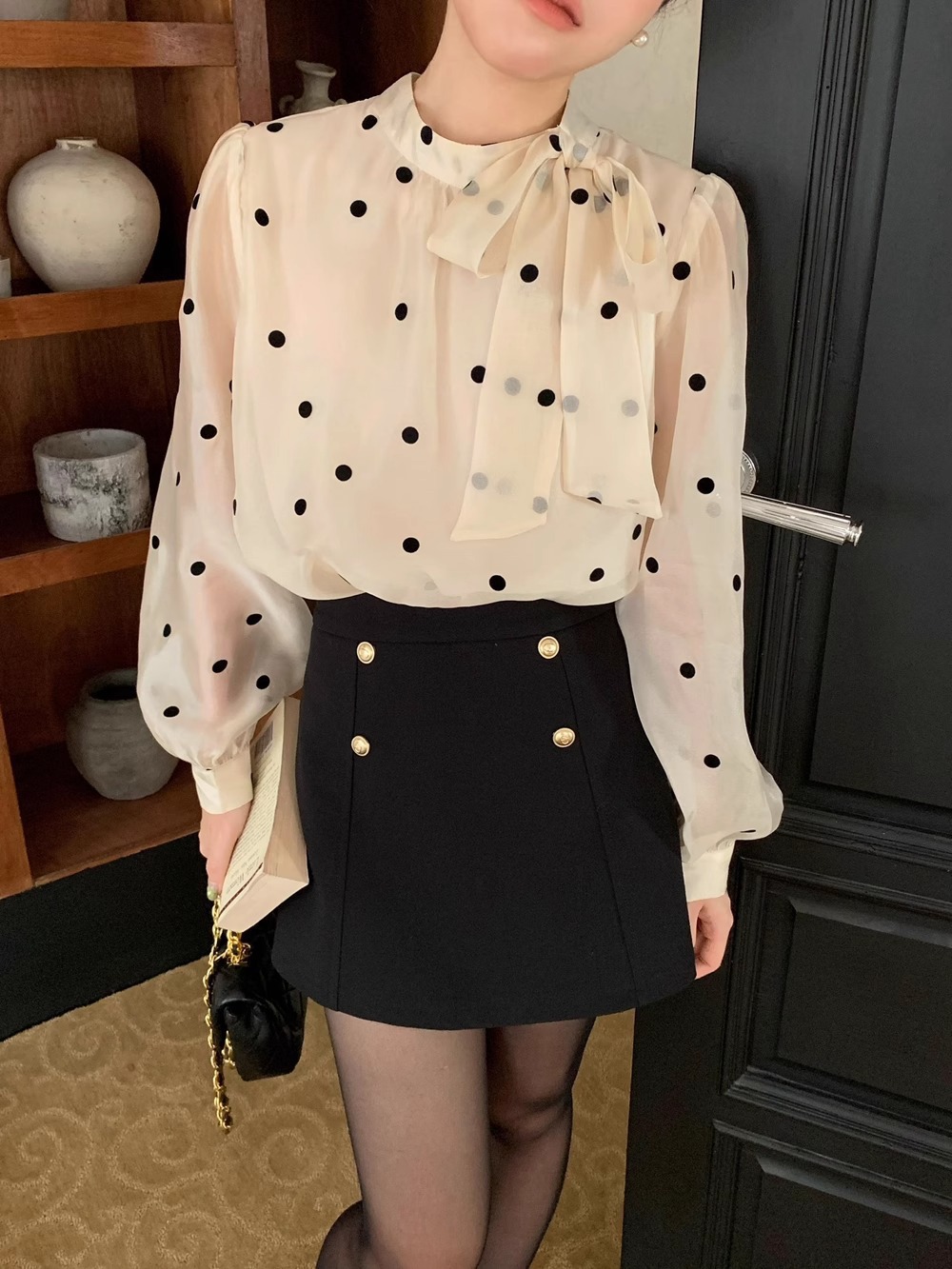 우아한 25 이른 봄 프랑스 달콤한 폴로 도트 탑 나비 타이 쉬폰 셔츠 긴 소매 셔츠스토어 가기