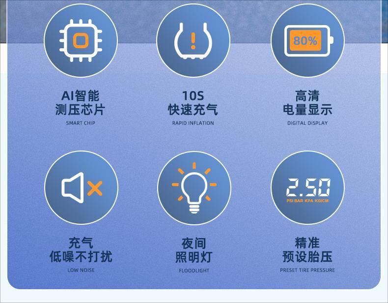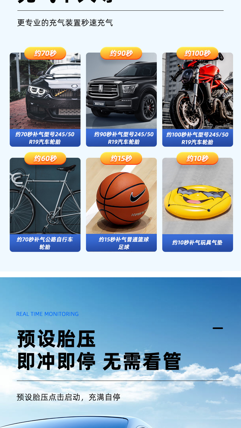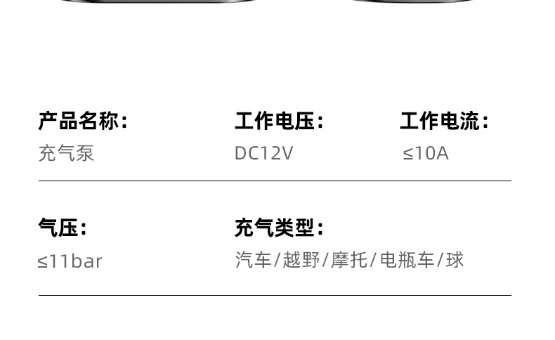 满电可打2条轮胎195/65R15 0~30 psi 充气时间:8-9min