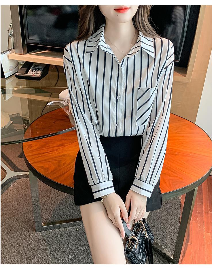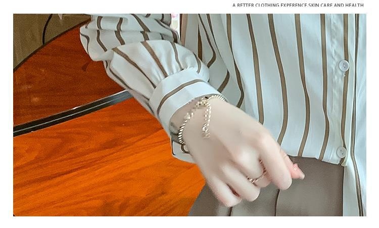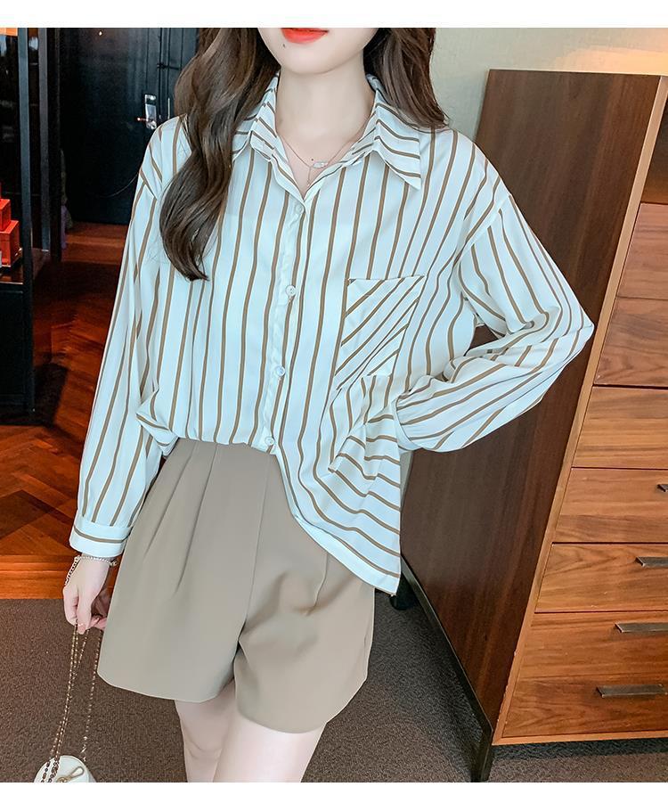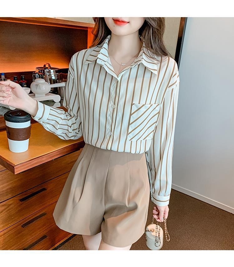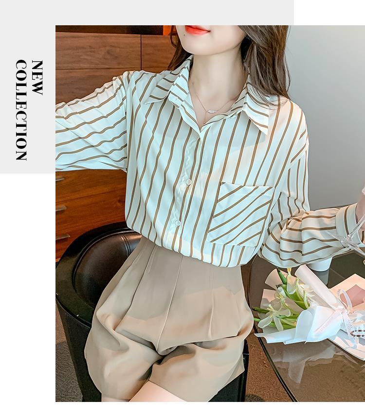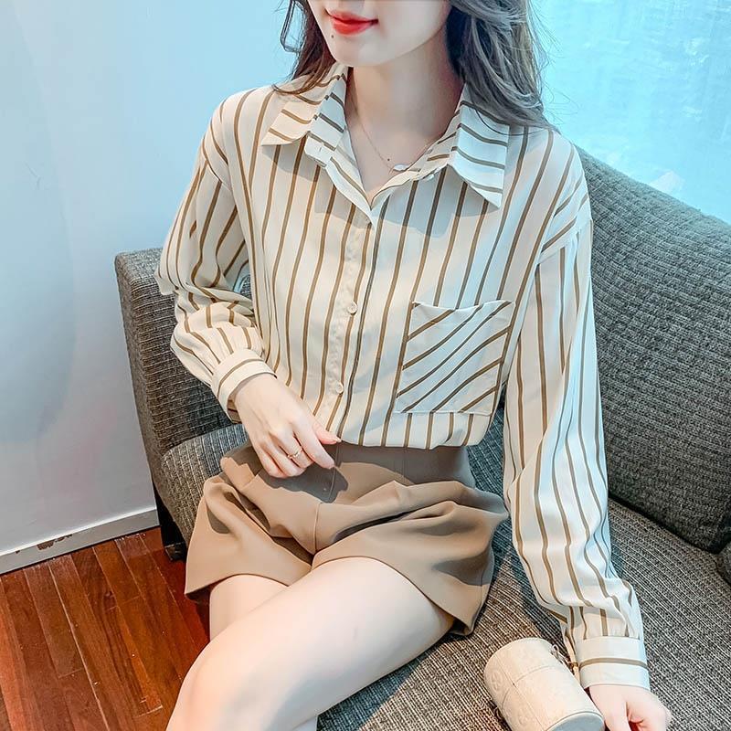 가을 새로운 스타일 폴로 칼라 긴 소매 줄무늬 쉬폰 셔츠 여성의 유행 연령 감소 느슨한 셔츠 최고 트렌디스토어 가기