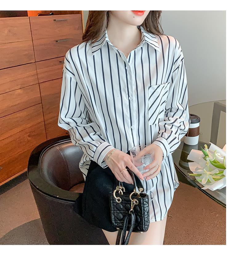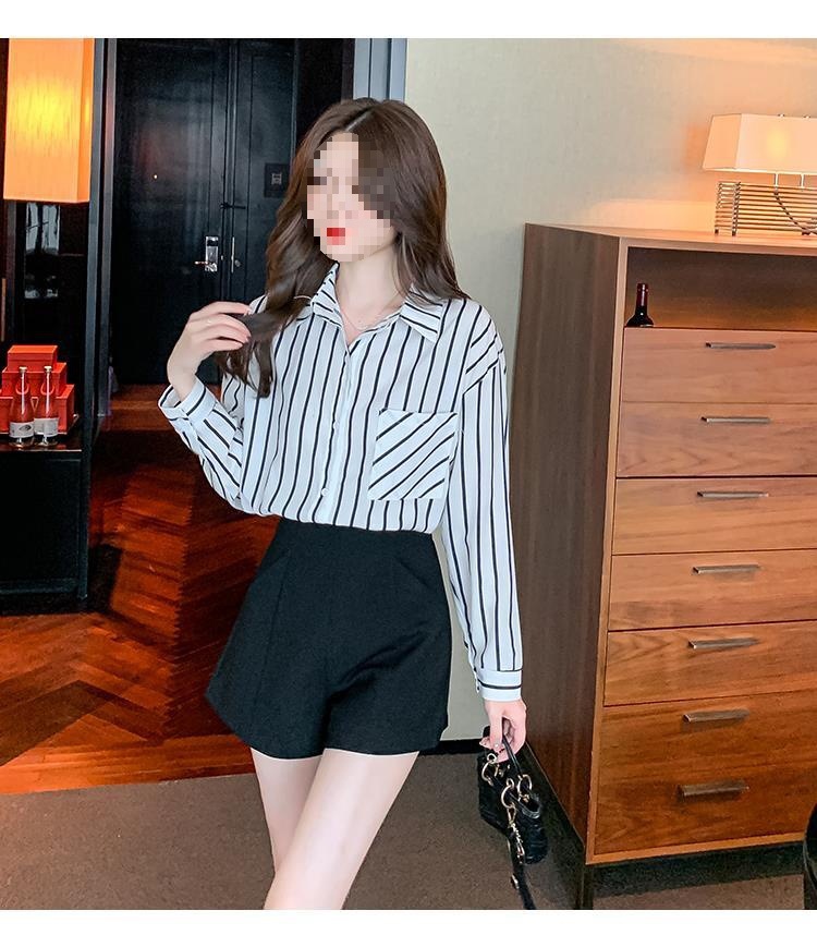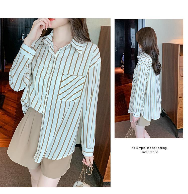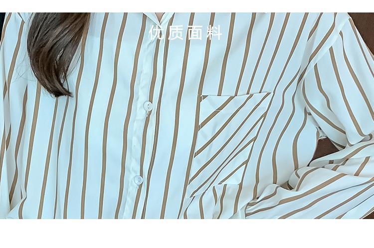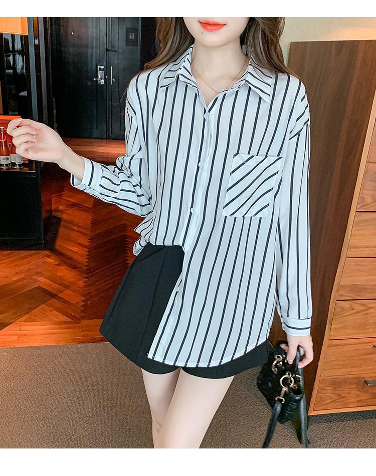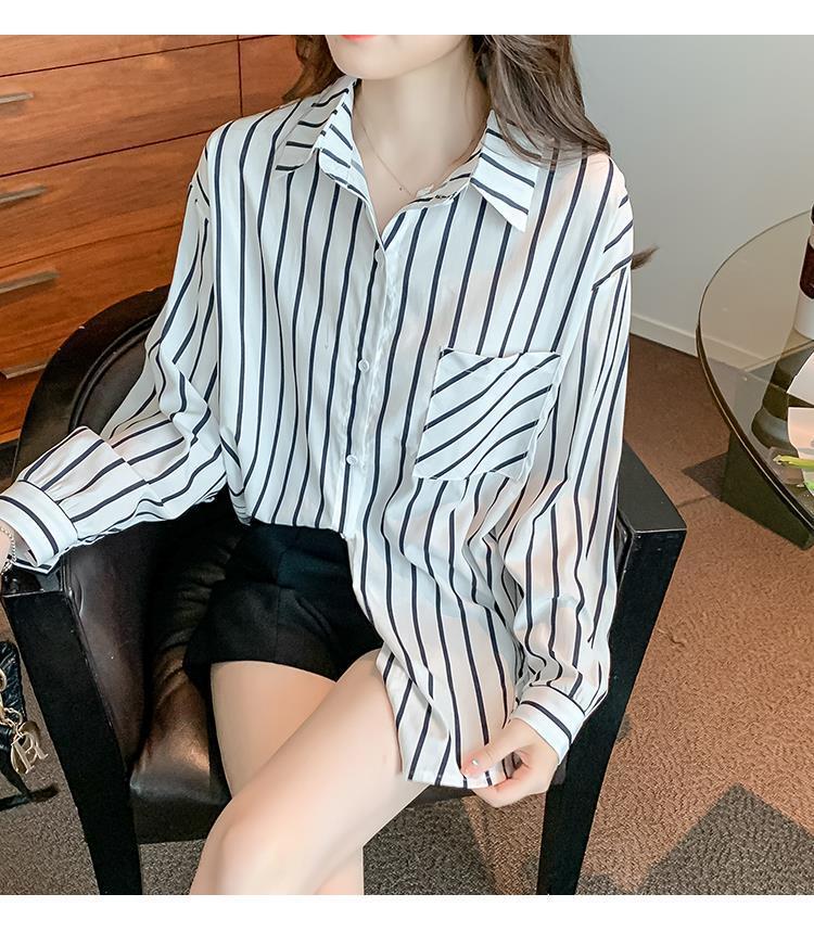 가을 새로운 스타일 폴로 칼라 긴 소매 줄무늬 쉬폰 셔츠 여성의 유행 연령 감소 느슨한 셔츠 최고 트렌디스토어 가기